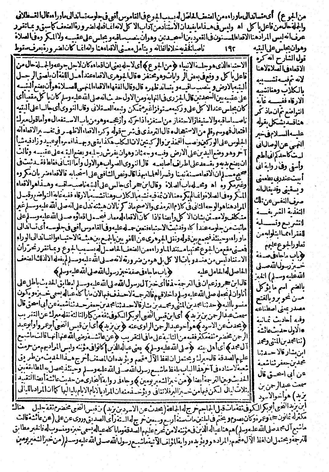 وَقِيلَ: الْمُرَادُ هُنَا هُوَ الْوَجْهُ الثَّانِي فِي كَلَامِ التِّرْمِذِيِّ، وَالْأَصَحُّ مَا ذَكَرْنَا ; لِأَنَّ هَيْئَتَهُ تَدُلُّ عَلَى أَنَّهُ صَلَّى اللَّهُ عَلَيْهِ وَسَلَّمَ، غَيْرُ مُتَكَلِّفٍ وَلَا مُعْتَنٍ بِشَأْنِ الْأَكْلِ، وَأَيْضًا فَإِذَا كَانَ الْإِقْعَاءُ لَهُ مَعَانٍ فَيُحْمَلُ إِقْعَاؤُهُ صَلَّى اللَّهُ عَلَيْهِ وَسَلَّمَ عَلَى مَا ثَبَتَ مِنْ جُلُوسِهِ عِنْدَ أَكْلِهِ، وَقَدْ ثَبَتَ الِاحْتِبَاءُ، فَتَعَيَّنَ حَمْلُهُ عَلَيْهِ، وَفِي الْقَامُوسِ أَقْعَى فِي جُلُوسِهِ، أَيْ تَسَانَدَ إِلَى مَا وَرَائَهُ، وَحِينَئِذٍ فَيُجْمَعُ بَيْنَ قَوْلِهِ وَنَقَلَ الْجَوْهَرِيُّ عَنِ اللُّغَوِيِّينَ بِالْجَمْعِ، بَيْنَ هَيْئَةِ الِاحْتِبَاءِ، وَالتَّسَانُدِ إِلَى الْوَرَاءِ، فَمَعْنَى مُقْعٍ مِنَ الْجُوعِ مُحْتَبِيًا، مُسْتَنِدًا لِمَا وَرَائَهُ مِنَ الضَّعْفِ الْحَاصِلِ لَهُ بِسَبَبِ الْجُوعِ، وَبِمَا تَقَرَّرَ، تَحَرَّرَ أَنَّ الِاسْتِنَادَ لَيْسَ مِنْ مَنْدُوبَاتِ الْأَكْلِ، بَلْ هُوَ مِنْ ضَرُورَاتِهِ ; لِأَنَّهُ صَلَّى اللَّهُ عَلَيْهِ وَسَلَّمَ لَمْ يَفْعَلْهُ إِلَّا لِذَلِكَ الضَّعْفِ الْحَاصِلِ لَهُ، الْحَامِلِ عَلَيْهِ.