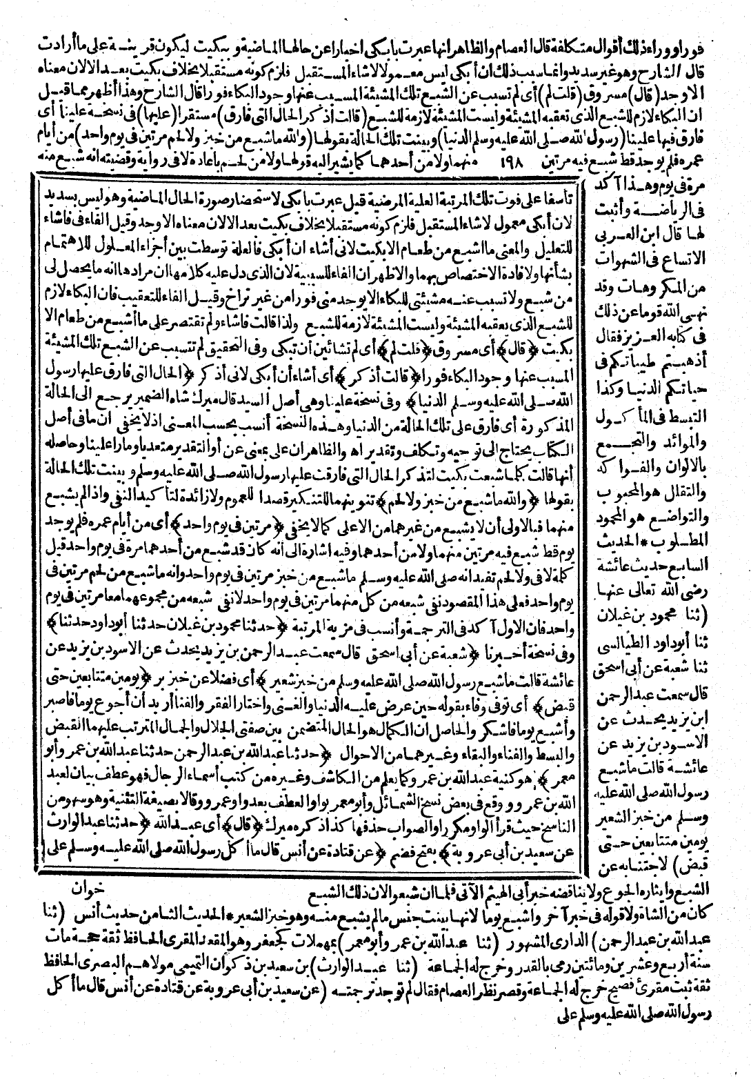 عُمْرِهِ، فَلَمْ يُوجَدْ يَوْمٌ قَطُّ شَبِعَ فِيهِ مَرَّتَيْنِ مِنْهُمَا، وَلَا مِنْ أَحَدِهِمَا، وَفِيهِ إِشَارَةٌ إِلَى أَنَّهُ كَانَ قَدْ شَبِعَ مِنْ أَحَدِهِمَا مَرَّةً فِي يَوْمٍ وَاحِدٍ، قِيلَ: كَلِمَةُ لَا فِي: «وَلَا لَحْمٍ» ، تُفِيدُ أَنَّهُ صَلَّى اللَّهُ عَلَيْهِ وَسَلَّمَ مَا شَبِعَ مِنْ خُبْزٍ مَرَّتَيْنِ فِي يَوْمٍ وَاحِدٍ وَأَنَّهُ مَا شَبِعَ مِنْ لَحْمٍ مَرَّتَيْنِ فِي يَوْمٍ وَاحِدٍ، فَعَلَى هَذَا: الْمَقْصُودُ نَفْيُ شِبَعِهِ مِنْ خُبْزٍ مَرَّتَيْنِ فِي يَوْمٍ وَاحِدٍ، وَأَنَّهُ مَا شَبِعَ مَنْ لَحْمٍ مَرَّتَيْنِ فِي يَوْمٍ وَاحِدٍ، لَا نَفْيُ شِبَعِهِ مِنْ مَجْمُوعِهِمَا مَعًا مَرَّتَيْنِ فِي يَوْمٍ وَاحِدٍ، فَإِنَّ الْأَوَّلَ آكَدُ فِي التَّرْجَمَةِ، وَأَنْسَبُ فِي مَزِيَّةِ الْمَرْتَبَةِ.