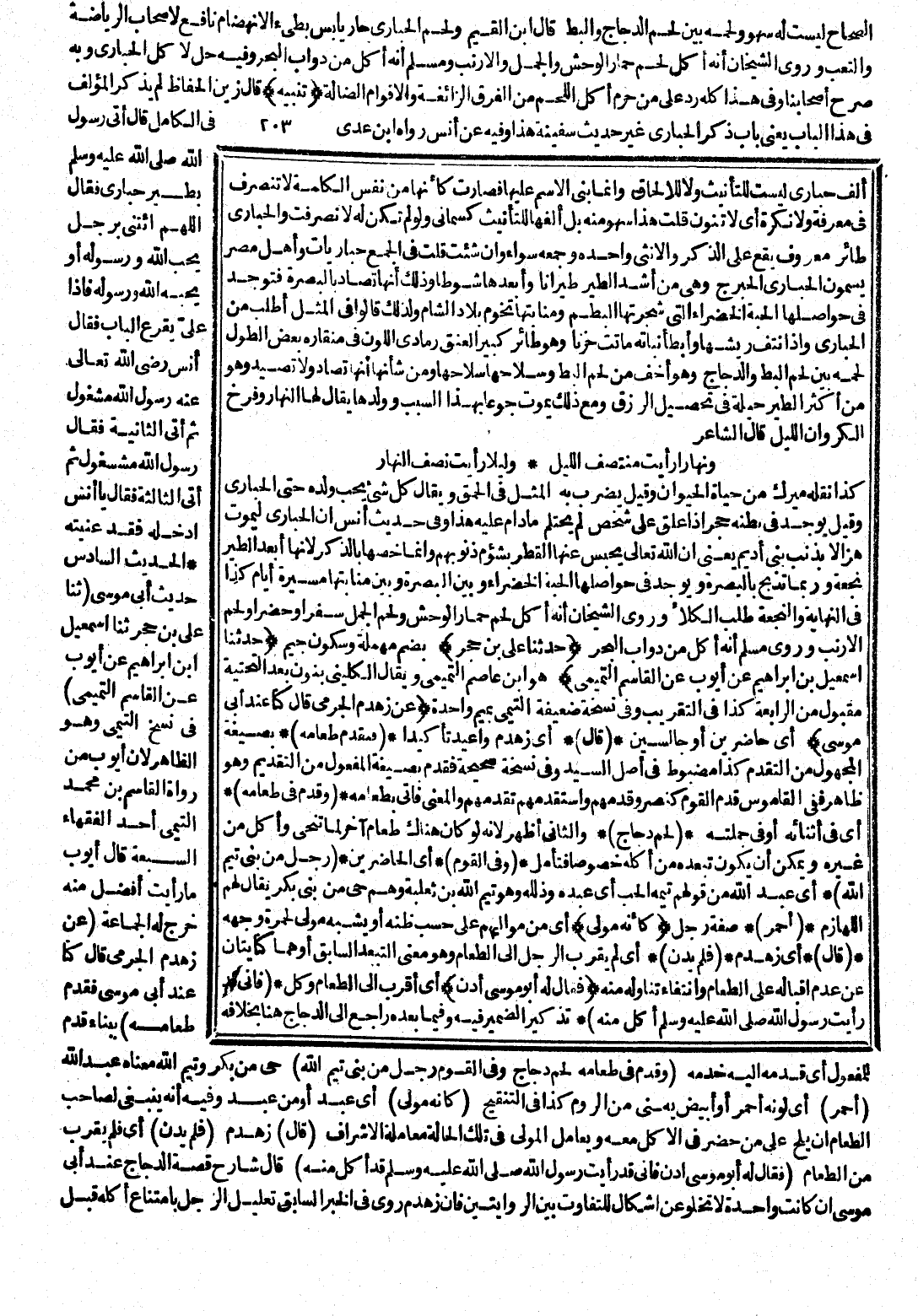 (حَدَّثَنَا عَلِيُّ بْنُ حُجْرٍ) بِضَمِّ مُهْمَلَةٍ وَسُكُونِ جِيمٍ (حَدَّثَنَا إِسْمَاعِيلُ بْنُ إِبْرَاهِيمَ عَنْ أَيُّوبَ عَنِ الْقَاسِمِ التَّمِيمِيِّ) هُوَ ابْنُ عَاصِمٍ التَّمِيمِيُّ وَيُقَالُ: الْكُلَيْنِيُّ بِنُونٍ بَعْدَ التَّحْتِيَّةِ، مَقْبُولٌ مِنَ الرَّابِعَةِ، كَذَا فِي التَّقْرِيبِ، وَفِي نُسْخَةٍ ضَعِيفَةٍ التَّيْمِيُّ بِمِيمٍ وَاحِدَةٍ (زَهْدَمِ الْجَرْمِيِّ قَالَ: كُنَّا عِنْدَ أَبِي مُوسَى) أَيْ حَاضِرِينَ أَوْ جَالِسِينَ (قَالَ) أَيْ: زَهْدَمُ وَأُعِيدَ تَأْكِيدًا (فَتُقُدِّمَ طَعَامُهُ) بِصِيغَةِ الْمَجْهُولِ مِنَ التَّقَدُّمِ، كَذَا مَضْبُوطٌ فِي أَصْلِ السَّيِّدِ، وَفِي نُسْخَةٍ صَحِيحَةٍ فَقَدَّمَ بِصِيغَةِ الْمَفْعُولِ مِنَ التَّقْدِيمِ، وَهُوَ ظَاهِرٌ، فَفِي الْقَامُوسِ قَدَمَ الْقَوْمَ كَنَصَرَ وَقَدَّمَهُمْ وَاسْتَقْدَمَهُمْ، تَقَدَّمَهُمْ وَالْمَعْنَى فَأُتِيَ بِطَعَامِهِ (وَقُدِّمَ فِي طَعَامِهِ) أَيْ فِي أَثْنَائِهِ أَوْ فِي جُمْلَتِهِ (لَحْمُ دَجَاجٍ) وَالثَّانِي أَظْهَرُ ; لِأَنَّهُ لَوْ كَانَ هُنَاكَ طَعَامٌ آخَرُ لَمَا تَنَحَّى، وَأَكَلَ مِنْ غَيْرِهِ، وَيُمْكِنُ أَنْ يَكُونَ تَبَعُّدُهُ مِنْ أَكْلِهِ خُصُوصًا فَتَأَمَّلْ (وَفِي الْقَوْمِ) أَيِ الْحَاضِرِينَ (رَجُلٌ مِنْ بَنِي تَيْمِ اللَّهِ) أَيْ عَبْدِ اللَّهِ مِنْ قَوْلِهِمْ تَيَّمَهُ الْحُبُّ أَيْ عَبَّدَهُ وَذَلَّلَهُ، وَهُوَ تَيْمُ اللَّهِ بْنُ ثَعْلَبَةَ، وَهُمْ حَيٌّ مِنْ بَنِي بَكْرٍ يُقَالُ لَهُمُ اللَّهَازِمُ (أَحْمَرُ) صِفَةُ رَجُلٍ (كَأَنَّهُ مَوْلَى) أَيْ مِنْ مَوَالِيهِمْ عَلَى حَسَبِ ظَنِّهِ، أَوْ يُشْبِهُ مَوْلًى لِحُمْرَةِ وَجْهِهِ (قَالَ) أَيْ زَهْدَمُ (فَلَمْ يَدْنُ) أَيْ لَمْ يَقْرُبِ الرَّجُلُ إِلَى الطَّعَامِ، وَهُوَ مَعْنَى التَّبَعُّدِ السَّابِقِ، أَوْ هُمَا كِنَايَتَانِ عَنْ عَدَمِ إِقْبَالِهِ عَلَى الطَّعَامِ، وَانْتِفَاءِ تَنَاوُلِهِ مِنْهُ (فَقَالَ لَهُ أَبُو مُوسَى: (ادْنُ) أَيِ اقْرُبْ إِلَى الطَّعَامِ، وَكُلْ (فَإِنِّي رَأَيْتُ رَسُولَ اللَّهِ صَلَّى اللَّهُ عَلَيْهِ وَسَلَّمَ أَكَلَ مِنْهُ) تَذْكِيرُ الضَّمِيرِ فِيهِ وَفِيمَا بَعْدَهُ رَاجِعٌ إِلَى الدَّجَاجِ هُنَا، بِخِلَافِهِ