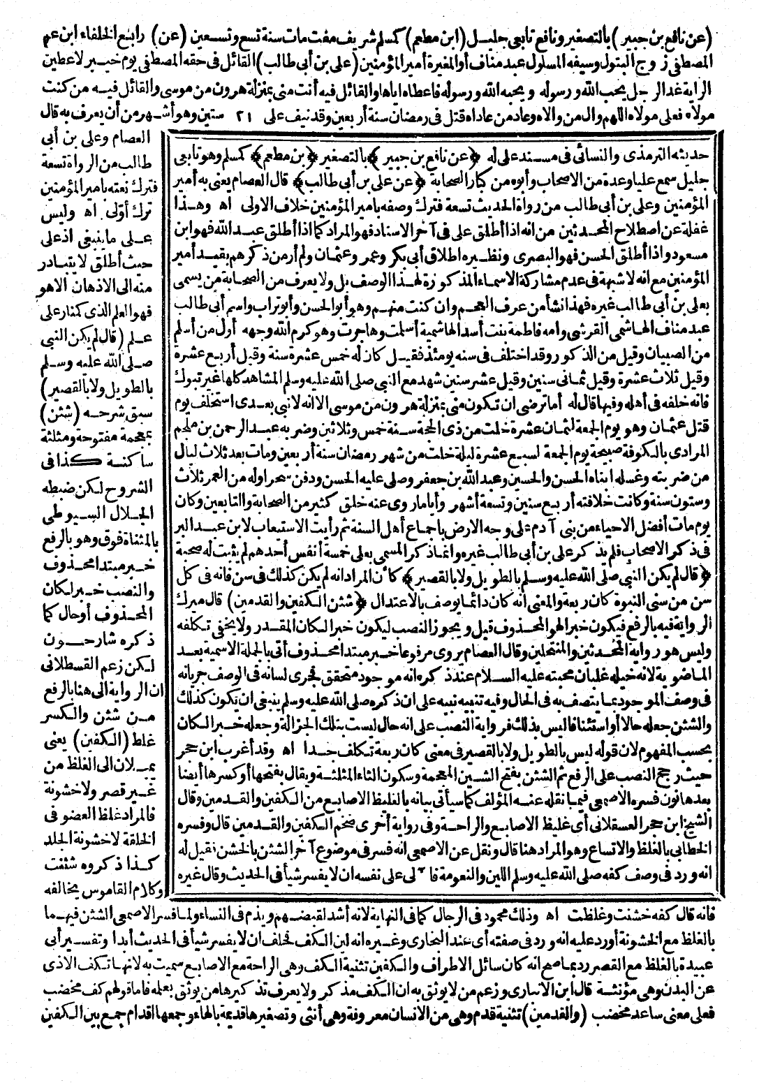 حَدِيثَهُ التِّرْمِذِيُّ وَالنَّسَائِيُّ فِي مُسْنَدِ عَلِيٍّ لَهُ. (عَنْ نَافِعِ بْنِ جُبَيْرِ) : بِالتَّصْغِيرِ. (بْنِ مُطْعِمٍ) : كَمُسْلِمٍ وَهُوَ تَابِعِيٌّ جَلِيلٌ، سَمِعَ عَلِيًّا وَعِدَّةً مِنَ الْأَصْحَابِ، وَأَبَوْهُ مِنْ كِبَارِ الصَّحَابَةِ. (عَنْ عَلِيِّ بْنِ أَبِي طَالِبٍ) : قَالَ الْعِصَامُ: يَعْنِي بِهِ أَمِيرَ الْمُؤْمِنِينَ، وَعَلِيُّ بْنُ أَبِي طَالِبٍ مِنْ رُوَاةِ الْحَدِيثِ تِسْعَةٌ، فَتَرْكُ وَصْفِهِ بِأَمِيرِ الْمُؤْمِنِينَ خِلَافُ الْأَوْلَى، انْتَهَى. وَهَذَا غَفْلَةٌ عَنِ اصْطِلَاحِ الْمُحَدِّثِينَ مِنْ أَنَّهُ إِذَا أُطْلِقَ عَلِيٌّ فِي آخِرِ الْإِسْنَادِ فَهُوَ الْمُرَادُ كَمَا إِذَا أُطْلَقَ عَبْدُ اللَّهِ فَهُوَ ابْنُ مَسْعُودٍ، وَإِذَا أُطْلِقَ الْحَسَنُ فَهُوَ الْبَصْرِيُّ، وَنَظِيرُهُ إِطْلَاقُ أَبِي بَكْرٍ وَعُمَرَ وَعُثْمَانَ، وَلَمْ أَرَ مَنْ ذَكَرَهُمْ بِقَيْدِ الْمُؤْمِنِينَ مَعَ أَنَّهُ لَا شُبْهَةَ فِي عَدَمِ مُشَارَكَةِ الْأَسْمَاءِ الْمَذْكُورَةِ لِهَذَا الْوَصْفِ بَلْ وَلَا يُعْرَفُ مِنَ الصَّحَابَةِ مَنْ يُسَمَّى بِعَلِيِّ بْنِ أَبِي طَالِبٍ غَيْرُهُ، فَهَذَا نِشَأَ مِنْ عِرْقِ الْعَجَمِ - وَإِنْ كُنْتُ مِنْهُمْ - وَهُوَ أَبُو الْحَسَنِ وَأَبُو تُرَابٍ، وَاسْمُ أَبِي طَالِبٍ عَبْدُ مَنَافٍ الْهَاشِمِيُّ الْقُرَشِيُّ، وَأُمُّهُ فَاطِمَةُ بِنْتُ أَسَدٍ الْهَاشِمِيَّةُ أَسْلَمَتْ وَهَاجَرَتْ، وَهُوَ كَرَّمَ اللَّهُ وَجْهَهُ أَوَّلُ مَنْ أَسْلَمَ مِنَ الصِّبْيَانِ وَقِيلَ مِنَ الذُّكُورِ، وَقَدِ اخْتُلِفَ فِي سِنِّهِ يَوْمَئِذٍ فَقِيلَ كَانَ لَهُ خَمْسَ عَشْرَةَ وَقِيلَ أَرْبَعَ عَشْرَةَ وَقِيلَ ثَلَاثَ عَشْرَةَ