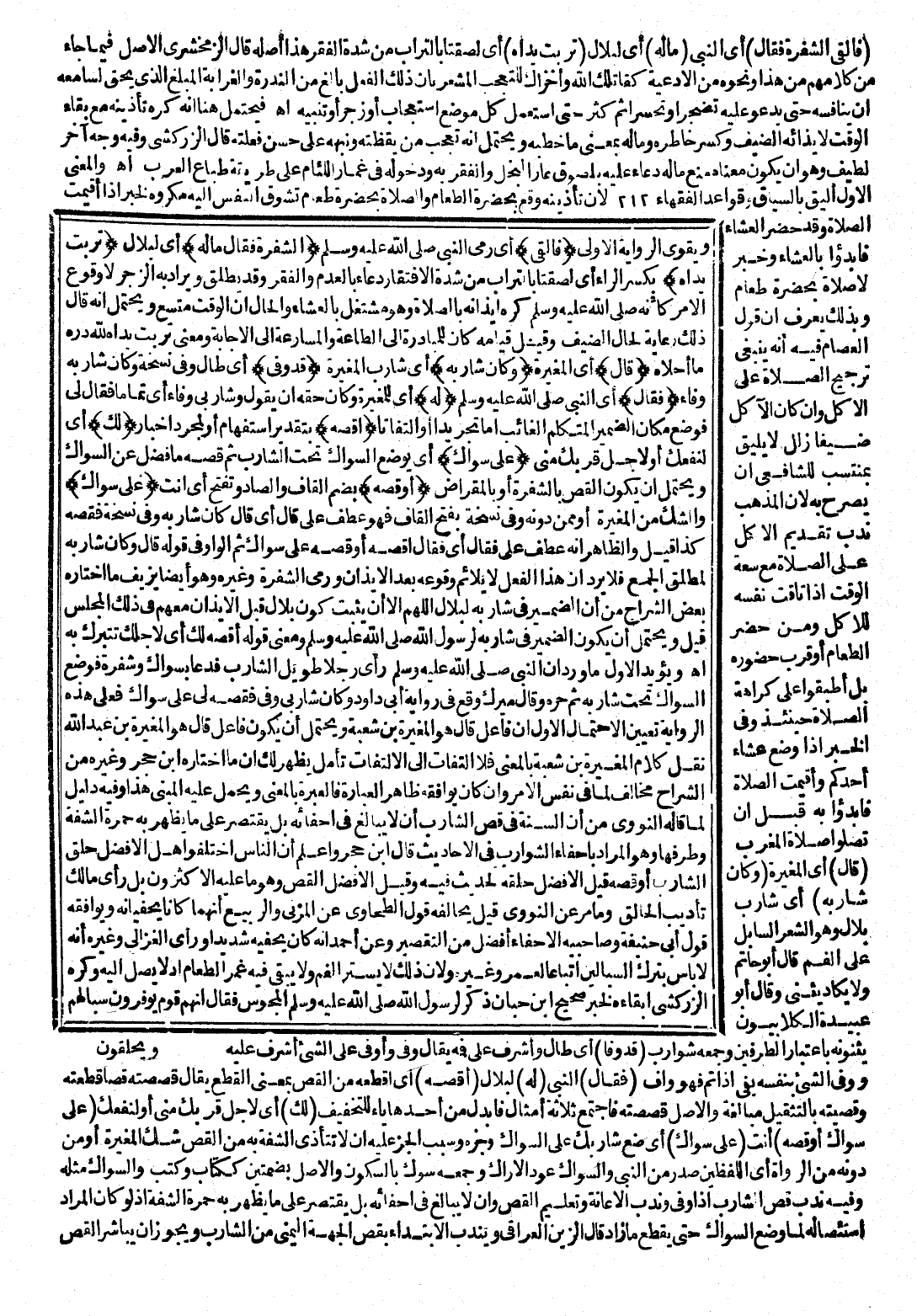 وَيُقَوِّي الرِّوَايَةَ الْأُولَى (فَأَلْقَى) أَيْ رَمَى النَّبِيُّ صَلَّى اللَّهُ عَلَيْهِ وَسَلَّمَ (الشَّفْرَةَ فَقَالَ لَهُ) أَيْ لِبِلَالٍ (تَرِبَتْ يَدَاهُ) بِكَسْرِ الرَّاءِ أَيْ لَصِقَتَا بِالتُّرَابِ، مِنْ شِدَّةِ الِافْتِقَارِ دَعَاءٌ بِالْعَدَمِ وَالْفَقْرِ، وَقَدْ يُطْلَقُ وَيُرَادُ بِهِ الزَّجْرُ، لَا وُقُوعَ الْأَمْرِ، كَأَنَّهُ صَلَّى اللَّهُ عَلَيْهِ وَسَلَّمَ كَرِهَ إِيذَانَهُ بِالصَّلَاةِ، وَهُوَ مُشْتَغِلٌ بِالْعَشَاءِ، وَالْحَالُ أَنَّ الْوَقْتَ مُتَّسِعٌ وَيُحْتَمَلُ أَنَّهُ قَالَ ذَلِكَ رِعَايَةً لِحَالِ الضَّيْفِ، وَقِيلَ: قِيَامُهُ كَانَ لِلْمُبَادَرَةِ إِلَى الطَّاعَةِ، وَالْمُسَارَعَةِ إِلَى الْإِجَابَةِ، وَمَعْنَى تَرِبَتْ يَدَاهُ، لِلَّهِ دَرُّهُ مَا أَحْلَاهُ (قَالَ) أَيْ لِلْمُغِيرَةِ (وَكَانَ شَارِبُهُ) أَيْ شَارِبُ الْمُغِيرَةِ (قَدْ وَفَى) أَيْ طَالَ، وَفِي نُسْخَةٍ وَكَانَ شَارِبُهُ وَفَاءً (فَقَالَ) أَيِ النَّبِيُّ صَلَّى اللَّهُ عَلَيْهِ وَسَلَّمَ (لَهُ) أَيْ لِلْمُغِيرَةِ، وَكَانَ حَقُّهُ أَنْ يَقُولَ وَشَارِبِي وَفَاءً أَيْ تَمَامًا، فَقَالَ لِي فَوَضَعَ مَكَانَ الضَّمِيرِ الْمُتَكَلِّمِ الْغَائِبَ، إِمَّا تَجْرِيدًا أَوِ الْتِفَاتًا (أَقُصُّهُ) بِتَقْدِيرِ اسْتِفْهَامٍ أَوْ لِمُجَرَّدِ إِخْبَارٍ (لَكَ) أَيْ لِنَفْعِكَ أَوْ لِأَجْلِ قُرْبِكَ مِنِّي (عَلَى سِوَاكٍ) أَيْ يُوضَعُ السِّوَاكُ تَحْتَ الشَّارِبِ، ثُمَّ قَصَّهُ مَا فَضَلَ عَنِ السِّوَاكِ، وَيُحْتَمَلُ أَنْ يَكُونَ الْقَصُّ بِالشَّفْرَةِ أَوْ بِالْمِقْرَاضِ (أَوْ قُصُّهُ) بِضَمِّ الْقَافِ وَالصَّادِ وَتُفْتَحُ أَيْ أَنْتَ (عَلَى سِوَاكٍ) وَالشَّكُّ