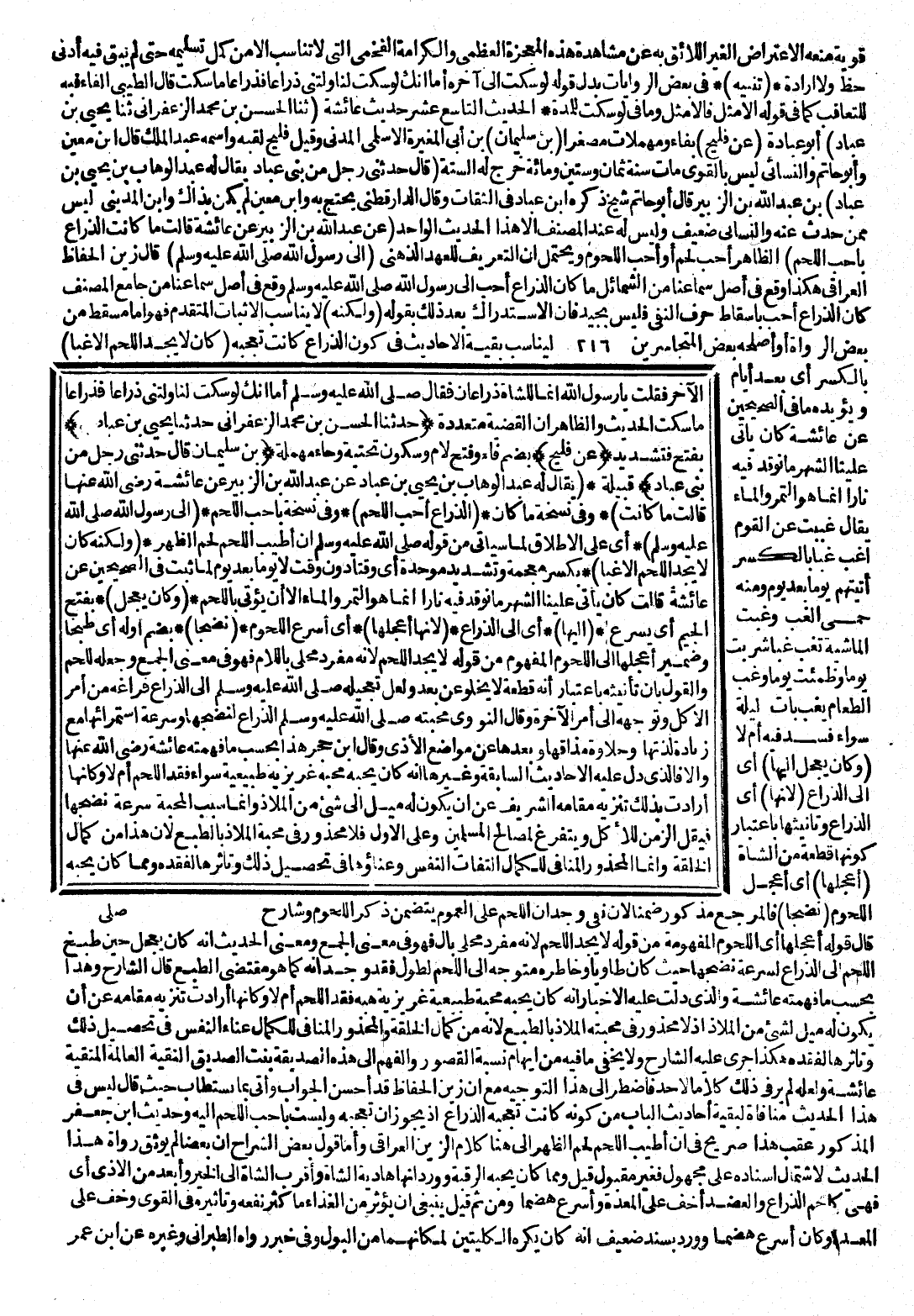 (حَدَّثَنَا الْحَسَنُ بْنُ مُحَمَّدٍ الزَّعْفَرَانِيُّ، حَدَّثَنَا يَحْيَى بْنُ عَبَّادٍ) بِفَتْحٍ فَتَشْدِيدٍ (عَنْ فُلَيْحِ) بِضَمِّ فَاءٍ وَفَتْحِ لَامٍ وَسُكُونِ تَحْتِيَّةٍ وَحَاءٍ مُهْمَلَةٍ (بْنِ سُلَيْمَانَ قَالَ حَدَّثَنِي رَجُلٌ مِنْ بَنِي عَبَّادٍ) قَبِيلَةٌ (يُقَالُ لَهُ عَبْدُ الْوَهَّابِ بْنُ يَحْيَى بْنِ عَبَّادٍ، عَنْ عَبْدِ اللَّهِ بْنِ الزُّبَيْرِ، عَنْ عَائِشَةَ رَضِيَ اللَّهُ عَنْهَا، قَالَتْ: مَا كَانَتِ) وَفِي نُسْخَةٍ مَا كَانَ (الذِّرَاعُ أَحَبَّ اللَّحْمِ) وَفِي نُسْخَةٍ بِأَحَبِّ اللَّحْمِ (إِلَى رَسُولِ اللَّهِ صَلَّى اللَّهُ عَلَيْهِ وَسَلَّمَ) أَيْ عَلَى الْإِطْلَاقِ لِمَا سَيَأْتِي مِنْ قَوْلِهِ صَلَّى اللَّهُ عَلَيْهِ وَسَلَّمَ: إِنَّ أَطْيَبَ اللَّحْمِ لَحْمُ الظَّهْرِ (وَلَكِنَّهُ كَانَ لَا يَجِدُ اللَّحْمَ إِلَّا غِبًّا) بِكَسْرِ مُعْجَمَةٍ وَتَشْدِيدِ مُوَحَّدَةٍ أَيْ وَقْتًا دُونَ وَقْتٍ، لَا يَوْمًا بَعْدَ يَوْمٍ، لِمَا ثَبَتَ فِي الصَّحِيحَيْنِ عَنْ عَائِشَةَ قَالَتْ: كَانَ يَأْتِي عَلَيْنَا الشَّهْرُ مَا نُوقِدُ فِيهِ نَارًا، إِنَّمَا هُوَ التَّمْرُ وَالْمَاءُ إِلَّا أَنْ يُؤْتَى بِاللَّحْمِ.