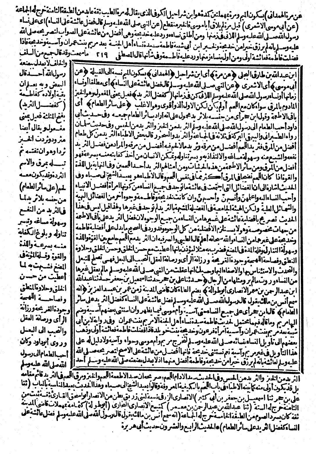 زَمَنَ عُمَرَ بْنِ عَبْدِ الْعَزِيزِ (أَنَّهُ سَمِعَ أَنَسَ بْنَ مَالِكٍ يَقُولُ: قَالَ رَسُولُ اللَّهِ صَلَّى اللَّهُ عَلَيْهِ وَسَلَّمَ: فَضْلُ عَائِشَةَ عَلَى النِّسَاءِ، كَفَضْلِ الثَّرِيدِ عَلَى سَائِرِ الطَّعَامِ) قَالَ ابْنُ حَجَرٍ: أَيْ عَلَى جَمِيعِ النِّسَاءِ حَتَّى آسِيَةَ، وَأُمِّ مُوسَى، فِيمَا يَظْهَرُ، وَإِنِ اسْتَثْنَى بَعْضُهُمْ آسِيَةَ وَضَمَّ إِلَيْهَا مَرْيَمَ، وَمَا قَالَهُ فِيهِمَا مُحْتَمِلٌ لِحَدِيثِ: فَاطِمَةُ سَيِّدَةُ نِسَاءِ أَهْلِ الْجَنَّةِ، إِلَّا مَرْيَمَ بِنْتَ عِمْرَانَ.