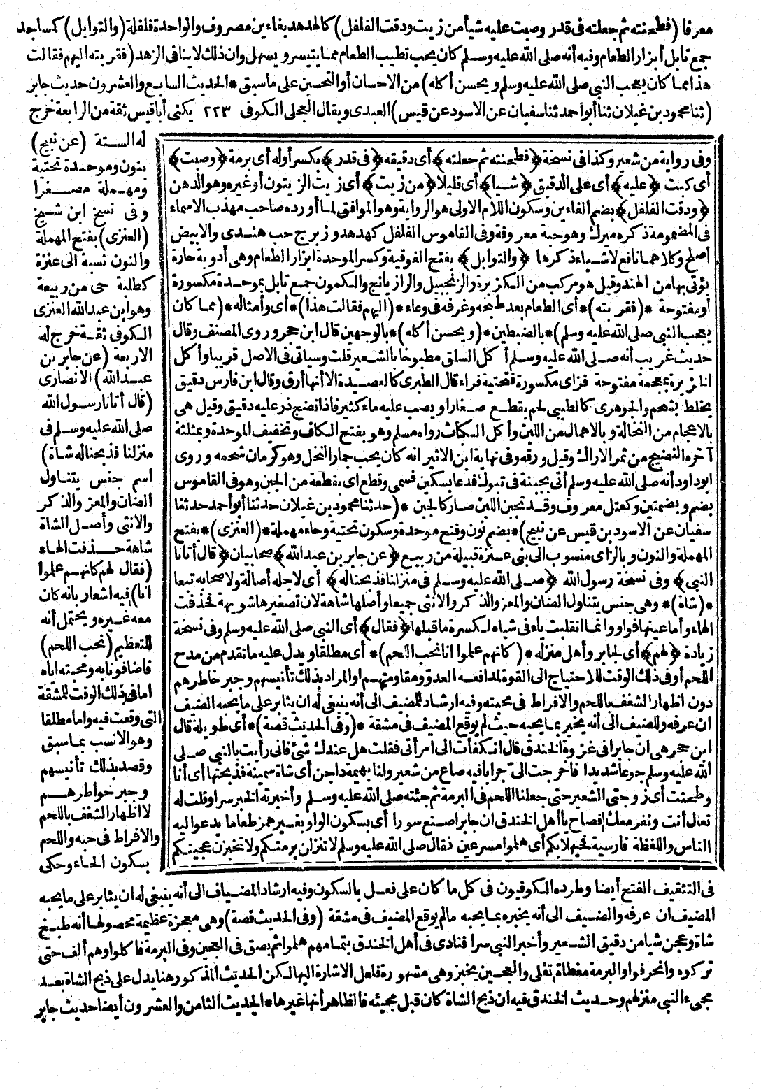 الْمُهْمَلَةِ وَالنُّونِ، وَبِالزَّايِ مَنْسُوبٌ إِلَى بَنِي عَنَزَةَ، قَبِيلَةٌ مِنْ رَبِيعٍ (عَنْ جَابِرِ بْنِ عَبْدِ اللَّهِ) صَحَابِيَّانِ (قَالَ: أَتَانَا النَّبِيُّ) وَفِي نُسْخَةٍ: رَسُولُ اللَّهِ (صَلَّى اللَّهُ عَلَيْهِ وَسَلَّمَ فِي مَنْزِلِنَا فَذَبَحْنَا لَهُ) أَيْ لِأَجْلِهِ أَصَالَةً وَلِأَصْحَابِهِ تَبَعًا (شَاةً) وَهِيَ جِنْسٌ يَتَنَاوَلُ الضَّأْنَ وَالْمَعِزَ، وَالذَّكَرَ وَالْأُنْثَى جَمِيعًا، وَأَصْلُهَا شَاهَةٌ ; لِأَنَّ تَصْغِيرَهَا شُوَيْهَةٌ فَحُذِفَتِ الْهَاءُ، وَأَمَّا عَيْنُهَا فَوَاوٌ، وَإِنَّمَا انْقَلَبَتْ يَاءً فِي شِيَاهٍ لِكَسْرَةِ مَا قَبْلَهَا (فَقَالَ) أَيِ النَّبِيُّ صَلَّى اللَّهُ عَلَيْهِ وَسَلَّمَ، وَفِي نُسْخَةٍ زِيَادَةُ: «لَهُمْ» أَيْ لِجَابِرٍ وَأَهْلِ مَنْزِلِهِ (كَأَنَّهُمْ عَلِمُوا أَنَّا نُحِبُّ اللَّحْمَ) أَيْ مُطْلَقًا، وَيَدُلُّ عَلَيْهِ مَا تَقَدَّمَ مِنْ مَدْحِ اللَّحْمِ أَوْ فِي ذَلِكَ الْوَقْتِ لِلِاحْتِيَاجِ إِلَى الْقُوَّةِ، لِمُدَافَعَةِ الْعَدُوِّ وَمُقَاوَمَتِهِمْ أَوِ الْمُرَادُ بِذَلِكَ تَأْنِيسُهُمْ وَجَبْرُ خَاطِرِهِمْ، دُونَ إِظْهَارِ الشَّغَفِ بِاللَّحْمِ وَالْإِفْرَاطِ فِي مَحَبَّتِهِ، وَفِيهِ إِرْشَادٌ لِلْمُضِيفِ إِلَى أَنَّهُ يَنْبَغِي لَهُ أَنْ يُثَابِرَ عَلَى مَا يُحِبُّهُ الضَّيْفُ إِنْ عَرَفَهُ، وَلِلضَّيْفِ إِلَى أَنَّهُ يُخْبِرُ بِمَا يُحِبُّهُ، حَيْثُ لَمْ يُوقِعِ الْمُضِيفَ فِي مَشَقَّةٍ، (وَفِي الْحَدِيثِ قِصَّةٌ) أَيْ طَوِيلَةٌ.