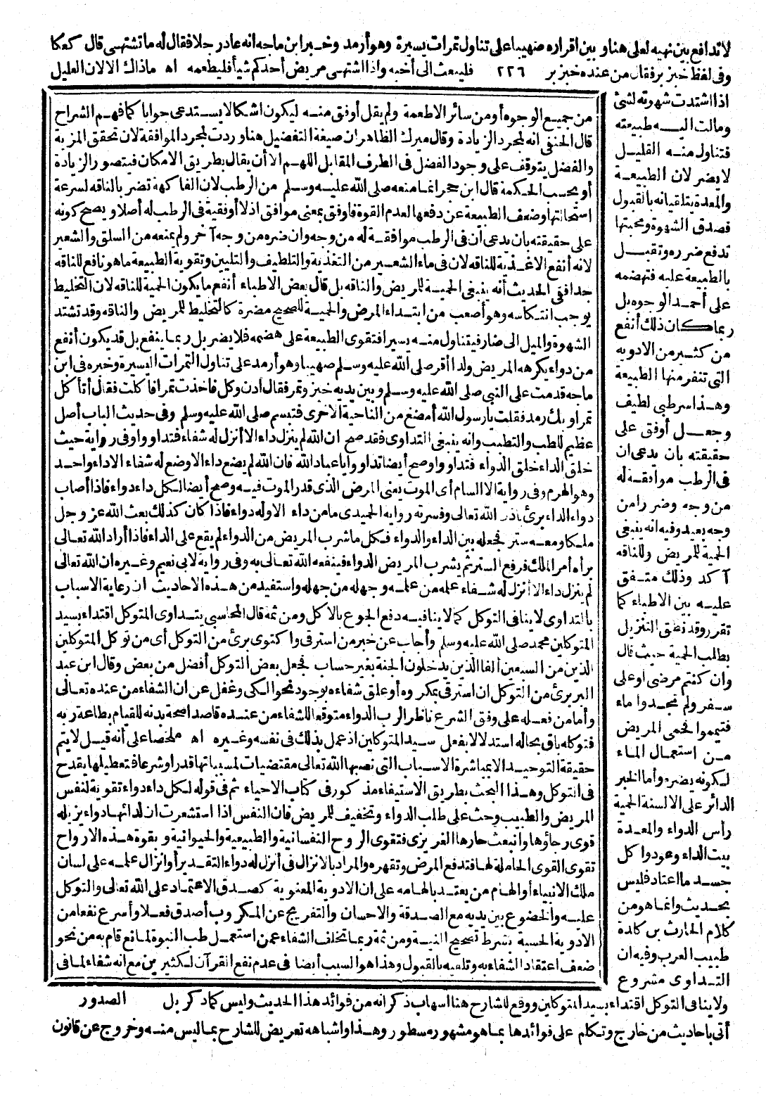 إِذْ عَمِلَ بِذَلِكَ فِي نَفْسِهِ وَغَيْرِهِ، انْتَهَى مُلَخَّصًا عَلَى أَنَّهُ قِيلَ: لَا يُتِمُّ حَقِيقَةَ التَّوْحِيدِ إِلَّا بِمُبَاشَرَةِ الْأَسْبَابِ الَّتِي نَصَبَهَا اللَّهُ تَعَالَى مُقْتَضَيَاتٍ لِمُسَبِّبَاتِهَا قَدَرًا وَشَرْعًا، فَتَعْطِيلُهَا يَقْدَحُ فِي التَّوَكُّلِ، وَهَذَا الْبَحْثُ بِطَرِيقِ الِاسْتِيفَاءِ مَذْكُورٌ فِي كِتَابِ الْإِحْيَاءِ، ثُمَّ فِي قَوْلِهِ لِكُلِّ دَاءٍ دَوَاءٌ تَقْوِيَةٌ لِنَفْسِ الْمَرِيضِ وَالطَّبِيبِ، وَحَثٌّ عَلَى طَلَبِ الدَّوَاءِ، وَتَخْفِيفٌ لِلْمَرِيضِ، فَإِنَّ النَّفْسَ إِذَا اسْتَشْعَرَتْ أَنَّ لِدَائِهَا دَوَاءً يُزِيلُهُ قَوِيَ رَجَاؤُهَا، وَانْبَعَثَ حَارُّهَا الْغَرِيزِيُّ، فَتَقْوَى الرُّوحُ النَّفْسَانِيَّةُ وَالطَّبِيعِيَّةُ وَالْحَيَوَانِيَّةُ، وَبِقُوَّةِ هَذِهِ الْأَرْوَاحِ تَقْوَى الْقُوَى الْحَامِلَةُ لَهَا، فَيَتَدَفَّعُ الْمَرِيضُ وَتَقْهَرُهُ، وَالْمُرَادُ بِالْإِنْزَالِ فِي أَنْزَلَ لَهُ دَوَاءً التَّقْدِيرُ أَوْ إِنْزَالُ عِلْمِهِ عَلَى لِسَانِ مَلِكِ الْأَنْبِيَاءِ، أَوْ إِلْهَامِ مَنْ يُعْتَدُّ بِإِلْهَامِهِ عَلَى أَنَّ الْأَدْوِيَةَ الْمَعْنَوِيَّةَ كَصِدْقِ الِاعْتِمَادِ عَلَى اللَّهِ تَعَالَى وَالتَّوَكُّلِ عَلَيْهِ وَالْخُضُوعِ بَيْنَ يَدَيْهِ مَعَ الصَّدَقَةِ وَالْإِحْسَانِ وَالتَّفْرِيجِ عَنِ الْمَكْرُوبِ أَصْدَقُ فِعْلًا، وَأَشْرَعُ نَفْعًا مِنَ الْأَدْوِيَةِ الْحِسِّيَّةِ بِشَرْطِ تَصْحِيحِ النِّيَّةِ، وَمِنْ ثَمَّةَ رُبَّمَا تَخَلَّفَ الشِّفَاءُ عَمَّنِ اسْتَعْمَلَ طِبَّ النُّبُوَّةِ لِمَانِعٍ قَامَ بِهِ، مِنْ نَحْوِ ضَعْفِ اعْتِقَادِ الشِّفَاءِ بِهِ، وَتَلَقِّيهِ بِالْقَبُولِ وَهَذَا هُوَ السَّبَبُ أَيْضًا فِي عَدَمِ نَفْعِ الْقُرْآنِ لِكَثِيرِينَ مَعَ أَنَّهُ شِفَاءٌ لِمَا فِي الصُّدُورِ.