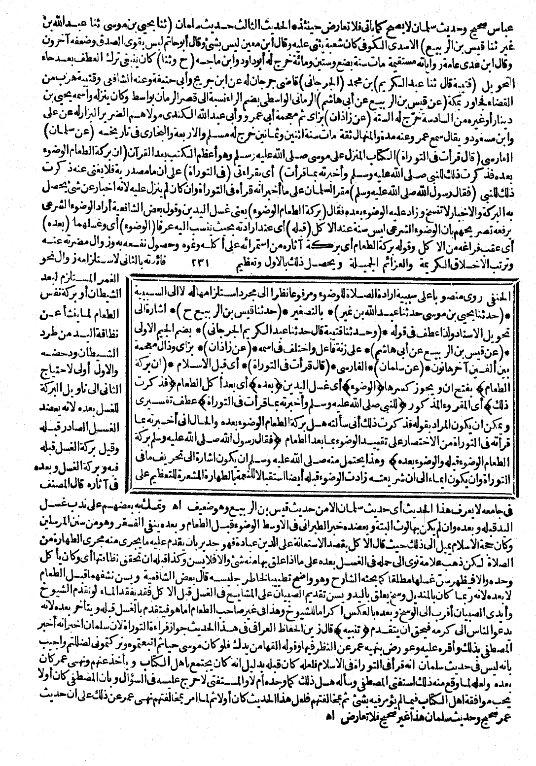 (حَدَّثَنَا يَحْيَى بْنُ مُوسَى، حَدَّثَنَا عَبْدُ اللَّهِ بْنُ نُمَيْرٍ) بِالتَّصْغِيرِ (حَدَّثَنَا قَيْسُ بْنُ الرَّبِيعِ ح) إِشَارَةٌ إِلَى تَحْوِيلِ الْإِسْنَادِ ; وَلِذَا عَطَفَ فِي قَوْلِهِ: (وَحَدَّثَنَا قُتَيْبَةُ، قَالَ: حَدَّثَنَا عَبْدُ الْكَرِيمِ الْجُرْجَانِيُّ) بِضَمِّ الْجِيمِ الْأُولَى (عَنْ قَيْسِ بْنِ الرَّبِيعِ، عَنْ أَبِي هَاشِمٍ) عَلَى زِنَةِ فَاعِلٍ، وَاخْتُلِفَ فِي اسْمِهِ (عَنْ زَاذَانَ) بِزَايٍ وَذَالٍ مُعْجَمَةٍ بَيْنَ أَلِفَيْنِ آخِرُهَا نُونٌ (عَنْ سَلْمَانَ) الْفَارِسِيِّ (قَالَ: قَرَأْتُ فِي التَّوْرَاةِ) أَيْ قَبْلَ الْإِسْلَامِ (أَنَّ بَرَكَةَ الطَّعَامِ) بِفَتْحِ أَنَّ وَيَجُوزُ كَسْرُهَا (الْوُضُوءُ) أَيْ غَسْلُ الْيَدَيْنِ (بَعْدَهُ) أَيْ بَعْدَ أَكْلِ الطَّعَامِ (فَذَكَرْتُ ذَلِكَ) أَيِ الْمَقْرُوءَ الْمَذْكُورَ (لِلنَّبِيِّ صَلَّى اللَّهُ عَلَيْهِ وَسَلَّمَ، وَأَخْبَرْتُهُ بِمَا قَرَأْتُ فِي التَّوْرَاةِ) عَطْفٌ تَفْسِيرِيٌّ، وَيُمْكِنُ أَنْ يَكُونَ الْمُرَادُ بِقَوْلِهِ: فَذَكَرْتُ ذَلِكَ أَنِّي سَأَلْتُهُ، هَلْ بَرَكَةُ الطَّعَامِ الْوُضُوءُ بَعْدَهُ، وَالْحَالُ أَنِّي أَخْبَرْتُهُ بِمَا قَرَأْتُهُ فِي التَّوْرَاةِ مِنَ الِاخْتِصَارِ عَلَى تَقْيِيدِ الْوُضُوءِ بِمَا بَعْدَ الطَّعَامِ، (فَقَالَ رَسُولُ اللَّهِ صَلَّى اللَّهُ عَلَيْهِ وَسَلَّمَ: بَرَكَةُ الطَّعَامِ الْوُضُوءُ قَبْلَهُ، وَالْوُضُوءُ بَعْدَهُ) وَهَذَا يُحْتَمَلُ مِنْهُ صَلَّى اللَّهُ عَلَيْهِ وَسَلَّمَ أَنْ يَكُونَ إِشَارَةً إِلَى تَحْرِيفِ مَا فِي التَّوْرَاةِ، وَأَنْ يَكُونَ إِيمَاءً إِلَى أَنَّ شَرِيعَتَهُ زَادَتِ الْوُضُوءَ قَبْلَهُ أَيْضًا اسْتِقْبَالًا لِلنِّعْمَةِ بِالطِّهَارَةِ الْمُشْعِرَةِ لِلتَّعْظِيمِ عَلَى