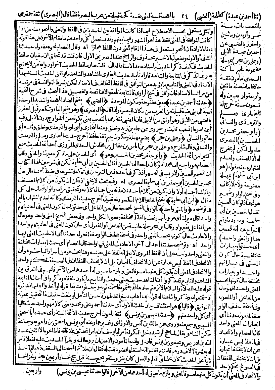 (حَدَّثَنَا أَحْمَدُ بْنُ عَبْدَةَ) : بِعَيْنٍ مَفْتُوحَةٍ وَسُكُونِ الْمُوَحَّدَةِ. (الضَّبِّيُّ) : بِفَتْحِ الضَّادِ الْمُعْجَمَةِ وَتَشْدِيدِ الْمُوَحَّدَةِ نِسْبَةً إِلَى بَنِي ضَبَّةَ قَبِيلَةٍ مِنَ الْعَرَبِ مِنْ سُكَّانِ الْبَصْرَةِ ; وَلِذَا قَالَ: (الْبَصْرِيُّ) : وَهُوَ بِفَتْحِ الْبَاءِ وَتُكْسَرُ، قِيلَ احْتَرَزَ بِالضَّبِّيِّ مِنَ الْأُبُلِّيِّ وَهُوَ أَوْثَقُ مِنَ الْأُبُلِّيِّ فَإِنَّ الضَّبِّيَّ ثِقَةٌ، رُمِيَ بِالنَّصْبِ يَعْنِي بِكَوْنِهِ مِنَ الْخَوَارِجِ دُونَ الْأُبُلِّيِّ، وَفِيهِ أَيْضًا سُوءُ الْمَذْهَبِ، قَالَ شَارِحٌ: رَوَى عَنْ حَمَّادِ بْنِ زَيْدٍ وَخَلْقٍ، وَعَنْهُ الْبُخَارِيُّ وَأَبُو دَاوُدَ وَالتِّرْمِذِيُّ وَخَلْقٌ، وَثَّقَهُ. . . أَبُو حَاتِمٍ وَالنَّسَائِيُّ. (وَعَلِيُّ بْنُ حُجْرٍ) : بِضَمِّ مُهْمَلَةٍ وَسُكُونِ جِيمٍ، ثِقَةٌ حَافِظٌ، أَخْرَجَ حَدِيثَهُ الْبُخَارِيُّ وَمُسْلِمٌ وَالتِّرْمِذِيُّ وَالنَّسَائِيُّ، وَقَالَ شَارِحٌ: هُوَ عَلِيُّ بْنُ حُجْرِ بْنِ إِيَاسِ بْنِ مُقَاتِلِ بْنِ مُخَادِشٍ السَّعْدِيُّ الْمَرْوَزِيُّ، أَحَدُ أَئِمَّةِ الْحَدِيثِ، سَمِعَ كَثِيرًا مِنْ أَئِمَّةِ الْحَدِيثِ. (وَأَبُو جَعْفَرٍ مُحَمَّدُ بْنُ الْحُسَيْنِ وَهُوَ) : أَيِ الْحُسَيْنُ عَلَى مَا ذَكَرَ مِيرَكُ وَالْحَنَفِيُّ، وَقَالَ الْعِصَامُ: هُوَ رَاجِعٌ إِلَى مُحَمَّدٍ إِذْ لَوْ كَانَ رَاجِعًا إِلَى الْحُسَيْنِ لَقَالَ: الْحُسَيْنُ بْنُ أَبِي حَلِيمَةَ لَكِنْ فِي شَرْحَيْنِ لِهَذَا الْكِتَابِ أَنَّ الضَّمِيرَ لِلْحُسَيْنِ وَلَا رَيْبَ فِي أَنَّهُ سَهْوٌ إِذْ ذُكِرَ فِي أَحَدِ هَذَيْنِ الشَّرْحَيْنِ فِي تَكْمِلَةِ شَرْحِهِ فِي ضَبْطِ أَسْمَاءِ الرِّجَالِ مُحَمَّدُ بْنُ الْحُسَيْنِ أَبُو جَعْفَرِ بْنُ أَبِي حَلِيمَةَ، انْتَهَى. وَفِيهِ بَحْثٌ لَا يَخْفَى إِذْ يُمْكِنُ أَنْ يَكُونَ مِنْ كَلَامِ الْمُصَنِّفِ بَيَانًا لِمَا أَجْمَلَهُ أَوَّلًا وَأَنْ يَكُونَ مِنْ كَلَامِ أَحَدِ تَلَامِذَتِهِ بَيَّنَ إِجْمَالَ كَلَامِهِ وَتَحْقِيقَ مَرَامِهِ وَالْوَاوُ لِلْحَالِ عَلَى كُلِّ مَقَالٍ. (ابْنُ أَبِي حَلِيمَةَ) : بِفَتْحِ الْحَاءِ وَاللَّامِ الْمَكْسُورَةِ مَقْبُولٌ، أَخْرَجَ حَدِيثَهُ التِّرْمِذِيُّ وَكَأَنَّهُ لِعَدَمِ اشْتِهَارِهِ بَالَغَ فِي تَوْضِيحِهِ. (وَالْمَعْنَى وَاحِدٌ) : بِالْوَاوِ فِي النُّسَخِ الْمُصَحَّحَةِ حَالٌ مِنَ الْفَاعِلِ أَيْ حَدَّثُونَا حَالَ كَوْنِ الْمَعْنَى فِي أَحَادِيثِهِمْ وَاحِدًا، قَالَ مِيرَكُ: أَيْ مَرْوِيَّاتُهُمْ وَقَعَتْ بِأَلْفَاظٍ مُخْتَلِفَةٍ وَمَعْنَى الْكُلِّ