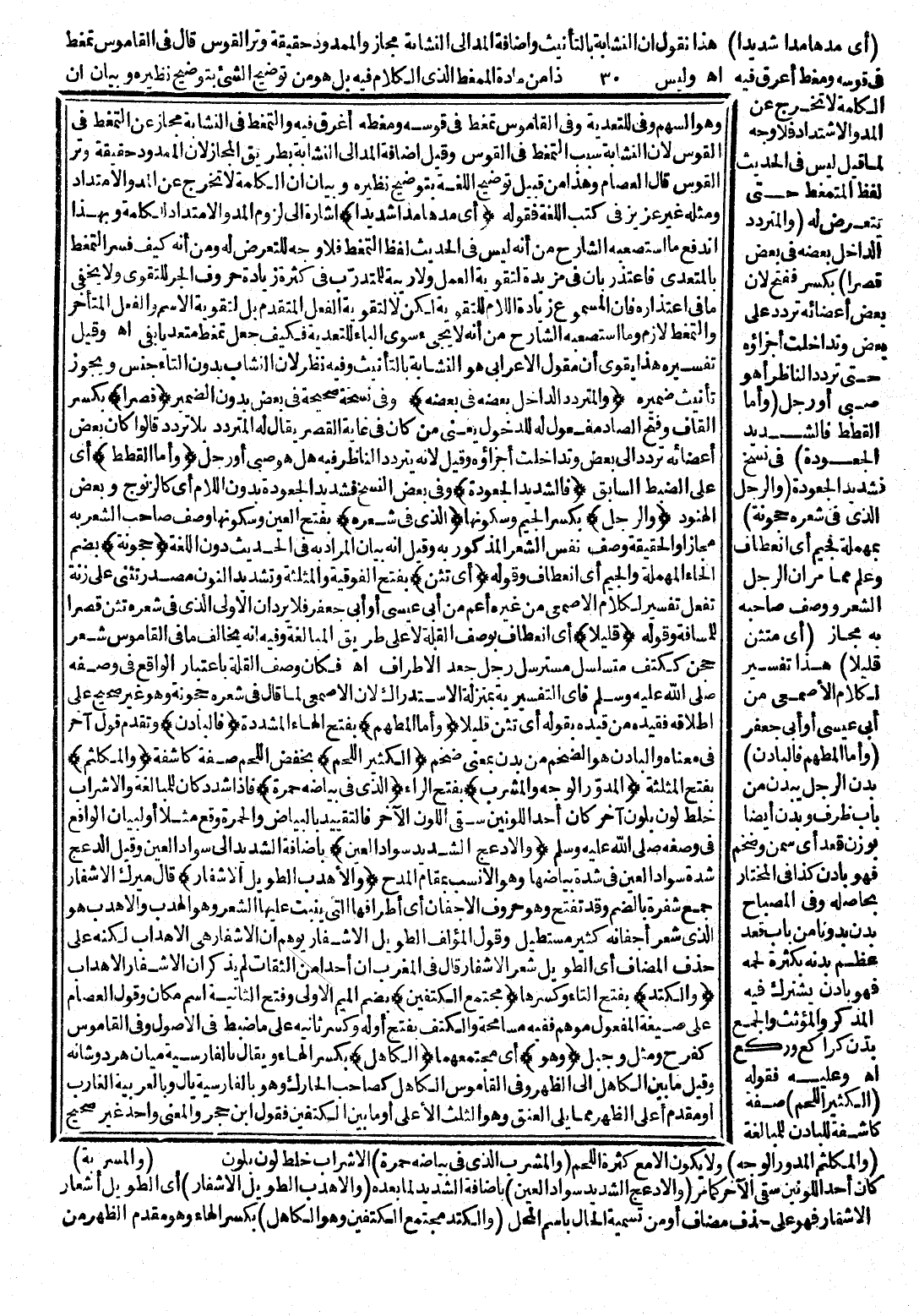 لِلتَّعَرُّضِ لَهُ وَمِنْ أَنَّهُ كَيْفَ فَسَّرَ التَّمَغُّطَ بِالْمُتَعَدِّي فَاعْتَذَرَ بِأَنَّ «فِي» مَزِيدَةٌ لِتَقْوِيَةِ الْعَمَلِ وَلَا رِيبَةَ لِلْمُتَدَرِّبِ فِي كَثْرَةِ زِيَادَةِ حُرُوفِ الْجَرِّ لِلتَّقَوِّي، وَلَا يَخْفَى مَا فِي اعْتِذَارِهِ فَإِنَّ الْمَسْمُوعَ زِيَادَةُ اللَّامِ لِلتَّقْوِيَةِ، لَكِنْ لَا لِتَقْوِيَةِ الْفِعْلِ الْمُتَقَدِّمِ بَلْ لِتَقْوِيَةِ الِاسْمِ وَالْفِعْلِ الْمُتَأَخِّرِ، وَالتَّمَغُّطُ لَازِمٌ، وَمَا اسْتَصْعَبَهُ الشَّارِحُ مِنْ أَنَّهُ لَا يَجِيءُ سِوَى الْبَاءِ لِلتَّعْدِيَةِ فَكَيْفَ جَعَلَ تَمَغَّطَ مُتَعَدِّيًا بِفِي، انْتَهَى. وَقِيلَ: تَفْسِيرُهُ هَذَا يُقَوِّي أَنَّ مَقُولَ الْأَعْرَابِيِّ هُوَ النُّشَّابَةُ بِالتَّأْنِيثِ، وَفِيهِ نَظَرٌ لِأَنَّ النُّشَّابَ بِدُونِ التَّاءِ جِنْسٌ وَيَجُوزُ تَأْنِيثُ ضَمِيرِهِ. (وَالْمُتَرَدِّدُ الدَّاخِلُ بَعْضُهُ فِي بَعْضِهِ) : وَفِي نُسْخَةٍ صَحِيحَةٍ فِي بَعْضٍ بِدُونِ الضَّمِيرِ. (قِصَرًا) : بِكَسْرِ الْقَافِ وَفَتْحِ الصَّادِ مَفْعُولٌ لَهُ لِلدُّخُولِ يَعْنِي مَنْ كَانَ فِي غَايَةِ الْقِصَرِ يُقَالُ لَهُ الْمُتَرَدِّدُ بِلَا تَرَدُّدٍ قَالُوا: كَأَنَّ بَعْضَ أَعْضَائِهِ تَرَدَّدَ إِلَى بَعْضٍ وَتَدَاخَلَتْ أَجْزَاؤُهُ، وَقِيلَ: لِأَنَّهُ يَتَرَدَّدُ النَّاظِرُ فِيهِ هَلْ هُوَ صَبِيٌّ أَوْ رَجُلٌ. (وَأَمَّا الْقَطَطُ) : أَيْ عَلَى الضَّبْطِ السَّابِقِ. (فَالشَّدِيدُ الْجُعُودَةِ) : وَفِي بَعْضِ النُّسَخِ فَشَدِيدُ الْجُعُودَةِ بِدُونِ اللَّامِ أَيْ كَالزُّنُوجِ وَفِي بَعْضِ الْهُنُودِ. (وَالرَّجِلُ) : بِكَسْرِ الْجِيمِ وَسُكُونِهَا. (الَّذِي فِي شَعْرِهِ) : بِفَتْحِ الْعَيْنِ وَسُكُونِهَا وُصِفَ صَاحِبُ الشَّعْرِ بِهِ مَجَازًا وَالْحَقِيقَةُ وُصِفُ نَفْسِ الشَّعْرِ الْمَذْكُورِ بِهِ، وَقِيلَ أَنَّهُ بَيَانٌ لِلْمُرَادِ بِهِ فِي الْحَدِيثِ دُونَ اللُّغَةِ. (حُجُونَةٌ) : بِضَمِّ الْحَاءِ وَالْمُهْمَلَةِ وَالْجِيمِ أَيِ انْعِطَافٌ. وَقَوْلُهُ: (أَيْ تَثَنٍّ) : بِفَتْحِ الْفَوْقِيَّةِ وَالْمُثَلَّثَةِ وَتَشْدِيدِ النُّونِ مَصْدَرُ تَثَنَّى عَلَى زِنَةِ تَفَعَّلَ تَفْسِيرٌ لِكَلَامِ الْأَصْمَعِيِّ مِنْ غَيْرِهِ أَعَمُّ مِنْ أَبِي عِيسَى أَوْ أَبِي جَعْفَرٍ فَلَا يُرَدُّ أَنَّ الْأَوْلَى الَّذِي فِي شَعْرِهِ تَثَنٍّ قَصْرًا لِلْمَسَافَةِ. وَقَوْلُهُ: (قَلِيلًا) : أَيِ انْعِطَافٌ بِوَصْفِ الْقِلَّةِ لَا عَلَى طَرِيقِ الْمُبَالَغَةِ، وَفِيهِ أَنَّهُ يُخَالِفُ مَا فِي الْقَامُوسِ: شَعْرٌ حَجِنٌ كَكَتِفٍ مُتَسَلْسِلٌ مُسْتَرْسِلٌ رَجِلٌ جَعْدُ الْأَطْرَافِ، انْتَهَى. فَكَانَ وَصْفُ الْقِلَّةِ بِاعْتِبَارِ الْوَاقِعِ فِي وَصْفِهِ صَلَّى اللَّهُ عَلَيْهِ وَسَلَّمَ، فَأَيِ التَّفْسِيرِيَّةُ بِمَنْزِلَةِ الِاسْتِدْرَاكِ لِأَنَّ الْأَصْمَعِيَّ لَمَّا قَالَ: فِي شَعْرِهِ حُجُونَةٌ وَهُوَ غَيْرُ صَحِيحٍ عَلَى إِطْلَاقِهِ فَقَيَّدَهُ مَنْ قَيَّدَهُ بِقَوْلِهِ أَيْ تَثَنٍّ قَلِيلًا. (وَأَمَّا الْمُطَهَّمُ) : بِفَتْحِ الْهَاءِ الْمُشَدَّدَةِ. (فَالْبَادِنُ) : وَتَقَدَّمَ قَوْلٌ آخَرُ فِي مَعْنَاهُ، وَالْبَادِنُ هُوَ الضَّخْمُ، مِنْ بَدَنَ بِمَعْنَى ضَخُمَ. (الْكَثِيرُ اللَّحْمِ) : بِخَفْضِ اللَّحْمِ صِفَةٌ كَاشِفَةٌ. (وَالْمُكَلْثَمُ) : بِفَتْحِ الْمُثَلَّثَةِ. (الْمُدَوَّرُ الْوَجْهِ وَالْمُشْرَبُ) : بِفَتْحِ الرَّاءِ. (الَّذِي فِي بَيَاضِهِ حُمْرَةٌ) : فَإِذَا شُدِّدَ كَانَ لِلْمُبَالَغَةِ، وَالْإِشْرَابُ خَلْطُ لَوْنٍ بِلَوْنٍ آخَرَ كَأَنَّ أَحَدَ اللَّوْنَيْنِ سَقَى اللَّوْنَ الْآخَرَ، فَالتَّقْيِيدُ بِالْبَيَاضِ وَالْحُمْرَةِ وَقَعَ مَثَلًا أَوْ لِبَيَانِ الْوَاقِعِ فِي وَصْفِهِ