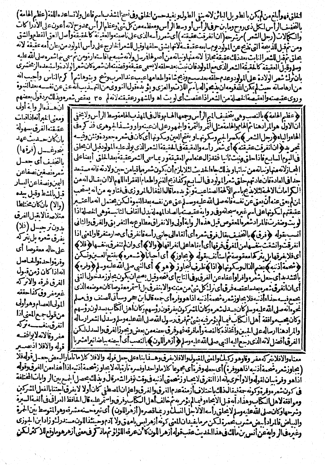 (عَظِيمَ الْهَامَةِ) : بِالنَّصْبِ وَهِيَ بِتَخْفِيفِ الْمِيمِ ; الرَّأْسُ وَجَمْعُهَا الْهَامُ، وَقَالَ فِي الْمُهَذَّبِ: الْهَامَةُ وَسَطَ الرَّأْسِ وَلَا يَخْفَى أَنَّ الْأُولَى هُوَ الْمُرَادُ هُنَا ثُمَّ الْهَامُ وَالْهَامَةُ مِثْلُ التَّمْرِ وَالتَّمْرَةِ، وَالْجُمْهُورُ عَلَى أَنَّ عَيْنَهُ وَاوٌ وَشَذَّ الْجَوْهَرِيُّ فَذَكَرَهُ فِي الْهَاءِ وَالْيَاءِ. (رَجِلُ الشَّعْرِ) : بِكَسْرِ الْجِيمِ وَسُكُونِهَا، وَبِفَتْحِ الْعَيْنِ وَسُكُونِهَا ; أَيْ كَانَ فِي شَعْرِهِ جُعُودَةٌ وَتَثَنٍّ وَفِيهِ تَجْرِيدٌ. (إِنِ انْفَرَقَتْ عَقِيقَتُهُ) : أَيْ شَعْرُ رَأْسِهِ، وَالْعَقِيقَةُ فِي الْحَقِيقَةِ الشَّعْرُ الَّذِي يُوَلَدُ عَلَيْهِ الْمَوْلُودِ قَبْلَ أَنْ يُحْلَقَ فِي الْيَوْمِ السَّابِعِ، فَإِذَا حُلِقَ وَنَبَتَ ثَانِيًا فَقَدْ زَالَ عَنْهُ اسْمُ الْعَقِيقَةِ، وَرُبَّمَا سُمِّيَ الشَّعْرُ عَقِيقَةً بَعْدَ الْحَلْقِ أَيْضًا عَلَى الْمَجَازِ لِأَنَّهُ مِنْهَا وَنَبَاتُهُ مِنْ نَبَاتِهَا، وَبِذَلِكَ جَاءَ الْحَدِيثُ لِئَلَّا يَلْزَمَ أَنْ يَكُونَ شَعْرُهُ بَاقِيًا مِنْ حِينِ وِلَادَتِهِ فَإِنَّهُ مُسْتَبْعَدٌ جِدًّا فِي الْعَادَةِ، فَإِنَّ عَادَتَهُمْ حَلْقُ شَعْرِ الْمَوْلُودِ فِي السَّابِعِ وَكَذَا ذَبْحُ الْغَنَمِ وَإِطْعَامُ الْفُقَرَاءِ اللَّهُمَّ إِلَّا أَنْ يُقَالَ إِنَّهُ مِنَ الْكَرَامَاتِ الْإِلَهِيَّةِ لِئَلَّا يُذْبَحَ بِاسْمِ الْآلِهَةِ الصِّنَاعِيَّةِ، وَيُؤَيِّدُهُ مَا قَالَ الْقَفَّالُ الْمَرْوَزِيُّ فِي فَتَاوِيهِ مِنْ أَنَّهُ يُسْتَحَبُّ لِمَنْ لَمْ يُعَقَّ عَنْهُ أَنْ يَعُقَّ عَنْ نَفْسِهِ فَإِنَّهُ صَلَّى اللَّهُ عَلَيْهِ وَسَلَّمَ عَقَّ عَنْ نَفْسِهِ بَعْدَ النُّبُوَّةِ، لَكِنْ يُحْتَمَلُ أَنَّهُ مَا اعْتَبَرَ عَقِيقَتَهُمْ لِكَوْنِهَا عَلَى اسْمِ غَيْرِهِ سُبْحَانَهُ، وَفِي رِوَايَةٍ: عَقِيصَتُهُ بِالصَّادِّ الْمُهْمَلَةِ بَدَلَ الْقَافِ الثَّانِيَةِ، وَهِيَ الْخَصْلَةُ إِذَا لُوِيَتْ وَضُفِّرَتْ فَالْمُرَادُ شَعْرُهُ الْمَعْقُوصُ، قِيلَ: هَذِهِ الرِّوَايَةُ أَوْلَى وَالِانْفِرَاقُ مُطَاوِعٌ بِهِ التَّفْرِيقُ وَالْفَرْقُ، وَالثَّانِي أَنْسَبُ بِقَوْلِهِ: (فَرَقَ) : بِالتَّخْفِيفِ، يُقَالُ: فَرَقَ شَعْرَهُ أَيْ أَلْقَاهُ إِلَى جَانِبَيْ رَأْسِهِ فَانْفَرَقَ أَيْ صَارَ مُتَفَرِّقًا، وَالْمَعْنَى إِذَا انْفَرَقَتْ وَانْشَقَّتْ بِنَفْسِهَا مِنَ الْمَفْرِقِ فَرَّقَهَا أَيْ أَبْقَاهَا عَلَى انْفِرَاقِهَا. (وَإِلَّا) : أَيْ وَإِنْ لَمْ تَنْفَرِقْ بِنَفْسِهَا. (فَلَا) : أَيْ فَلَا يُفَرِّقُهَا بَلْ يَتْرُكُهَا مَعْقُوصَةً، ثُمَّ اسْتَأْنَفَ بِقَوْلِهِ: (يُجَاوِزُ) : أَيْ أَحْيَانًا. (شَعْرُهُ) : بِفَتْحِ الْعَيْنِ وَتُسَكَّنُ. (شَحْمَةَ أُذُنَيْهِ) : بِضَمِّ الذَّالِ وَسُكُونِهَا. (إِذَا) : ظَرْفٌ لِيُجَاوِزَ. (هُوَ) : أَيِ النَّبِيُّ صَلَّى اللَّهُ عَلَيْهِ وَسَلَّمَ. (وَفَّرَهُ) : بِالتَّشْدِيدِ أَيْ جَعَلَ شَعْرَهُ وَافِرًا وَأَعْفَاهُ مِنَ الْفَرْقِ، وَفِي التَّاجِ: أَيْ فَتَحَهُ، وَقِيلَ يَصِحُّ أَنْ يَكُونَ يُجَاوِزُ مَدْخُولَ النَّفْيِ أَيْ إِنِ انْفَرَقَ شَعْرُهُ بَعْدَ مَا عَقَصَهُ فَرَقَ أَيْ تَرَكَ كُلَّ شَيْءٍ