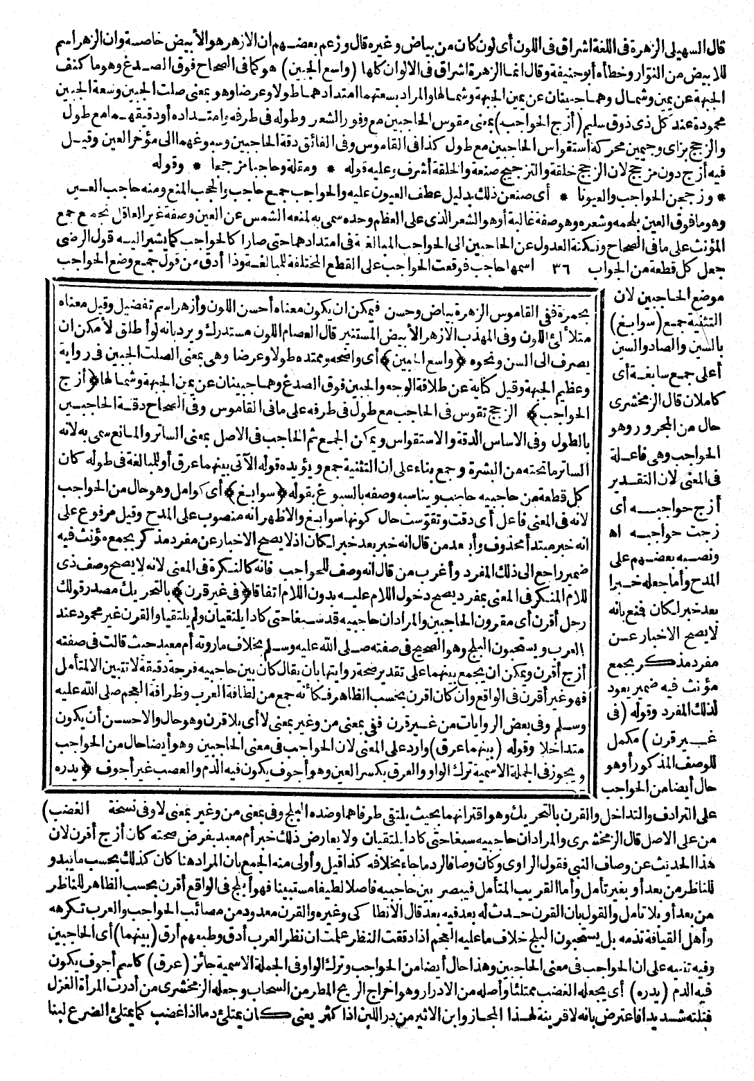 نَيِّرًا مُشْرَبًا بِحُمْرَةٍ، فَفِي الْقَامُوسِ: الزَّهْرَةُ ; بَيَاضٌ وَحُسْنٌ فَيُمْكِنُ أَنْ يَكُونَ مَعْنَاهُ أَحْسَنَ اللَّوْنِ، وَأَزْهَرُ اسْمُ تَفْضِيلٍ، وَقِيلَ مَعْنَاهُ مُتَلَأْلِئُ اللَّوْنِ، وَفِي الْمُهَذَّبِ: الْأَزْهَرُ الْأَبْيَضُ الْمُسْتَنِيرُ، قَالَ الْعِصَامُ: اللَّوْنُ مُسْتَدْرَكٌ وَيُرَدُّ بِأَنَّهُ لَوْ أُطْلِقَ لَأَمْكَنَ أَنْ يُصْرَفَ إِلَى السِّنِّ وَنَحْوِهِ. (وَاسِعَ الْجَبِينِ) : أَيْ وَاضِحُهُ وَمُمْتَدُّهُ طُولًا وَعَرْضًا وَهِيَ بِمَعْنَى الصَّلْتِ الْجَبِينِ فِي رِوَايَةٍ وَعَظِيمِ الْجَبْهَةِ، وَقِيلَ: كِنَايَةٌ عَنْ طَلَاقَةِ الْوَجْهِ، وَالْجَبِينُ فَوْقَ الصُّدْغِ وَهُمَا جَبِينَانِ عَنْ يَمِينِ الْجَبْهَةِ وَشَمَالًا. (أَزَجَّ الْحَوَاجِبِ) : الزَّجَجُ تُقَوُّسٌ فِي الْحَاجِبِ مَعَ طُولٍ فِي طَرَفِهِ عَلَى مَا فِي الْقَامُوسِ، وَفِي الصِّحَاحِ: دِقَّةُ الْحَاجِبَيْنِ بِالطُّولِ، وَفِي الْأَسَاسِ: الدِّقَّةُ وَالِاسْتِقْوَاسُ وَيُمْكِنُ الْجَمْعُ ثُمَّ الْحَاجِبُ فِي الْأَصْلِ بِمَعْنَى السَّاتِرِ، وَالْمَانِعُ سُمِّيَ بِهِ لِأَنَّهُ السَّاتِرُ مَا تَحْتَهُ مِنَ الْبَشَرَةِ، وَجُمِعَ بِنَاءً عَلَى أَنَّ التَّثْنِيَةَ جَمْعٌ وَيُؤَيِّدُهُ قَوْلُهُ الْآتِي " بَيْنَهُمَا عَرْقٌ " أَوْ لِلْمُبَالَغَةِ فِي طُولِهِ كَأَنَ كُلَّ قِطْعَةٍ مِنْ حَاجِبَيْهِ حَاجِبٌ وَيُنَاسِبُهُ وَصْفُهُ بِالسُّبُوغِ بِقَوْلِهِ: (سَوَابِغَ) : أَيْ كَوَامِلَ، وَهُوَ حَالٌ مِنَ الْحَوَاجِبِ ; لِأَنَّهُ فِي الْمَعْنَى فَاعِلٌ، أَيْ دَقَّتْ وَتَقَوَّسَتْ حَالَ كَوْنِهَا سَوَابِغَ، وَالْأَظْهَرُ أَنَّهُ مَنْصُوبٌ عَلَى الْمَدْحِ، وَقِيلَ: مَرْفُوعٌ عَلَى أَنَّهُ مُبْتَدَأٌ مَحْذُوفٌ، وَأَبْعَدَ مَنْ قَالَ أَنَّهُ خَبَرٌ بَعْدَ خَبَرٍ لِكَانَ إِذْ لَا يَصِحُّ الْإِخْبَارُ عَنْ مُفْرِدٍ مُذَكَّرٍ بِجَمْعٍ مُؤَنَّثٍ فِيهِ ضَمِيرٌ رَاجِعٌ إِلَى ذَلِكَ الْمُفْرَدِ، وَأَغْرَبَ مَنْ قَالَ أَنَّهُ وَصْفٌ لِلْحَوَاجِبِ فَإِنَّهُ كَالنَّكِرَةِ فِي الْمَعْنَى لِأَنَّهُ لَا يَصِحُّ وَصْفُ ذِي اللَّامِ الْمُنَكَّرِ فِي الْمَعْنَى بِمُفْرَدٍ