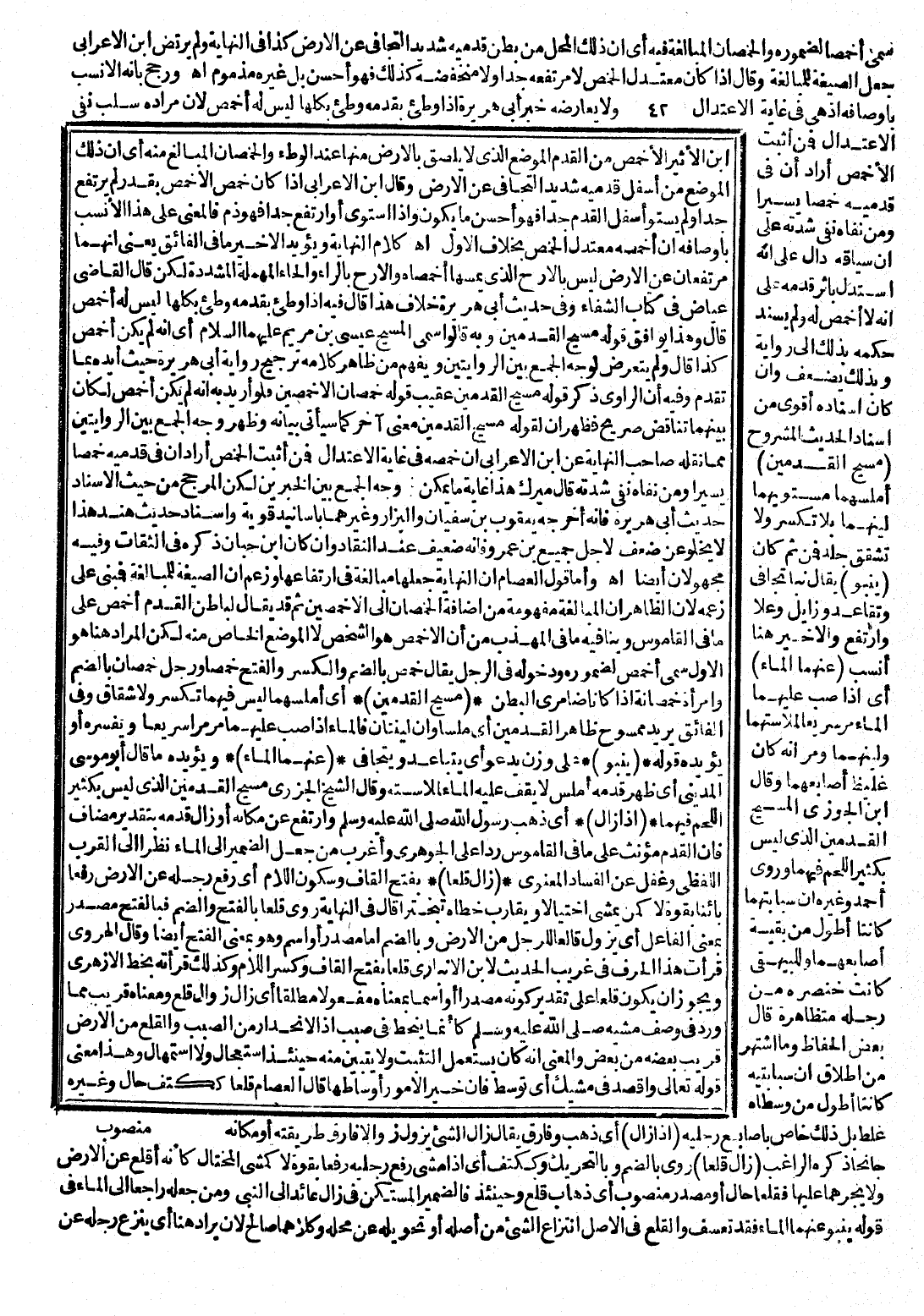 ابْنُ الْأَثِيرِ: الْأَخْمَصُ مِنَ الْقَدَمِ الْمَوْضِعُ الَّذِي لَا يَلْصِقُ بِالْأَرْضِ مِنْهَا عِنْدَ الْوَطْءِ، وَالْخُمْصَانُ الْمَبَالِغُ مِنْهُ أَيْ أَنَّ ذَلِكَ الْمَوْضِعَ مِنْ أَسْفَلِ قَدَمَيْهِ شَدِيدُ التَّجَافِي عَنِ الْأَرْضِ، وَقَالَ ابْنُ الْأَعْرَابِيِّ: إِذَا كَانَ خَمْصُ الْأَخْمَصِ بِقَدْرٍ لَمْ يَرْتَفِعْ جِدًّا وَلَمْ يَسْتَوِ أَسْفَلُ الْقَدَمِ جِدًّا فَهُوَ أَحْسَنُ مَا يَكُونُ وَإِذَا اسْتَوَى أَوِ ارْتَفَعَ جِدًّا فَهُوَ ذَمٌّ، فَالْمَعْنَى عَلَى هَذَا الْأَنْسَبُ بِأَوْصَافِهِ أَنَّ أَخْمَصَهُ مُعْتَدِلُ الْخَمْصِ بِخِلَافِ الْأَوَّلِ، انْتَهَى كَلَامُ النِّهَايَةِ، وَيُؤَيِّدُ الْأَخِيرَ مَا فِي الْفَائِقِ: يَعْنِي أَنَّهُمَا مُرْتَفِعَانِ عَنِ الْأَرْضِ لَيْسَ بِالْأَرَحِّ الَّذِي يَمَسُّهَا أَخْمَصَاهُ، وَالْأَرَحُّ بِالرَّاءِ وَالْحَاءِ الْمُهْمَلَةِ الْمُشَدَّدَةِ، لَكِنْ قَالَ الْقَاضِي عِيَاضٌ فِي كِتَابِ الشِّفَاءِ وَفِي حَدِيثِ أَبِي هُرَيْرَةَ خِلَافُ هَذَا، قَالَ فِيهِ: إِذَا وَطِئَ بِقَدَمِهِ وَطِئَ بِكُلِّهَا لَيْسَ لَهُ أَخْمَصَ، قَالَ: وَهَذَا يُوَافِقُ قَوْلَهُ: مَسِيحُ الْقَدَمَيْنِ، وَبِهِ قَالُوا سُمِّي الْمَسِيحُ عِيسَى بْنُ مَرْيَمَ عَلَيْهِمَا السَّلَامُ أَيْ أَنَّهُ لَمْ يَكُنْ أَخْمَصَ كَذَا قَالَ، وَلَمْ يَتَعَرَّضْ لِوَجْهِ الْجَمْعِ بَيْنَ الرِّوَايَتَيْنِ، وَيُفْهَمُ مِنْ ظَاهِرِ كَلَامِهِ تَرْجِيحُ رِوَايَةِ أَبِي هُرَيْرَةَ حَيْثُ أَيَّدَهُ بِمَا تَقَدَّمَ، وَفِيهِ أَنَّ الرَّاوِيَ ذَكَرَ قَوْلَهُ: " مَسِيحَ الْقَدَمَيْنِ " عَقِيبَ قَوْلِهِ: " خُمْصَانُ الْأَخْمَصَيْنِ " فَلَوْ أُرِيدَ بِهِ أَنَّهُ لَمْ يَكُنْ أَخْمَصَ لَكَانَ بَيْنَهُمَا تَنَاقُضٌ صَرِيحٌ، فَظَهَرَ أَنَّ لِقَوْلِهِ: " مَسِيحُ الْقَدَمَيْنِ " مَعْنًى آخَرَ - كَمَا سَيَأْتِي بَيَانُهُ -، وَظَهَرَ وَجْهُ الْجَمْعِ بَيْنَ الرِّوَايَتَيْنِ مِمَّا نَقَلَهُ صَاحِبُ النِّهَايَةِ عَنِ ابْنِ الْأَعْرَابِيِّ أَنْ خَمْصَهُ فِي غَايَةِ الِاعْتِدَالِ فَمَنْ أَثْبَتَ الْخَمْصَ