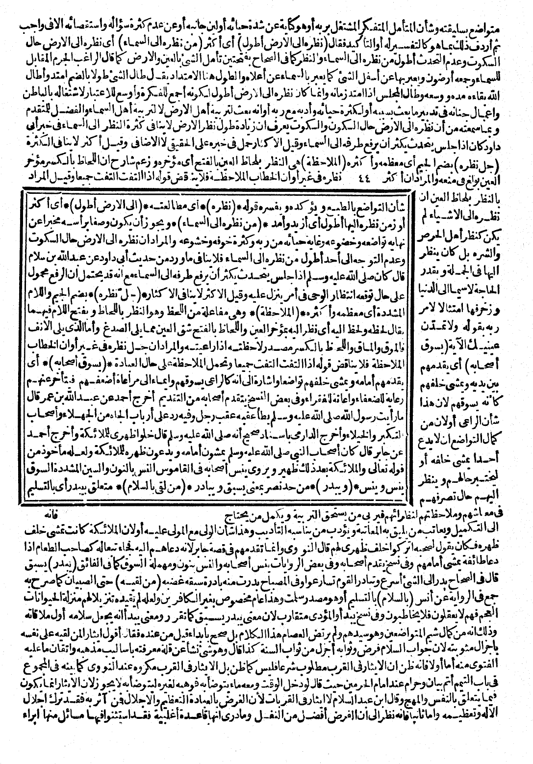 بِالطَّبْعِ وَيُؤَكِّدُهُ وَيُفَسِّرُهُ قَوْلُهُ: (نَظَرُهُ) : أَيْ مُطَالَعَتُهُ. (إِلَى الْأَرْضِ أَطْوَلُ) : أَيْ أَكْثَرُ أَوْ زَمَنُ نَظَرِهِ إِلَيْهَا أَطْوَلُ أَيْ أَزْيَدُ وَأَمَدُّ (مِنْ نَظَرِهِ إِلَى السَّمَاءِ) : وَيَجُوزُ أَنْ يَكُونَ وَصْفًا بِرَأْسِهِ مُخْبِرًا عَنْ نِهَايَةِ تَوَاضُعِهِ وَخُضُوعِهِ وَغَايَةُ حَيَائِهِ مِنْ رَبِّهِ وَكَثْرَةُ خَوْفِهِ وَخُشُوعِهِ، وَالْمُرَادُ أَنَّ نَظَرَهُ إِلَى الْأَرْضِ حَالَ السُّكُوتِ وَعَدَمِ التَّوَجُّهِ إِلَى أَحَدٍ أَطْوَلُ مِنْ نَظَرِهِ إِلَى السَّمَاءِ فَلَا يُنَافِي مَا وَرَدَ مِنْ حَدِيثِ أَبِي دَاوُدَ عَنْ عَبْدِ اللَّهِ بْنِ سَلَامٍ قَالَ: كَانَ صَلَّى اللَّهُ عَلَيْهِ وَسَلَّمَ إِذَا جَلَسَ يَتَحَدَّثُ يُكْثِرُ أَنْ يَرْفَعَ طَرْفَهُ إِلَى السَّمَاءِ مَعَ أَنَّهُ قَدْ يَحْتَمِلُ أَنَّ الرَّفْعَ مَحْمُولٌ عَلَى حَالِ تَوَقُّعِهِ انْتِظَارَ الْوَحْيِ فِي أَمْرٍ يَنْزِلُ عَلَيْهِ، وَقِيلَ: الْأَكْثَرُ لَا يُنَافِي الْإِكْثَارَ. (جُلُّ نَظَرِهِ) : بِضَمِّ الْجِيمِ وَاللَّامِ الْمُشَدَّدَةِ أَيْ مُعْظَمُهُ وَأَكْثَرُهُ. (الْمُلَاحَظَةُ) : وَهِيَ مُفَاعَلَةٌ مِنَ اللَّحْظِ وَهُوَ النَّظَرُ بِاللِّحَاظِ وَبِفَتْحِ اللَّامِ فِيهِمَا، يُقَالُ: لَحِظَهُ وَلَحِظَ إِلَيْهِ بِمُؤَخَّرِ الْعَيْنِ، وَاللِّحَاظُ بِالْفَتْحِ شَقُّ الْعَيْنِ مِمَّا يَلِي الصُّدْغَ، وَأَمَّا الَّذِي يَلِي الْأَنْفَ فَالْمَوْقُ وَالْمَاقُ، وَاللِّحَّاظُ بِالْكَسْرِ مَصْدَرُ لَاحَظْتُهُ إِذَا رَاعَيْتَهُ، وَالْمُرَادُ أَنَّ جُلَّ نَظَرِهِ فِي غَيْرِ أَوَانِ الْخِطَابِ الْمُلَاحَظَةُ فَلَا يُنَاقِضُ قَوْلَهُ إِذَا الْتَفَتَ الْتَفَتَ جَمِيعًا وَتُحْمَلُ الْمُلَاحَظَةُ عَلَى حَالِ الْعِبَادَةِ. (يَسُوقُ أَصْحَابَهُ) : أَيْ يُقَدِّمُهُمْ أَمَامَهُ وَيَمْشِي خَلْفَهُمْ تَوَاضُعًا وَإِشَارَةً إِلَى أَنَّهُ كَالرَّاعِي يَسُوقُهُمْ وَإِيمَاءً إِلَى مُرَاعَاةِ أَضْعَفِهِمْ فَيَتَأَخَّرُ عَنْهُمْ رِعَايَةً لِلضُّعَفَاءِ وَإِعَانَةً لِلْفُقَرَاءِ، وَفِي بَعْضِ النُّسَخِ " يُقَدِّمُ أَصْحَابَهُ " مِنَ التَّقْدِيمِ، أَخْرَجَ أَحْمَدُ عَنْ عَبْدِ اللَّهِ بْنِ عُمَرَ قَالَ: مَا رَأَيْتُ رَسُولَ اللَّهِ صَلَّى اللَّهُ عَلَيْهِ وَسَلَّمَ يَطَأُ عَقِبُهُ عَقِبَ رَجُلٍ. وَفِيهِ رَدٌّ عَلَى أَرْبَابِ الْجَاهِ مِنَ الْجُهَلَاءِ وَأَصْحَابِ التَّكَبُّرِ وَالْخُيَلَاءِ، وَأَخْرَجَ الدَّارِمِيُّ بِإِسْنَادٍ صَحِيحٍ أَنَّهُ صَلَّى اللَّهُ عَلَيْهِ وَسَلَّمَ قَالَ: " خَلُّوا ظَهْرِي لِلْمَلَائِكَةِ "، وَأَخْرَجَ أَحْمَدُ عَنْ جَابِرٍ قَالَ: كَانَ أَصْحَابُ النَّبِيِّ صَلَّى اللَّهُ عَلَيْهِ وَسَلَّمَ يَمْشُونَ أَمَامَهُ وَيَدَعُونَ ظَهْرَهُ لِلْمَلَائِكَةِ، وَلَعَلَّهُ مَأْخُوذٌ مِنْ قَوْلِهِ تَعَالَى: (وَالْمَلَائِكَةُ بَعْدَ ذَلِكَ ظَهِيرٌ) وَيُرْوَى: " يَنُسُّ أَصْحَابَهُ "، فِي الْقَامُوسِ: النَّسُّ بِالنُّونِ وَالسِّينِ الْمُشَدَّدَةِ السَّوْقُ يَنُسُّ وَيَنِسُّ. (وَيَبْدُرُ) : مِنْ حَدِّ نَصَرَ