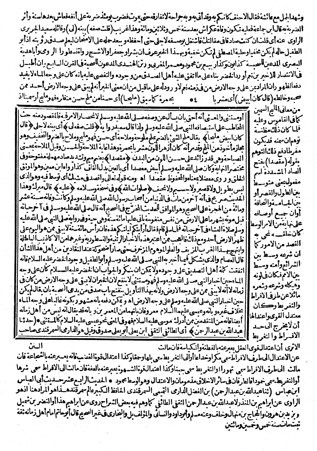 أَوْ مُسْتَثْنَى، وَالْمَعْنَى: أَنَّهُ أَحَقُّ بِأَنْ يُسْأَلَ عَنْ وَصْفِهِ صَلَّى اللَّهُ عَلَيْهِ وَسَلَّمَ لِانْحِصَارِ الْأَمْرِ فِيهِ، فَالْمَقْصُودُ مِنْهُ حَثُّ الْمُخَاطَبِ عَلَى اسْتِيصَافِهِ النَّبِيَّ صَلَّى اللَّهُ عَلَيْهِ وَسَلَّمَ وَلِذَا قَالَ سَعِيدٌ رَاوِيهِ. (قُلْتُ صِفْهُ لِي) : أَيْ بَيِّنْهُ لِأَجْلِي. (قَالَ كَانَ أَبْيَضَ مَلِيحًا) : يُقَالُ: مَلُحَ الشَّيْءُ بِالضَّمِّ يَمْلُحُ مُلُوحَةً وَمَلَاحَةً أَيْ حَسُنَ فَهُوَ مَلِيحٌ وَمُلَاحٌ بِالضَّمِّ وَالتَّخْفِيفِ، وَهُوَ مَجَازٌ مَأْخُوذٌ مِنَ الْمِلْحِ، وَقَدْ مَرَّ أَنَّهُ كَانَ أَزْهَرَ اللَّوْنِ مُشْرَبًا بِحُمْرَةٍ وَهَذَا غَايَةُ الْمَلَاحَةِ وَالْحُسْنِ، وَقِيلَ: الْمَلَاحَةُ بِمَعْنَى الصَّبَاحَةِ وَهِيَ قَدْرٌ زَائِدٌ عَلَى حُسْنِ اللَّوْنِ مِنَ الْبَدَنِ. (مُقَصَّدًا) : بِضَمِّ مِيمٍ وَتَشْدِيدِ صَادٍ مُهْمَلَةٍ مَفْتُوحَةٍ، وَفِي مُخْتَصَرِ النِّهَايَةِ: وَكَانَ صَلَّى اللَّهُ عَلَيْهِ وَسَلَّمَ أَبْيَضَ مُعَصِّدًا أَيْ بِالْعَيْنِ بَدَلَ الْقَافِ كَذَا رَوَاهُ ابْنُ مَعِينٍ وَهُوَ الْمُوَثَّقُ الْخَلْقِ، وَرُوِيَ: «مُعْضِلًا» بِمَعْنَاهُ وَالْمَحْفُوظُ مُقَصِّدًا، انْتَهَى. وَمِنْهُ قَوْلُهُ تَعَالَى: (وَاقْصِدْ فِي مَشْيِكَ) : أَيْ تَوَسَّطْ فِيهِ وَهُوَ الَّذِي لَيْسَ بِطَوِيلٍ وَلَا قَصِيرٍ وَلَا جَسِيمٍ وَلَا نَحِيفٍ. (صَلَوَاتُ اللَّهِ) : وَفِي نُسْخَةٍ «وَسَلَامُهُ» . (عَلَيْهِ) : قَالَ مِيرَكُ: وَهَذَا الْحَدِيثُ صَرِيحٌ فِي أَنَّهُ آخِرُ مَنْ مَاتَ فِي الدُّنْيَا مِنْ أَصْحَابِ رَسُولِ اللَّهِ صَلَّى اللَّهُ عَلَيْهِ وَسَلَّمَ، وَكَانَتْ وَفَاتُهُ سَنَةَ عَشْرٍ وَمِائَةٍ مِنَ الْهِجْرَةِ عَلَى الصَّحِيحِ وَهُوَ الْمُوَافِقُ لِلْحَدِيثِ الْمُخَرَّجِ فِي الصَّحِيحِ: أَنَّهُ قَالَ صَلَّى اللَّهُ عَلَيْهِ وَسَلَّمَ فِي آخِرِ حَيَاتِهِ قَبْلَ مَوْتِهِ بِشَهْرٍ «مَا عَلَى الْأَرْضِ مِنْ نَفْسٍ مَنْفُوسَةٍ يَأْتِي عَلَيْهَا مِائَةُ سَنَةٍ وَهِيَ حَيَّةٌ» ، وَفِي رِوَايَةٍ: صَلَّى النَّبِيُّ صَلَّى اللَّهُ عَلَيْهِ وَسَلَّمَ صَلَاةَ الْعِشَاءِ فِي آخِرِ حَيَاتِهِ فَلَمَّا سَلَّمَ قَامَ فَقَالَ: «أَرَأَيْتُكُمْ لَيْلَتَكُمْ هَذِهِ فَإِنَّ رَأْسَ مِائَةِ سَنَةٍ لَا يَبْقَى مِمَّنْ هُوَ الْيَوْمَ عَلَى ظَهْرِ الْأَرْضِ أَحَدٌ» . وَمَعَ ذَلِكَ فَالْعَجَبُ مِمَّنِ اعْتَبَرَ الْأَخْبَارَ الرَّتَنِيَّةَ وَالنُّسْطُورِيَّةَ وَغَيْرَهُمَا مِنَ الْأَكَاذِيبِ الْبَاطِلَةِ وَابْتَهَجَ بِهَذَا الْقُرْبِ الْمُزَيَّفِ وَالْعُلُوِّ الْمَوْهُومِ الْمُزَخْرَفِ حَتَّى صَارَ أُضْحُوكَةً عِنْدَ النَّقَّادِينَ مِنْ أَهْلِ هَذَا الشَّأْنِ، قَالَ الْعِصَامُ: وَالَّذِي يُشْكِلُ فِيمَا أَخْبَرَ بِهِ النَّبِيُّ صَلَّى اللَّهُ عَلَيْهِ وَسَلَّمَ وَأَبُو الطُّفَيْلِ وُجُودُ الْخَضِرِ عَلَيْهِ السَّلَامُ، فَإِنَّهُ اتَّفَقَتْ كَلِمَةُ أَهْلِ التَّصْدِيقِ عَلَى وُجُودِهِ وَلَا يُمْكِنُ أَنْ يُنْكَرَ، وَالْجَوَابُ أَنَّ الْخَضِرَ عَلَيْهِ السَّلَامُ كَانَ عَلَى وَجْهِ الْمَاءِ حِينَ إِخْبَارِ النَّبِيِّ صَلَّى اللَّهُ عَلَيْهِ وَسَلَّمَ، فَهُوَ مُسْتَثْنًى لَا يَنْفَعُ لِأَنَّ الْخَبَرَ أَنْ لَا يَبْقَى عَلَى وَجْهِ الْأَرْضِ مَنْ كَانَ فِي زَمَانِهِ لَا أَنَّهُ لَا يَبْقَى مِمَّنْ عَلَى وَجْهِ الْأَرْضِ وَلِأَنَّهُ بِهَذَا التَّأْوِيلِ يَنْفَتِحُ بَابُ صِدْقِ مَنْ يَدَّعِي الصُّحْبَةَ بِأَنْ يُقَالَ لَمْ يَكُنْ حِينَ إِخْبَارِ النَّبِيِّ عَلَى
