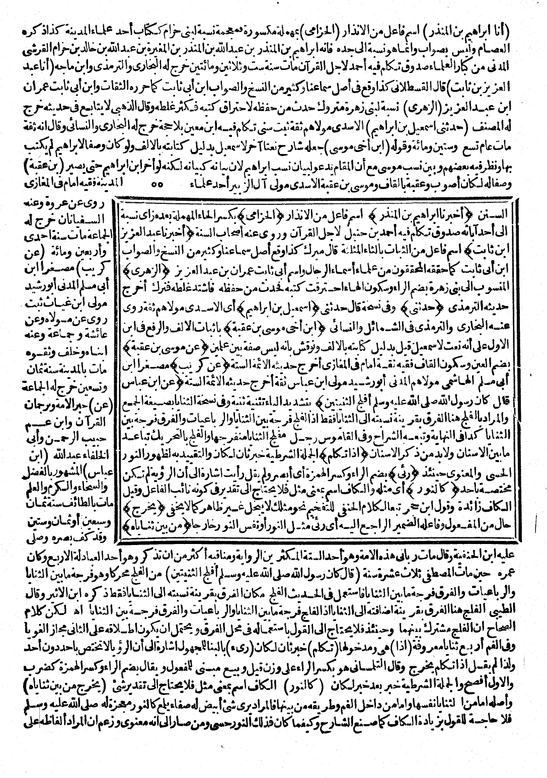 السُّنَنِ. (أَخْبَرَنَا إِبْرَاهِيمُ بْنُ الْمُنْذِرِ) : اسْمُ فَاعِلٍ مِنَ الْإِنْذَارِ. (الْحِزَامِيُّ) : بِكَسْرِ الْحَاءِ الْمُهْمَلَةِ بَعْدَهُ زَايٌ، نِسْبَةً إِلَى أَحَدِ آبَائِهِ، صَدُوقٌ، تَكَلَّمَ فِيهِ أَحْمَدُ بْنُ حَنْبَلٍ لِأَجْلِ الْقُرْآنِ، وَرَوَى عَنْهُ أَصْحَابُ السِّتَّةِ. (أَخْبَرَنَا عَبْدُ الْعَزِيزِ بْنُ ثَابِتٍ) : اسْمُ فَاعِلٍ مِنَ الثَّبَاتِ، بِالثَّاءِ الْمُثَلَّثَةِ، قَالَ مِيرَكُ: كَذَا وَقَعَ أَصْلُ سَمَاعِنَا وَكَثِيرٌ مِنَ النُّسَخِ، وَالصَّوَابُ «ابْنُ أَبِي ثَابِتٍ» كَمَا حَقَّقَهُ الْمُحَقِّقُونَ مِنْ عُلَمَاءِ أَسْمَاءِ الرِّجَالِ، وَاسْمُ «أَبِي ثَابِتٍ عِمْرَانُ بْنُ عَبْدِ الْعَزِيزِ» . (الزُّهْرِيُّ) : الْمَنْسُوبُ إِلَى بَنِي زُهْرَةَ، بِضَمِّ الزَّاءِ وَسُكُونِ الْهَاءِ، احْتَرَقَتْ كُتُبُهُ فَحَدَّثَ مِنْ حِفْظِهِ فَاشْتَدَّ غَلَطُهُ فَتُرِكَ، أَخْرَجَ حَدِيثَهُ التِّرْمِذِيُّ. (حَدَّثَنِي) : وَفِي نُسْخَةٍ «قَالَ حَدَّثَنِي» . (إِسْمَاعِيلُ بْنُ إِبْرَاهِيمَ) : أَيِ الْأَسَدِيُّ مَوْلَاهُمْ، ثِقَةٌ، رَوَى عَنْهُ الْبُخَارِيُّ وَالتِّرْمِذِيُّ - فِي الشَّمَائِلِ - وَالنَّسَائِيُّ. (ابْنُ أَخِي مُوسَى بْنِ عُقْبَةَ) : بِإِثْبَاتِ الْأَلِفِ وَالرَّفْعِ فِي ابْنٍ الْأَوَّلِ عَلَى أَنَّهُ نَعْتٌ لِإِسْمَاعِيلَ، قِيلَ: بِدَلِيلِ كِتَابَتِهِ بِالْأَلِفِ، وَنُوقِشَ بِأَنَّهُ لَيْسَ صِفَةً بَيْنَ عَلَمَيْنِ. (عَنْ مُوسَى بْنِ عُقْبَةَ) : بِضَمِّ الْعَيْنِ وَسُكُونِ الْقَافِ، فَقِيهٌ ثِقَةٌ، إِمَامٌ فِي الْمَغَازِي، أَخْرَجَ حَدِيثَهُ الْأَئِمَّةُ السِّتَّةُ. (عَنْ كُرَيْبٍ) : مُصَغَّرًا، ابْنُ أَبِي مُسْلِمٍ الْهَامِشِيُّ مَوْلَاهُمُ الْمَدَنِيُّ أَبُو رَشِيدٍ مَوْلَى ابْنِ عَبَّاسٍ، ثِقَةٌ، أَخْرَجَ حَدِيثَهُ الْأَئِمَّةُ السِّتَّةُ