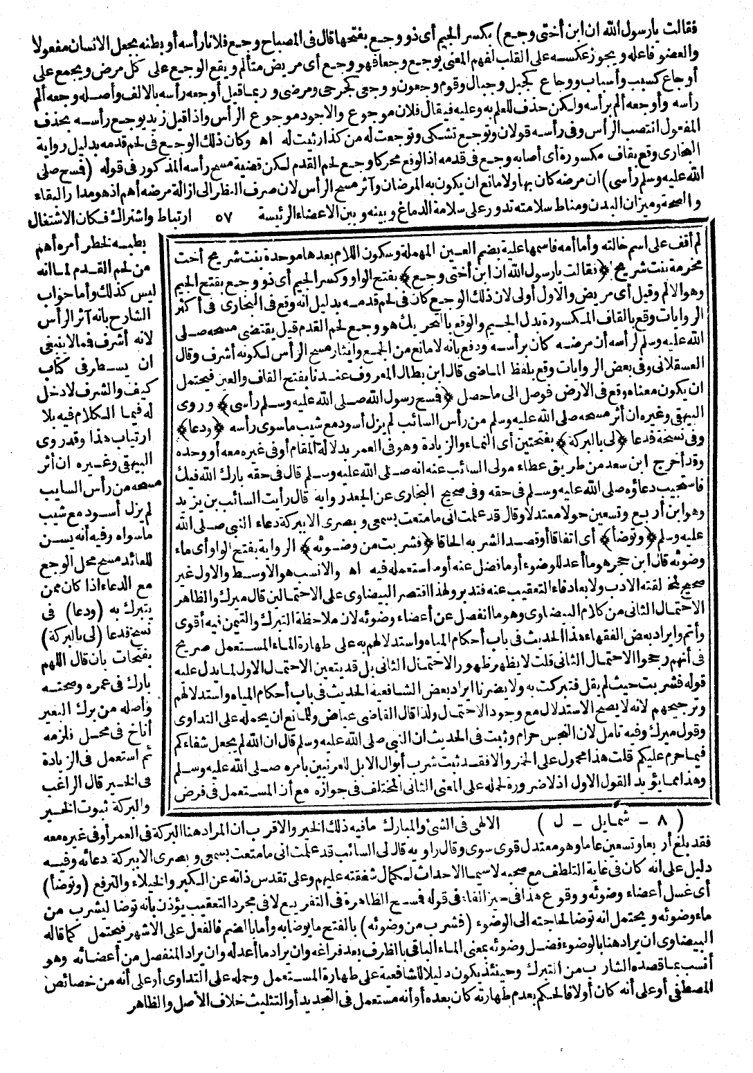 ابْنُ بَطَّالٍ: الْمَعْرُوفُ عِنْدَنَا بِفَتْحِ الْقَافِ وَالْعَيْنِ، فَيُحْتَمَلُ أَنْ يَكُونَ مَعْنَاهُ وَقَعَ فِي الْأَرْضِ فَوَصَلَ إِلَى مَا حَصَلَ. (فَمَسَحَ رَسُولُ اللَّهِ صَلَّى اللَّهُ عَلَيْهِ وَسَلَّمَ رَأْسِي) : وَرَوَى الْبَيْهَقِيُّ وَغَيْرُهُ أَنَّ أَثَرَ مَسْحِهِ صَلَّى اللَّهُ عَلَيْهِ وَسَلَّمَ مِنْ رَأْسِ السَّائِبِ لَمْ يَزَلْ أَسْوَدَ مَعَ شَيْبِ مَا سِوَى رَأْسِهِ. (وَدَعَا) : وَفِي نُسْخَةٍ «فَدَعَا» . (لِي بِالْبَرَكَةِ) : بِفَتْحَتَيْنِ، أَيِ: النَّمَاءِ وَالزِّيَادَةِ، وَهُوَ فِي الْعُمْرِ بِدَلَالَةِ الْمَقَامِ أَوْ فِي غَيْرِهِ مَعَهُ أَوْ وَحْدَهُ، وَقَدْ أَخْرَجَ ابْنُ سَعْدٍ مِنْ طَرِيقِ عَطَاءٍ مَوْلَى السَّائِبِ عَنْهُ أَنَّهُ صَلَّى اللَّهُ عَلَيْهِ وَسَلَّمَ قَالَ فِي حَقِّهِ: «بَارَكَ اللَّهُ فِيكَ» . فَاسْتُجِيبَ دُعَاؤُهُ صَلَّى اللَّهُ عَلَيْهِ وَسَلَّمَ فِي حَقِّهِ، وَفِي صَحِيحِ الْبُخَارِيِّ عَنِ الْجَعْدِ رَاوِيهِ قَالَ: رَأَيْتُ السَّائِبَ بْنَ يَزِيدَ وَهُوَ ابْنُ أَرْبَعٍ وَتِسْعِينَ حَوْلًا مُعْتَدِلًا، وَقَالَ: قَدْ عَلِمْتُ أَنِّي مَا مُتِّعْتُ بِسَمْعِي وَبَصَرِي إِلَّا بِبَرَكَةِ دُعَاءِ النَّبِيِّ صَلَّى اللَّهُ عَلَيْهِ وَسَلَّمَ. (وَتَوَضَّأَ) : أَيِ اتِّفَاقًا أَوْ قَصَدَ الشُّرْبَ إِلْحَاقًا. (فَشَرِبْتُ مِنْ وَضُوئِهِ) : الرِّوَايَةُ بِفَتْحِ الْوَاوِ، أَيْ: مَاءِ وُضُوئِهِ، قَالَ ابْنُ حَجَرٍ: هُوَ مَا أُعِدَّ لِلْوُضُوءِ أَوْ مَا فَضُلَ عَنْهُ أَوْ مَا اسْتَعْمَلَهُ فِيهِ، انْتَهَى. وَالْأَنْسَبُ هُوَ الْأَوْسَطُ، وَالْأَوَّلُ غَيْرُ صَحِيحٍ لِمُخَالَفَتِهِ الْأَدَبَ وَلِإِبْعَادِ فَاءِ التَّعْقِيبِ عَنْهُ، فَتَدَبَّرْ، وَلِهَذَا اقْتَصَرَ الْبَيْضَاوِيُّ عَلَى الِاحْتِمَالَيْنِ، قَالَ مِيرَكُ: وَالظَّاهِرُ الِاحْتِمَالُ الثَّانِي مِنْ كَلَامِ الْبَيْضَاوِيِّ، وَهُوَ مَا انْفَصَلَ عَنْ أَعْضَاءِ وَضَوْئِهِ ; لِأَنَّ مُلَاحَظَةَ التَّبَرُّكِ وَالتَّيَمُّنِ فِيهِ أَقْوَى وَأَتَمُّ، وَإِيرَادُ بَعْضِ الْفُقَهَاءِ هَذَا الْحَدِيثَ فِي بَابِ أَحْكَامِ الْمِيَاهِ وَاسْتِدْلَالِهِمْ بِهِ عَلَى طَهَارَةِ الْمَاءِ الْمُسْتَعْمَلِ صَرِيحٌ فِي أَنَّهُمْ رَجَّحُوا الِاحْتِمَالَ الْأَوَّلَ لِمَا يَدُلُّ عَلَيْهِ. قُلْتُ: لَا يَظْهَرُ ظُهُورُ الِاحْتِمَالِ الثَّانِي، بَلْ قَدْ يَتَعَيَّنُ الِاحْتِمَالُ الْأَوَّلُ لِمَا يَدُلُّ عَلَيْهِ قَوْلُهُ: «فَشَرِبْتُ» حَيْثُ لَمْ يَقُلْ «فَتَبَرَّكْتُ بِهِ» ، وَلَا يَضُرُّنَا إِيرَادُ بَعْضِ الشَّافِعِيَّةِ الْحَدِيثَ فِي بَابِ أَحْكَامِ الْمِيَاهِ وَاسْتِدْلَالُهُمْ وَتَرْجِيحُهُمْ ; لِأَنَّهُ لَا يَصِحُّ الِاسْتِدْلَالُ مَعَ وُجُودِ الِاحْتِمَالِ، وَلِذَا قَالَ الْقَاضِي عِيَاضٌ: وَلِلْمَانِعِ أَنْ يَحْمِلَهُ عَلَى التَّدَاوِي، وَقَوْلُ مِيرَكَ: وَفِيهِ تَأَمُّلٌ ; لِأَنَّ النَّجِسَ حَرَامٌ، وَثَبَتَ فِي الْحَدِيثِ أَنَّ النَّبِيَّ صَلَّى اللَّهُ عَلَيْهِ وَسَلَّمَ قَالَ: «إِنَّ اللَّهَ لَمْ يَجْعَلْ شِفَاءَكُمْ فِيمَا حُرِّمَ عَلَيْكُمْ» ، قُلْتُ: هَذَا مَحْمُولٌ عَلَى الْخَمْرِ وَإِلَّا فَقَدْ ثَبَتَ شُرْبُ أَبْوَالِ الْإِبِلِ لِلْعُرَنِيِّينَ بِأَمْرِهِ صَلَّى اللَّهُ عَلَيْهِ وَسَلَّمَ، وَهَذَا مِمَّا يُؤَيِّدُ الْقَوْلَ الْأَوَّلَ إِذْ لَا ضَرُورَةَ لِحَمْلِهِ عَلَى الْمَعْنَى الثَّانِي الْمُخْتَلَفِ فِي جَوَازِهِ مَعَ أَنَّ الْمُسْتَعْمَلَ فِي فَرْضِ