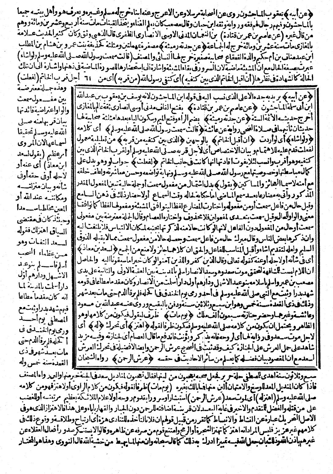 لَا سِيَّمَا الْعَجَائِزَ وَالْمَسَاكِينَ. (يَقُولُ) : بَدَلُ اشْتِمَالٍ مِنْ مَفْعُولِ «سَمِعْتُ» أَوْ جُمْلَةٌ حَالِيَّةٌ تُبَيِّنُ الْمَفْعُولَ الْمُقَدَّرَ الْمَذْكُورَ، وَأُتِيَ بِهِ مُضَارِعًا بَعْدَ «سَمِعَ» الْمَاضِي إِمَّا حِكَايَةً لِحَالِهِ وَقْتَ السَّمَاعِ أَوْ لِإِحْضَارِ ذَلِكَ فِي ذِهْنِ السَّامِعِ، وَقِيلَ: حَالٌ مِنْ فَاعِلِ «سَمِعْتُ» أَوْ مِنْ مَفْعُولِهِ، وَاخْتَارَتِ الْمُضَارِعَ لَفْظًا لِيَتَوَافَقَ الْمَشِيئَةُ وَمَفْعُولُهَا لَفْظًا كَمَا تَوَافَقَا مَعْنًى وَالْوَاوُ لِلْحَالِ، وَقِيلَ: «سَمِعْتُ» يَتَعَدَّى لِمَفْعُولَيْنِ فَلَا مَحْذُوفَ، وَاخْتَارَهُ الْعِصَامُ وَقَالَ: الْجُمْلَةُ مُعْتَرِضَةٌ بَيْنَ مَفْعُولَيْ سَمِعْتُ أَوْ حَالٌ مِنَ الْمَفْعُولِ دُونَ الْفَاعِلِ ; لِأَنَّهَا لَوْ كَانَتْ حَالًا مِنْهُ لَذَكَرَتْهَا بِجَنْبِهِ لِمَكَانِ الِالْتِبَاسِ فَلَا يُلْتَفَتُ إِلَيْهِ، وَإِنْ ذَكَرَهَا بَعْضُ النَّاسِ، وَقَالَ مِيرَكُ: حَالٌ مِنْ فَاعِلِ «سَمِعْتُ» وَجَعْلُهُ حَالًا مِنْ مَفْعُولِ «سَمِعْتُ» مِمَّا لَا يَقْبَلُهُ الذَّوْقُ السَّلِيمُ، وَلَعَلَّهُ لِتَقْدِيمِ «أَشَاءُ» وَأُقَبِّلُ الْمُنَاسِبُ لِلْفَاعِلِ، وَالْحَقُّ أَنَّ كِلَاهُمَا جَائِزٌ وَلَا مَنْعَ مِنَ الْجَمْعِ. (لِسَعْدِ بْنِ مُعَاذٍ) : أَيْ فِي شَأْنِهِ أَوْ لِأَجْلِهِ أَوْ عَنْهُ لِقَوْلِهِ تَعَالَى: (وَقَالَ الَّذِينَ كَفَرُوا لِلَّذِينَ آمَنُوا لَوْ كَانَ خَيْرًا مَا سَبَقُونَا إِلَيْهِ) ، وَالْحَاصِلُ أَنَّ اللَّامَ لَيْسَتْ لِلْمُشَافَهَةِ لَتَحَقُقِ مَوْتُ سَعْدٍ، وَهُوَ سَيِّدُ الْأَنْصَارِ، أَسْلَمَ بِالْمَدِينَةِ بَيْنَ الْعَقَبَةِ الْأُولَى وَالثَّانِيَةِ عَلَى يَدَيْ مُصْعَبِ بْنِ عُمَيْرٍ، وَأَسْلَمَ بِإِسْلَامِهِ بَنُو عَبْدِ الْأَشْهَلِ، وَدَارُهُمْ أَوَّلُ دَارٍ أَسْلَمَتْ مِنَ الْأَنْصَارِ، وَكَانَ مُقَدَّمًا مُطَاعًا فِي قَوْمِهِ، شَهِدَ بَدْرًا، وَثَبَتَ مَعَ النَّبِيِّ صَلَّى اللَّهُ عَلَيْهِ وَسَلَّمَ فِي أُحُدٍ، وَرُمِيَ يَوْمَ الْخَنْدَقِ فِي أَكْحَلِهِ فَلَمْ يَرْقَأِ الدَّمُ حَتَّى مَاتَ بَعْدَ شَهْرٍ وَذَلِكَ فِي ذِي الْقِعْدَةِ سَنَةَ خَمْسٍ وَهُوَ ابْنُ سَبْعٍ وَثَلَاثِينَ سَنَةً، وَدُفِنَ بِالْبَقِيعِ، وَرَوَى عَنْهُ عَبْدُ اللَّهِ بْنُ مَسْعُودٍ وَعَائِشَةُ وَغَيْرُهُمَا، وَحَضَرَ جَنَازَتَهُ سَبْعُونَ أَلْفَ مَلَكٍ. (يَوْمَ مَاتَ) : ظَرْفٌ لِيَقُولُ، فَيَكُونُ مِنْ كِلَاهُمَا وَهُوَ الظَّاهِرُ، وَيُحْتَمَلُ أَنْ يَكُونَ مِنْ كَلَامِهِ صَلَّى اللَّهُ عَلَيْهِ وَسَلَّمَ فَيَكُونَ ظَرْفًا لِقَوْلِهِ. (اهْتَزَّ) : أَيْ تَحَرَّكَ. (لَهُ) : أَيْ لِأَجْلِ مَوْتِ سَعْدٍ، وَفِي رِوَايَةٍ: «لَهَا» أَيْ: لِرُوحِهِ فَإِنَّهُ يُذَكَّرُ وَيُؤَنَّثُ، فَانْدَفَعَ مَا قَالَ الْعِصَامُ أَيْ لِجَنَازَتِهِ، وَفِيهِ مَزِيدُ شَاهِدٍ عَلَى حَمْلِ الْعَرْشِ عَلَى الْجَنَازَةِ كَيْفَ وَقَدْ ثَبَتَ فِي الصَّحِيحِ: «عَرْشُ الرَّحْمَنِ» ، وَأَيْضًا لَا فَضِيلَةَ فِي تَحَرُّكِ الْعَرْشِ لِسَعْدٍ مَعَ أَنَّ الْمَقْصُودَ بَيَانُ فَضْلِهِ كَمَا يُعْلَمُ مِنْ سَائِرِ الْأَحَادِيثِ فِي حَقِّهِ. (عَرْشُ الرَّحْمَنِ) : رَوَاهُ الشَّيْخَانِ