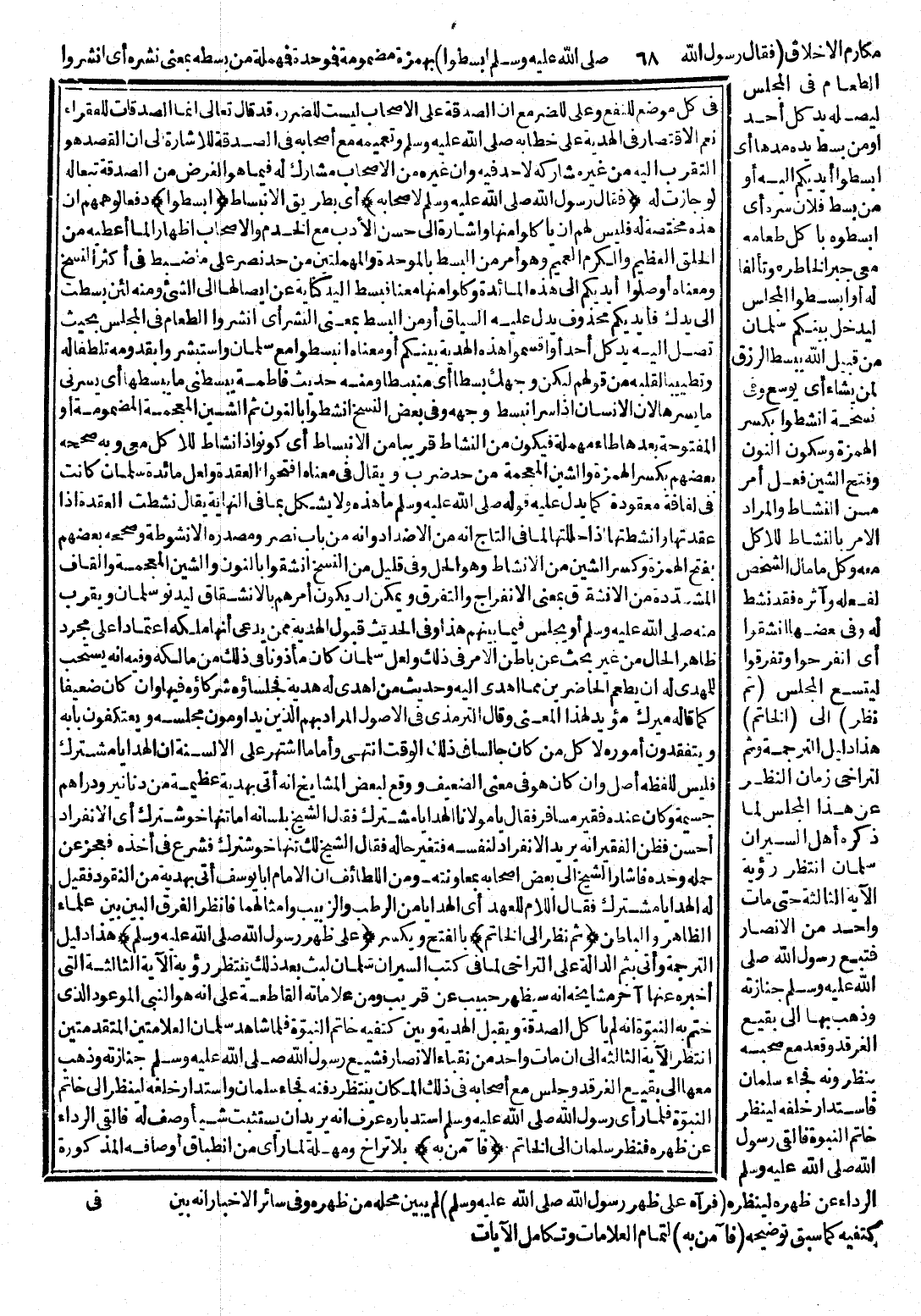لِنَفْسِهِ فَتَغَيَّرَ حَالُهُ، فَقَالَ الشَّيْخُ: لَكَ تَنْهَا خُوشْتَرْكْ، فَشَرَعَ فِي أَخْذِهِ، فَعَجَزَ عَنْ حَمْلِهِ وَحْدَهُ، فَأَشَارَ الشَّيْخُ إِلَى بَعْضِ أَصْحَابِهِ بِمُعَاوَنَتِهِ. وَمِنَ اللَّطَائِفِ أَنَّ الْإِمَامَ أَبَا يُوسُفَ أُتِيَ بِهَدِيَّةٍ مِنَ النُّقُودِ فَقِيلَ لَهُ: الْهَدَايَا مُشْتَرَكٌ، فَقَالَ: اللَّامُ لِلْعَهْدِ ; أَيْ: الْهَدَايَا مِنَ الرُّطَبِ وَالزَّبِيبِ وَأَمْثَالِهَا، فَانْظُرِ الْفَرْقَ الْبَيِّنَ بَيْنَ عُلَمَاءِ الظَّاهِرِ وَالْبَاطِنِ. (ثُمَّ نَظَرَ إِلَى الْخَاتَمِ) : بِالْفَتْحِ وَيُكْسَرُ. (عَلَى ظَهْرِ رَسُولِ اللَّهِ صَلَّى اللَّهُ عَلَيْهِ وَسَلَّمَ) : هَذَا دَلِيلُ التَّرْجَمَةِ، وَأَتَى بِثُمَّ الدَّالَّةَ عَلَى التَّرَاخِي لِمَا فِي كُتُبِ السِّيَرِ أَنَّ سَلْمَانَ لَبِثَ بَعْدَ ذَلِكَ يَنْتَظِرُ رُؤْيَةَ الْآيَةِ الثَّالِثَةِ الَّتِي أَخْبَرَهُ عَنْهَا آخِرُ مَشَايِخِهِ، أَنَّهُ سَيَظْهَرُ حَبِيبٌ عَنْ قَرِيبٍ وَمِنْ عَلَامَاتِهِ الْقَاطِعَةِ عَلَى أَنَّهُ هُوَ النَّبِيُّ الْمَوْعُودُ الَّذِي خُتِمَ بِهِ النُّبُوَّةِ أَنَّهُ لَمْ يَأْكُلِ الصَّدَقَةَ وَيَقْبَلُ الْهَدِيَّةَ، وَبَيْنَ كَتِفَيْهِ خَاتَمُ النُّبُوَّةِ، فَلَمَّا شَاهَدَ سَلْمَانُ الْعَلَامَتَيْنِ الْمُتَقَدِّمَتَيْنِ انْتَظَرَ الْآيَةَ الثَّالِثَةَ إِلَى أَنْ مَاتَ وَاحِدٌ مِنْ نُقَبَاءَ الْأَنْصَارِ فَشَيَّعَ رَسُولُ اللَّهِ صَلَّى اللَّهُ عَلَيْهِ وَسَلَّمَ جَنَازَتَهُ، وَذَهَبَ مَعَهَا إِلَى بَقِيعِ الْغَرْقَدِ، وَجَلَسَ مَعَ أَصْحَابِهِ فِي ذَلِكَ الْمَكَانِ يَنْتَظِرُ دَفْنَهُ، فَجَاءَ سَلْمَانُ وَاسْتَدَارَ خَلْفَهُ لِيَنْظُرَ إِلَى خَاتَمِ النُّبُوَّةِ، فَلَمَّا رَأَى رَسُولُ اللَّهِ صَلَّى اللَّهُ عَلَيْهِ وَسَلَّمَ اسْتِدْبَارَهُ عَرَفَ أَنَّهُ يُرِيدُ أَنْ يَسْتَثْبِتَ شَيْئًا وُصِفَ لَهُ، فَأَلْقَى الرِّدَاءَ عَنْ ظَهْرِهِ فَنَظَرَ سَلْمَانُ إِلَى الْخَاتَمِ. (فَآمَنَ بِهِ) : بِلَا تَرَاخٍ وَمُهْلَةٍ لَمَّا رَأَى مِنَ انْطِبَاقِ أَوْصَافِهِ الْمَذْكُورَةِ فِي
