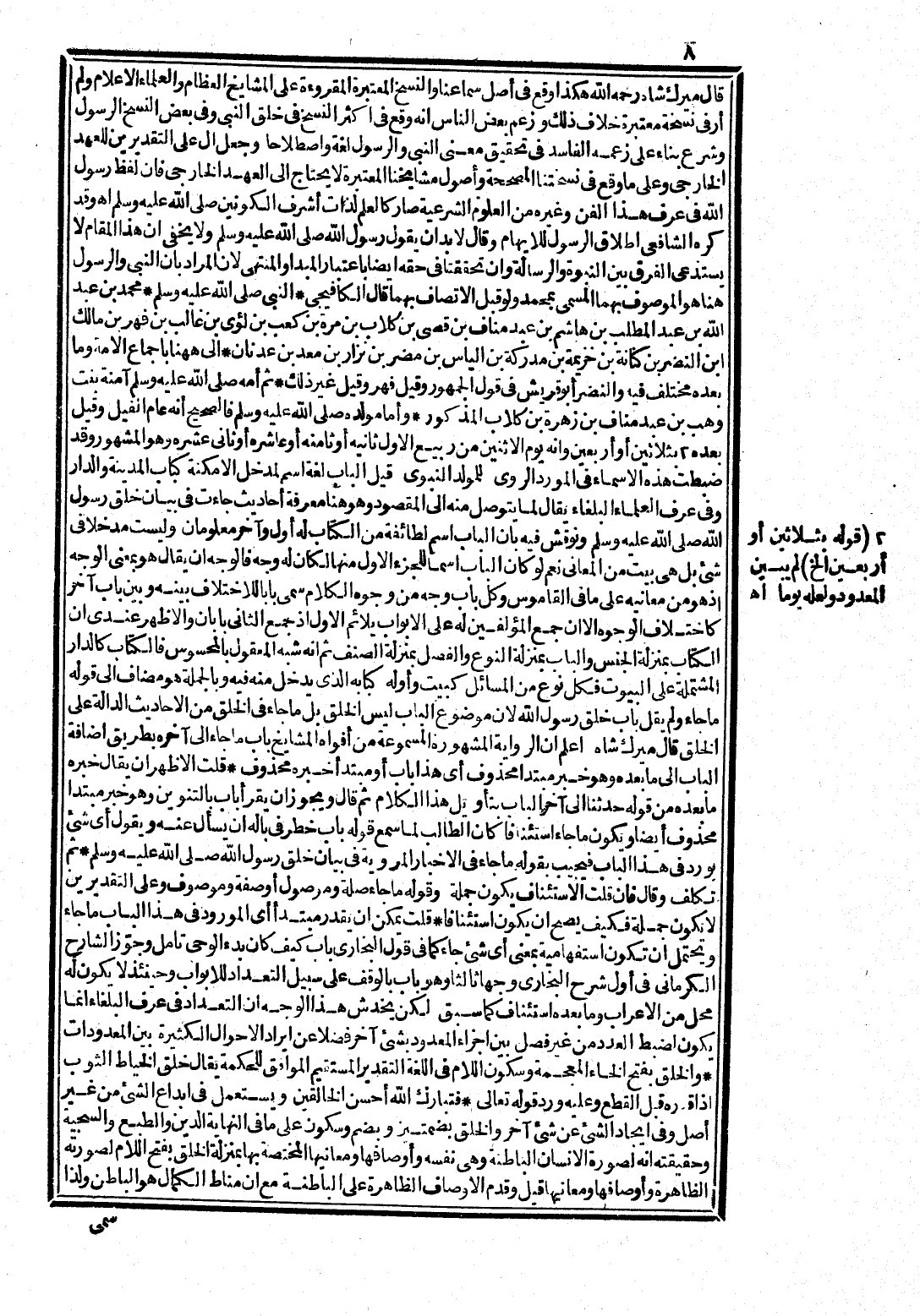 قَالَ مِيرَكُ شَاهْ رَحِمَهُ اللَّهُ: هَكَذَا وَقَعَ فِي أَصْلِ سَمَاعِنَا وَالنُّسَخِ الْمُعْتَبَرَةِ الْمَقْرُوءَةِ عَلَى الْمَشَايِخِ الْعِظَامِ وَالْعُلَمَاءِ الْأَعْلَامِ، وَلَمْ أَرَ فِي نُسْخَةٍ مُعْتَبِرَةٍ خِلَافَ ذَلِكَ، وَزَعَمَ بَعْضُ النَّاسِ أَنَّهُ وَقَعَ فِي أَكْثَرِ النُّسَخِ فِي خَلْقِ النَّبِيِّ، وَفِي بَعْضِ النُّسَخِ الرَّسُولِ، وَشَرَعَ بِنَاءً عَلَى زَعْمِهِ الْفَاسِدِ فِي تَحْقِيقِ مَعْنَى النَّبِيِّ وَالرَّسُولِ لُغَةً وَاصْطِلَاحًا وَجَعْلَ أَلْ عَلَى التَّقْدِيرَيْنِ لِلْعَهْدِ الْخَارِجِيِّ وَعَلَى مَا وَقَعَ فِي نُسْخَتِنَا الْمُصَحَّحَةِ وَأُصُولِ مَشَايِخِنَا الْمُعْتَبَرَةِ لَا يَحْتَاجُ إِلَى الْعَهْدِ الْخَارِجِيِّ فَإِنَّ لَفْظَ رَسُولِ اللَّهِ فِي عُرْفِ هَذَا الْفَنِّ وَغَيْرِهِ مِنَ الْعُلُومِ الشَّرْعِيَّةِ صَارَ كَالْعَلَمِ لِذَاتِ أَشْرَفِ الْكَوْنَيْنِ صَلَّى اللَّهُ عَلَيْهِ وَسَلَّمَ، انْتَهَى. وَقَدْ كَرِهَ الشَّافِعِيُّ إِطْلَاقَ الرَّسُولِ لِلْإِيهَامِ، وَقَالَ لَا بُدَّ أَنْ يَقُولَ رَسُولُ اللَّهِ صَلَّى اللَّهُ عَلَيْهِ وَسَلَّمَ وَلَا يَخْفَى أَنَّ هَذَا الْمَقَامَ لَا يَسْتَدْعِي الْفَرْقَ بَيْنَ النُّبُوَّةِ وَالرِّسَالَةِ وَإِنْ تَحَقَّقَتَا فِي حَقِّهِ أَيْضًا بِاعْتِبَارِ الْمَبْدَأِ وَالْمُنْتَهَى ; لِأَنَّ الْمُرَادَ بِأَنَّ النَّبِيَّ وَالرَّسُولَ هُنَا هُوَ الْمَوْصُوفُ بِهِمَا الْمُسَمَّى بِمُحَمَّدٍ وَلَوْ قَبْلَ الِاتِّصَافِ بِهِمَا، قَالَ الْكَافِيَجِيُّ: النَّبِيُّ صَلَّى اللَّهُ عَلَيْهِ وَسَلَّمَ مُحَمَّدُ بْنُ عَبْدِ اللَّهِ بْنِ عَبْدِ الْمُطَّلِبِ بْنِ هَاشِمِ بْنِ عَبْدِ مَنَافِ بْنِ قُصَيِّ بْنِ كِلَابِ بْنِ مُرَّةَ بْنِ كَعْبِ بْنِ لُؤَيِّ بْنِ غَالِبِ بْنِ فِهْرِ بْنِ مَالِكِ بْنِ النَّضْرِ بْنِ كِنَانَةَ بْنِ خُزَيْمَةَ بْنِ مُدْرِكَةَ بْنِ إِلْيَاسَ بْنِ مُضَرَ بْنِ نِزَارِ بْنِ مَعَدِّ بْنِ عَدْنَانَ، إِلَى هَاهُنَا بِإِجْمَاعِ الْأُمَّةِ وَمَا بَعْدَهُ مُخْتَلَفٌ فِيهِ، وَالنَّضْرُ أَبُو قُرَيْشٍ فِي قَوْلِ الْجُمْهُورِ وَقِيلَ فِهْرٌ وَقِيلَ غَيْرُ ذَلِكَ. ثُمَّ أُمُّهُ صَلَّى اللَّهُ عَلَيْهِ وَسَلَّمَ آمِنَةُ بِنْتُ وَهْبِ بْنِ عَبْدِ مَنَافِ بْنِ زُهْرَةَ بْنِ كِلَابٍ الْمَذْكُورِ. وَأَمَّا مَوْلِدُهُ صَلَّى اللَّهُ عَلَيْهِ وَسَلَّمَ فَالصَّحِيحُ أَنَّهُ عَامَ الْفِيلِ، وَقِيلَ بَعْدَهُ بِثَلَاثِينَ أَوْ أَرْبَعِينَ وَأَنَّهُ يَوْمُ الْإِثْنَيْنِ مِنْ رَبِيعٍ الْأَوَّلِ ثَانِيهِ أَوْ ثَامِنِهِ أَوْ عَاشِرِهِ أَوْ ثَانِي عَشَرِهِ وَهُوَ الْمَشْهُورُ، وَقَدْ ضَبَطْتُ هَذِهِ الْأَسْمَاءَ فِي الْمَوْرِدِ الرَّوِيِّ لِلْمَوْلِدِ النَّبَوِيِّ.