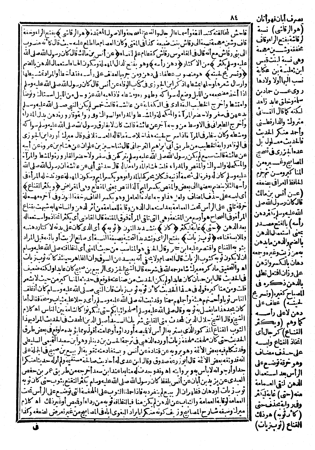 وَشِينٍ مُعْجَمَةٍ، نِسْبَةً إِلَى رَقَاشِ بِنْتِ ضُبَيْعَةَ، كَذَا فِي الْمُغْنِي، وَكَأَنَّ الْعِصَامَ مَا اطَّلَعَ عَلَيْهِ حَيْثُ قَالَ: كَأَنَّهُ مَنْسُوبٌ إِلَى بَنِي رَقَاشٍ مَعَ أَنَّهُ قَالَ فِي الْقَامُوسِ: رَقَاشِ كَقَطَامِ ; عَلَمٌ لِلنِّسَاءِ. (عَنْ أَنَسِ بْنِ مَالِكٍ قَالَ: كَانَ رَسُولُ اللَّهِ صَلَّى اللَّهُ عَلَيْهِ وَسَلَّمَ يُكْثِرُ) : مِنَ الْإِكْثَارِ. (دَهْنَ رَأْسِهِ) : وَهُوَ بِفَتْحِ الدَّالِ الْمُهْمَلَةِ وَسُكُونِ الْهَاءِ، اسْتِعْمَالُ الدُّهْنِ بِالضَّمِّ. (وَتَسْرِيحَ لِحْيَتِهِ) : هُوَ مَنْصُوبٌ عَطْفًا عَلَى دَهْنِ، وَمَنْ جَرَّهُ بِالْعَطْفِ عَلَى رَأْسِهِ قَدْ أَخْطَأَ، وَالْمُرَادُ تَمْشِيطُهَا وَإِرْسَالُ شَعْرِهَا وَحَلُّهَا بِمَشْطِهَا. ذَكَرَ ابْنُ الْجَوْزِيِّ فِي كِتَابِ الْوَفَاءِ عَنْ أَنَسٍ قَالَ: كَانَ رَسُولُ اللَّهِ صَلَّى اللَّهُ عَلَيْهِ وَسَلَّمَ إِذَا أَخَذَ مِضْجَعَهُ مِنَ اللَّيْلِ وُضِعَ لَهُ سِوَاكُهُ وَطَهُورُهُ وَمُشْطُهُ، فَإِذَا هَبَّهُ اللَّهُ عَزَّ وَجَلَّ مِنَ اللَّيْلِ اسْتَاكَ وَتَوَضَّأَ وَامْتَشَطَ. وَأَخْرَجَ الْخَطِيبُ الْبَغْدَادِيُّ فِي الْكِفَايَةِ عَنْ عَائِشَةَ قَالَتْ: خَمْسٌ لَمْ يَكُنِ النَّبِيُّ صَلَّى اللَّهُ عَلَيْهِ وَسَلَّمَ يَدَعُهُنَّ فِي سِفْرٍ وَلَا حَضَرٍ: الْمِرْآةُ، وَالْمُكْحُلَةُ، وَالْمُشْطُ، وَالْمَدْرَاءُ، وَالسِّوَاكُ. وَفِي رِوَايَةٍ: وَقَارُورَةُ دُهْنٍ، بَدَلَ الْمَدْرَاءِ. وَأَخْرَجَ الطَّبَرَانِيُّ فِي الْأَوْسَطِ مِنْ وَجْهٍ آخَرَ عَنْ عَائِشَةَ قَالَتْ: كَانَ لَا يُفَارِقُ رَسُولَ اللَّهِ صَلَّى اللَّهُ عَلَيْهِ وَسَلَّمَ سِوَاكُهُ وَمُشْطُهُ، وَكَانَ يَنْظُرُ فِي الْمِرْآةِ إِذَا سَرَّحَ لِحْيَتَهُ. هَذَا خُلَاصَةُ مَا قَالَهُ الْعَسْقَلَانِيُّ، وَقَالَ مِيرَكُ: أَوْرَدَ ابْنُ الْجَوْزِيِّ فِي الْوَفَاءِ رِوَايَةَ الْخَطِيبِ مِنْ طَرِيقِ أَبِي إِبْرَاهِيمَ التُّرْجُمَانِيِّ قَالَ: ثَنَا حُسَيْنُ بْنُ عُلْوَانَ، عَنْ هِشَامِ بْنِ عُرْوَةَ، عَنْ أَبِيهِ، عَنْ عَائِشَةَ قَالَتْ: سَبْعٌ لَمْ يَكُنْ رَسُولُ اللَّهِ صَلَّى اللَّهُ عَلَيْهِ وَسَلَّمَ يَتْرُكُهُنَّ فِي سِفْرٍ وَلَا حَضَرٍ: الْقَارُورَةُ، وَالْمُشْطُ، وَالْمِرْآةُ، وَالْمُكْحُلَةُ، وَالسِّوَاكُ، وَالْمِقَصُّ، وَالْمَدْرَاءُ. قُلْتُ لِهُشَامٍ: الْمَدْرَاءُ! مَا بَالُهُ؟ قَالَ: حَدَّثَنِي أَبِي عَنْ عَائِشَةَ أَنَّ رَسُولَ اللَّهِ صَلَّى اللَّهُ عَلَيْهِ وَسَلَّمَ كَانَ لَهُ وَفْرَةٌ إِلَى شَحْمَةِ أُذُنَيْهِ فَكَانَ يُحَرِّكُهَا بِالْمَدْرَاءِ. وَهُوَ بِكَسْرِ الْمِيمِ وَسُكُونِ الْمُهْمَلَةِ: عُودٌ تُدْخِلُهُ الْمَرْأَةُ فِي رَأْسِهَا لِئَلَّا يَنْضَمَّ بَعْضُهَا إِلَى بَعْضٍ، وَالْمِقَصُّ بِكَسْرِ الْمِيمِ: آلَةُ الْقَصِّ، بِمَعْنَى الْمُقَطِّعِ وَهِيَ الْمِقْرَاضُ. (وَيُكْثِرُ الْقِنَاعَ) : أَيْ لُبْسَهُ عَلَى حَذْفِ الْمُضَافِ، وَلَعَلَّ هَذَا عَلَى وَجْهِ إِعَادَةِ الْعَامِلِ وَهُوَ بِكَسْرِ الْقَافِ وَخِفَّةِ النُّونِ وَفِي آخِرِهِ مُهْمَلَةٌ، خِرْقَةٌ تُلْقَى عَلَى الرَّأْسِ تَحْتَ الْعِمَامَةِ بَعْدَ اسْتِعْمَالِ الدُّهْنِ وِقَايَةً لِلْعِمَامَةِ مِنْ أَثَرِ الدُّهْنِ وَاتِّسَاخِهَا بِهِ، شَبِيهٌ بِقِنَاعِ الْمَرْأَةِ، وَفِي الصِّحَاحِ: هُوَ أَوْسَعُ مِنَ الْمِقْنَعَةِ وَهِيَ الَّتِي تُلْقِي الْمَرْأَةُ فَوْقَ الْمِقْنَعَةِ. قَالَ الْقَاضِي: أَيْ يُكْثِرُ اتِّخَاذَهُ وَاسْتِعْمَالَهُ بَعْدَ الدُّهْنِ. (حَتَّى) : غَايَةٌ لِيُكْثِرَ. (كَأَنَّ) : بِتَشْدِيدِ النُّونِ. (ثَوْبَهُ) : أَيِ الَّذِي كَانَ عَلَى بَدَنِهِ لِإِكْثَارِ دَهْنِهِ وَلِمُلَابَسَتِهِ قِنَاعَهُ. (ثَوْبُ زَيَّاتٍ) : بِفَتْحِ