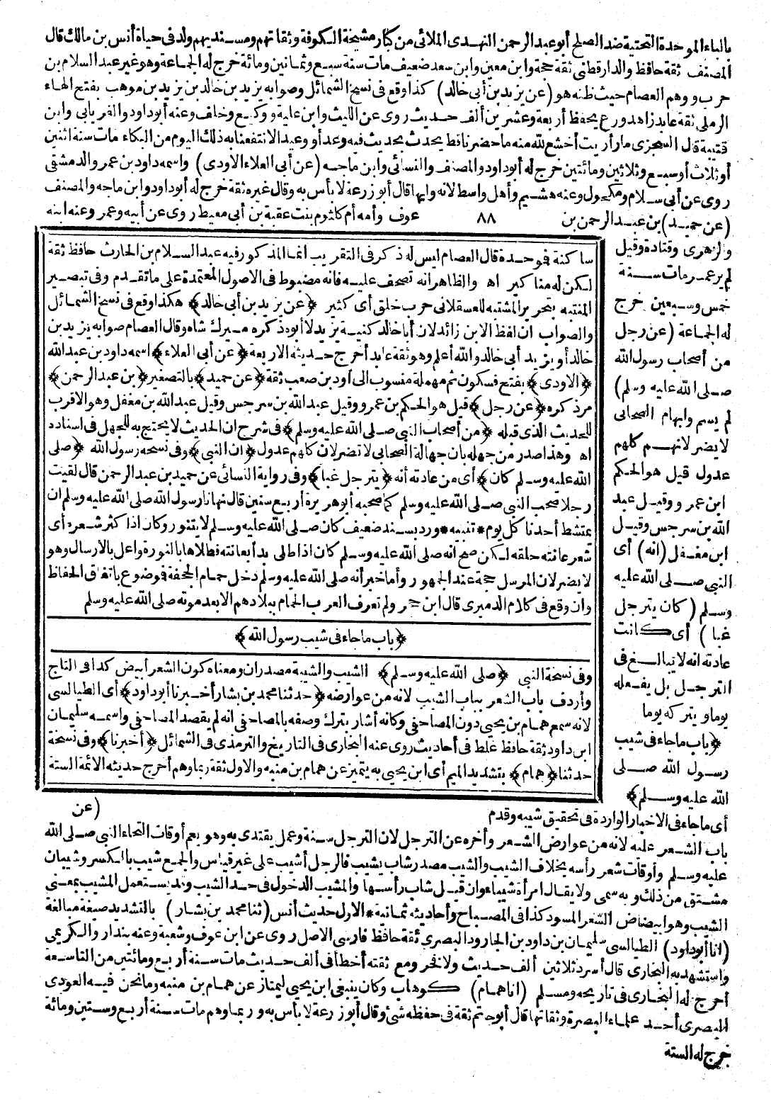 سَاكِنَةٍ فَمُوَحَّدَةٍ، قَالَ الْعِصَامُ: لَيْسَ لَهُ ذِكْرٌ فِي التَّقْرِيبِ إِنَّمَا الْمَذْكُورُ فِيهِ عَبْدُ السَّلَامِ بْنُ الْحَارِثِ، حَافِظٌ، ثِقَةٌ، لَكِنْ لَهُ مَنَاكِيرُ، انْتَهَى. وَالظَّاهِرُ أَنَّهُ تَصَحَّفَ عَلَيْهِ فَإِنَّهُ مَضْبُوطٌ فِي الْأُصُولِ الْمُعْتَمَدَةِ عَلَى مَا تَقَدَّمَ، وَفِي تَبْصِيرُ الْمُنْتَبِهِ بِتَحْرِيرِ الْمُشْتَبَهِ لِلْعَسْقَلَانِيِّ: حَرْبٌ خَلْقٌ أَيْ كَثِيرٌ. (عَنْ يَزِيدَ بْنِ أَبِي خَالِدٍ) : هَكَذَا وَقَعَ فِي نَسْخِ الشَّمَائِلِ، وَالصَّوَابُ أَنَّ لَفْظَ الِابْنِ زَائِدٌ لِأَنَّ أَبَا خَالِدٍ كُنْيَةُ يَزِيدَ لَا أَبُوهُ، ذَكَرَهُ مِيرَكُ شَاهْ، وَقَالَ الْعِصَامُ: صَوَابُهُ يَزِيدُ بْنُ خَالِدٍ أَوْ يَزِيدُ أَبِي خَالِدٍ، وَاللَّهُ أَعْلَمُ، وَهُوَ ثِقَةٌ، عَابِدٌ، أَخْرَجَ حَدِيثَهُ الْأَرْبَعَةُ. (عَنْ أَبِي الْعَلَاءِ) : اسْمُهُ دَاوُدُ بْنُ عَبْدِ اللَّهِ. (الْأَوْدِيُّ) : بِفَتْحٍ فَسُكُونٍ ثُمَّ مُهْمَلَةٍ، مَنْسُوبٌ إِلَى أَوْدِ بْنِ صَعْبٍ، ثِقَةٌ. (عَنْ حُمَيْدِ) : بِالتَّصْغِيرِ. (بْنِ عَبْدِ الرَّحْمَنِ) : مَرَّ ذِكْرُهُ. (عَنْ رَجُلٍ) : قِيلَ هُوَ الْحَكَمُ بْنُ عَمْرٍو، وَقِيلَ عَبْدُ اللَّهِ بْنُ سَرْجِسَ، وَقِيلَ عَبْدُ اللَّهِ بْنُ مُغَفَّلٍ، وَهُوَ الْأَقْرَبُ لِلْحَدِيثِ الَّذِي قَبْلَهُ. (مِنْ أَصْحَابِ النَّبِيِّ صَلَّى اللَّهُ عَلَيْهِ وَسَلَّمَ) : فِي شَرْحٍ أَنَّ الْحَدِيثَ لَا يُحْتَجُّ بِهِ لِلْجَهْلِ فِي إِسْنَادِهِ، انْتَهَى. وَهَذَا صَدَرَ مِنْ جَهْلِهِ بِأَنَّ جَهَالَةَ الصَّحَابِيِّ لَا تَضُرُّ لِأَنَّ كُلَّهُمْ عُدُولٌ. (أَنَّ النَّبِيَّ) : وَفِي نُسْخَةٍ «رَسُولَ اللَّهِ» . (صَلَّى اللَّهُ عَلَيْهِ وَسَلَّمَ كَانَ) : أَيْ مِنْ عَادَتِهِ أَنَّهُ (يَتَرَجَّلُ غِبًّا) : وَفِي رِوَايَةِ النَّسَائِيِّ عَنْ حُمَيْدِ بْنِ عَبْدِ الرَّحْمَنِ قَالَ: لَقِيتُ رَجُلًا صَحِبَ النَّبِيَّ صَلَّى اللَّهُ عَلَيْهِ وَسَلَّمَ كَمَا صَحِبَهُ أَبُو هُرَيْرَةَ أَرْبَعَ سِنِينَ قَالَ: نَهَانَا رَسُولُ اللَّهِ صَلَّى اللَّهُ عَلَيْهِ وَسَلَّمَ أَنْ يَمْتَشِطَ أَحَدُنَا كُلَّ يَوْمٍ.