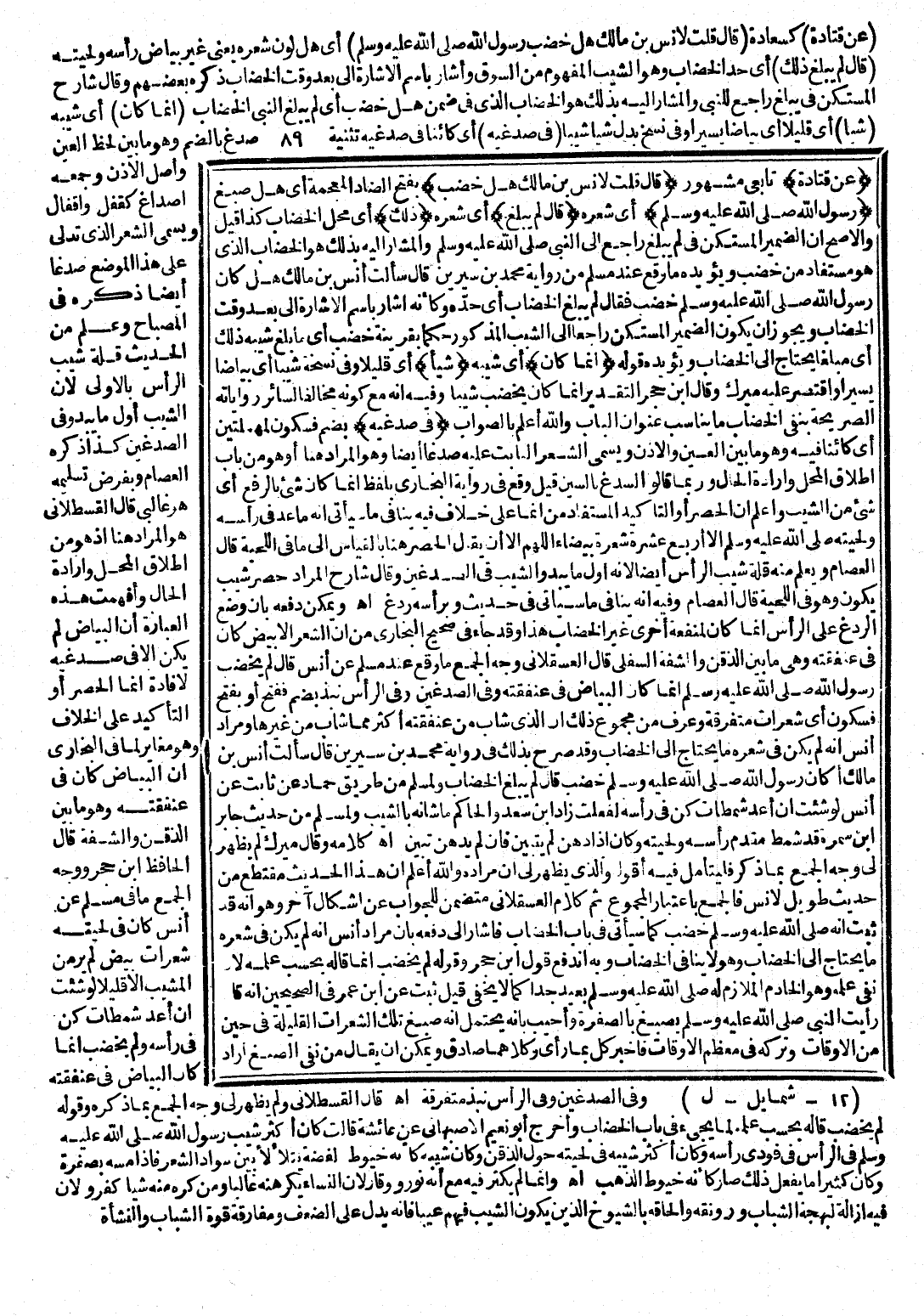عَلَيْهِ وَسَلَّمَ إِلَّا أَرْبَعَ عَشْرَةَ شَعْرَةً بَيْضَاءَ، اللَّهُمَّ إِلَّا أَنْ يُقَالَ: الْحَصْرُ هُنَا بِالْقِيَاسِ إِلَى مَا فِي اللِّحْيَةِ، قَالَ الْعِصَامُ: وَيُعْلَمُ مِنْهُ قِلَّةُ شَيْبِ الرَّأْسِ أَيْضًا ; لِأَنَّهُ أَوَّلُ مَا يَبْدُو الشَّيْبُ فِي الصُّدْغَيْنِ. وَقَالَ شَارِحٌ: الْمُرَادُ حَصْرُ شَيْبٍ يَكُونُ وَهُوَ فِي اللِّحْيَةِ. قَالَ الْعِصَامُ: وَفِيهِ أَنَّهُ يُنَافِي مَا سَيَأْتِي فِي حَدِيثِ «وَبِرَأْسِهِ رَدْغٌ» ، انْتَهَى. وَيُمْكِنُ دَفْعُهُ بِأَنَّ وَضْعَ الرَّدْغِ عَلَى الرَّأْسِ إِنَّمَا كَانَ لِمَنْفَعَةٍ أُخْرَى غَيْرِ الْخِضَابِ، هَذَا وَقَدْ جَاءَ فِي صَحِيحِ الْبُخَارِيِّ مِنْ أَنَّ الشَّعْرَ الْأَبْيَضَ كَانَ فِي عَنْفَقَتِهِ وَهِيَ مَا بَيْنَ الذَّقَنِ وَالشَّفَةِ السُّفْلَى، قَالَ الْعَسْقَلَانِيُّ: وَجْهُ الْجَمْعِ مَا وَقَعَ عِنْدَ مُسْلِمٍ عَنْ أَنَسٍ قَالَ: لَمْ يَخْضِبْ رَسُولُ اللَّهِ صَلَّى اللَّهُ عَلَيْهِ وَسَلَّمَ وَإِنَّمَا كَانَ الْبَيَاضُ فِي عَنْفَقَتِهِ وَفِي الصُّدْغَيْنِ وَفِي الرَّأْسِ نُبَذٌ. بِضَمٍّ فَفَتْحٍ أَوْ بِفَتْحٍ فَسُكُونٍ، أَيْ شَعَرَاتٌ مُتَفَرِّقَةٌ، وَعُرِفَ مِنْ مَجْمُوعِ ذَلِكَ أَنَّ الَّذِي شَابَ مِنْ عَنْفَقَتِهِ أَكْثَرُ مِمَّا شَابَ مِنْ غَيْرِهَا، وَمُرَادُ أَنَسٍ أَنَّهُ لَمْ يَكُنْ فِي شَعْرِهِ مَا يَحْتَاجُ إِلَى الْخِضَابِ، وَقَدْ صَرَّحَ بِذَلِكَ فِي رِوَايَةِ مُحَمَّدِ بْنِ سِيرِينَ قَالَ: سَأَلْتُ أَنَسَ بْنَ مَالِكٍ: أَكَانَ رَسُولُ اللَّهِ صَلَّى اللَّهُ عَلَيْهِ وَسَلَّمَ خَضَبَ؟ قَالَ: لَمْ يَبْلُغِ الْخِضَابَ. وَلِمُسْلِمٍ مِنْ طَرِيقِ حَمَّادٍ عَنْ ثَابِتٍ عَنْ أَنَسٍ: لَوْ شِئْتُ أَنْ أَعُدَّ شَمَطَاتٍ كُنَّ فِي رَأْسِهِ لَفَعَلْتُ. زَادُ ابْنُ سَعْدٍ وَالْحَاكِمُ «مَا شَأْنُهُ بِالشَّيْبِ» ، وَلِمُسْلِمٍ مِنْ حَدِيثِ جَابِرِ بْنِ سَمُرَةَ: قَدْ شَمِطَ مُقَدَّمُ رَأْسِهِ وَلِحْيَتِهِ، وَكَانَ إِذَا دَهَنَ لَمْ يَتَبَيَّنْ، فَإِنْ لَمْ يَدْهِنْ تَبَيَّنَ، انْتَهَى كَلَامُهُ. وَقَالَ مِيرَكُ: لَمْ يَظْهَرْ لِي وَجْهُ الْجَمْعِ بِمَا ذُكِرَ فَلْيُتَأَمَّلْ فِيهِ، أَقُولُ: وَالَّذِي يَظْهَرُ لِي أَنَّ مُرَادَهُ، وَاللَّهُ أَعْلَمُ، أَنَّ هَذَا الْحَدِيثَ مُقْتَطَعٌ مِنْ حَدِيثٍ طَوِيلٍ لِأَنَسٍ فَالْجَمْعُ بِاعْتِبَارِ الْمَجْمُوعِ، ثُمَّ كَلَامُ الْعَسْقَلَانِيِّ مُتَضَمِّنٌ لِلْجَوَابِ عَنْ إِشْكَالٍ آخَرَ، وَهُوَ أَنَّهُ قَدْ ثَبَتَ أَنَّهُ صَلَّى اللَّهُ عَلَيْهِ وَسَلَّمَ خَضَبَ - كَمَا سَيَأْتِي فِي بَابِ الْخِضَابِ - فَأَشَارَ إِلَى دَفْعِهِ بِأَنَّ مُرَادَ أَنَسٍ أَنَّهُ لَمْ يَكُنْ فِي شَعْرِهِ مَا يَحْتَاجُ إِلَى الْخِضَابِ، وَهُوَ لَا يُنَافِي الْخِضَابَ، وَبِهِ انْدَفَعَ قَوْلُ ابْنِ حَجَرٍ، وَقَوْلُهُ «لَمْ يَخْضِبْ» إِنَّمَا قَالَهُ بِحَسَبِ عِلْمِهِ لِأَنَّ نَفْيَ عِلْمِهِ وَهُوَ الْخَادِمُ الْمُلَازِمُ لَهُ صَلَّى اللَّهُ عَلَيْهِ وَسَلَّمَ بَعِيدٌ جِدًّا كَمَا لَا يَخْفَى، قِيلَ: ثَبَتَ عَنِ ابْنِ عُمَرَ فِي الصَّحِيحَيْنِ أَنَّهُ قَالَ: رَأَيْتُ النَّبِيَّ صَلَّى اللَّهُ عَلَيْهِ وَسَلَّمَ يَصْبُغُ بِالصُّفْرَةِ. وَأُجِيبَ بِأَنَّهُ يُحْتَمَلُ أَنَّهُ صَبَغَ تِلْكَ الشَّعَرَاتِ الْقَلِيلَةِ فِي حِينٍ مِنَ الْأَوْقَاتِ وَتَرَكَهُ فِي مُعْظَمِ الْأَوْقَاتِ، فَأَخْبَرَ كُلٌّ بِمَا رَأَى، وَكِلَاهُمَا صَادِقٌ، وَيُمْكِنُ أَنْ يُقَالَ: مَنْ نَفَى الصَّبْغَ أَرَادَ