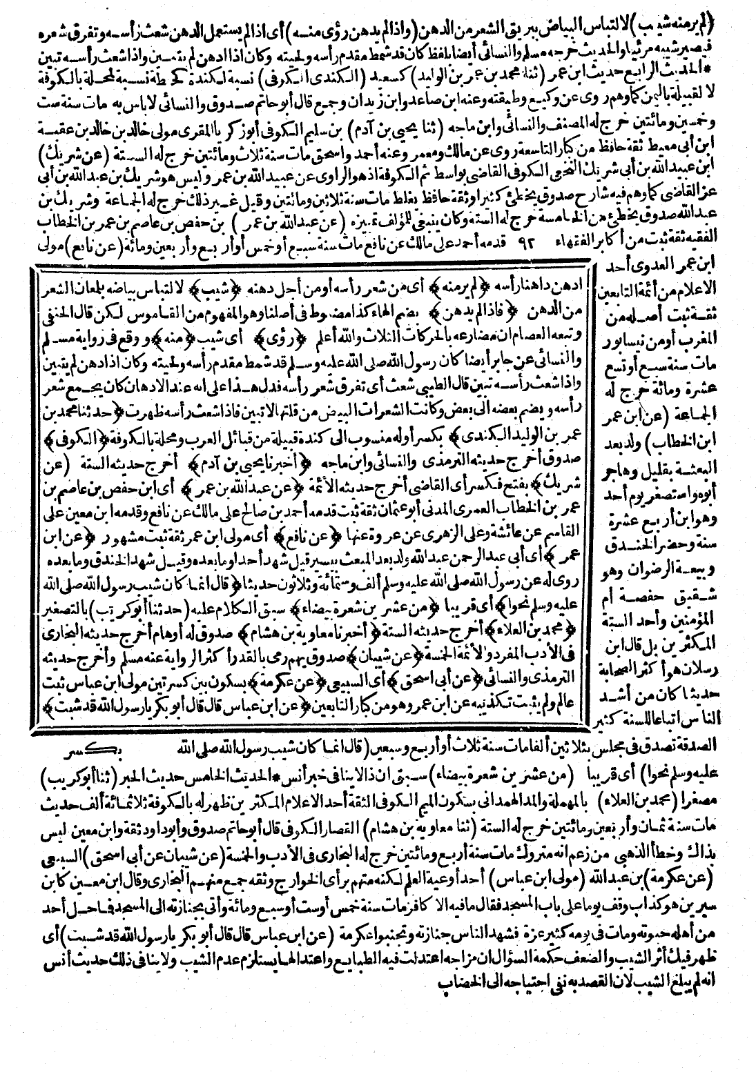 (حَدَّثَنَا مُحَمَّدُ بْنُ عُمَرَ بْنِ الْوَلِيدِ الْكِنْدِيُّ) : بِكَسْرِ أَوَّلِهِ، مَنْسُوبٌ إِلَى كِنْدَةَ قَبِيلَةٍ مِنْ قَبَائِلِ الْعَرَبِ وَمَحَلَّةٍ بِالْكُوفَةِ. (الْكُوفِيُّ) : صَدُوقٌ، أَخْرَجَ حَدِيثَهُ التِّرْمِذِيُّ وَالنَّسَائِيُّ وَابْنُ مَاجَهْ. (أَخْبَرَنَا يَحْيَى بْنُ آدَمَ) : أَخْرَجَ حَدِيثَهُ السِّتَّةُ. (عَنْ شَرِيكٍ) : بِفَتْحٍ فَكَسْرٍ، أَيِ الْقَاضِي، أَخْرَجَ حَدِيثَهُ الْأَئِمَّةُ. (عَنْ عَبْدِ اللَّهِ بْنِ عُمَرَ) : أَيِ ابْنِ حَفْصٍ، عَنْ عَاصِمِ بْنِ عُمَرَ بْنِ الْخَطَّابِ الْعُمَرِيِّ الْمَدَنِيِّ أَبُو عُثْمَانَ، ثِقَةٌ، ثَبْتٌ، قَدَّمَهُ أَحْمَدُ بْنُ صَالِحٍ عَلَى مَالِكٍ عَنْ نَافِعٍ، وَقَدَّمَهُ ابْنُ مَعِينٍ عَلَى الْقَاسِمِ عَنْ عَائِشَةَ، وَعَلَى الزُّهْرِيِّ عَنْ عُرْوَةَ عَنْهَا. (عَنْ نَافِعٍ) : أَيْ مَوْلَى ابْنِ عُمَرَ، ثِقَةٌ، ثَبْتٌ، مَشْهُورٌ. (عَنِ ابْنِ عُمَرَ) : أَيْ أَبِي عَبْدِ الرَّحْمَنِ عَبْدِ اللَّهِ، وُلِدَ بَعْدَ الْمَبْعَثِ بِيَسِيرٍ، وَقِيلَ شَهِدَ أُحُدًا وَمَا بَعْدَهُ، وَقِيلَ شَهِدَ الْخَنْدَقَ وَمَا بَعْدَهُ، رُوِيَ لَهُ عَنْ رَسُولِ