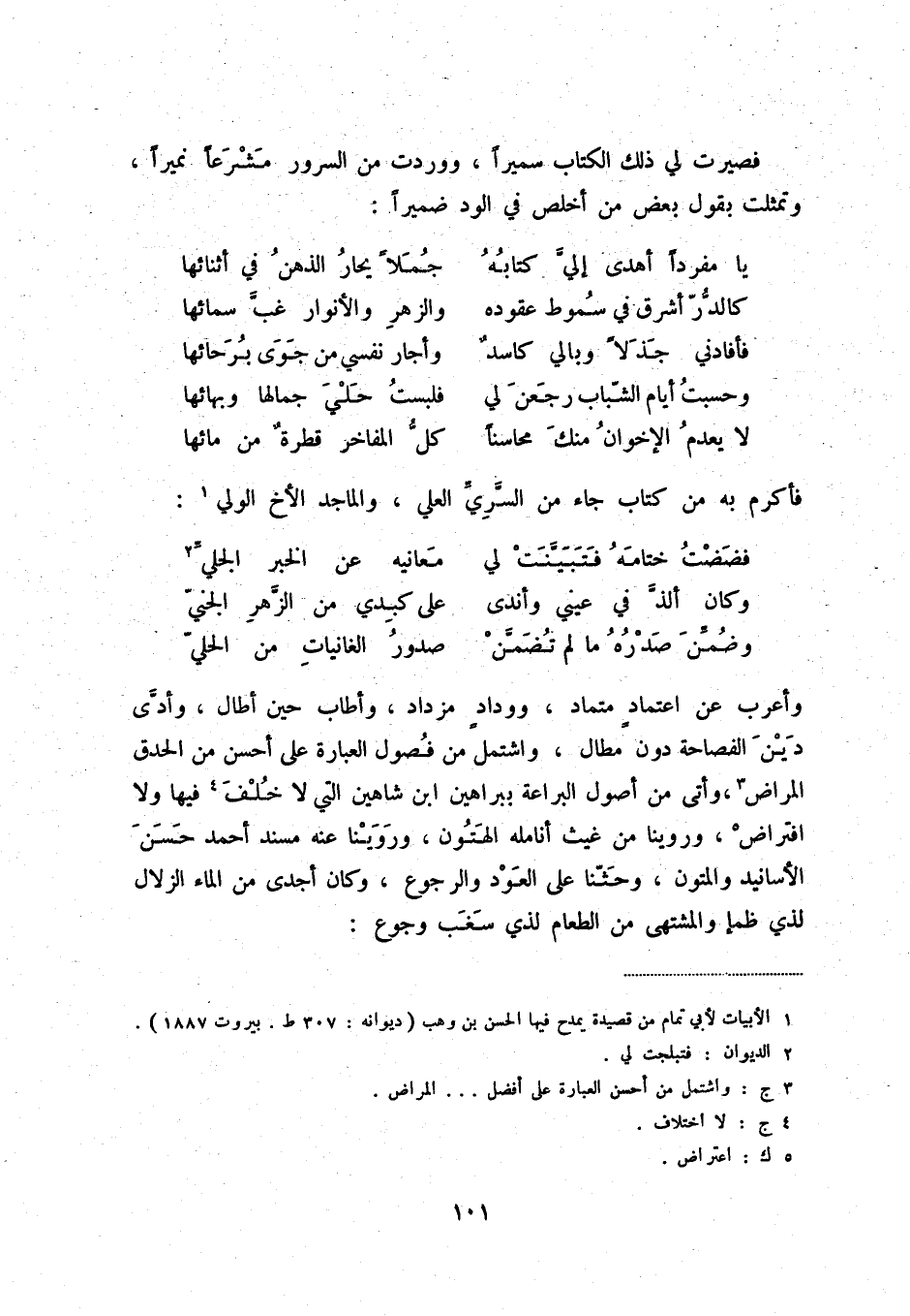 فصيرت لي ذلك الكتاب سميراً، ووردت من السرور مشرعاً نميراً، وتمثلت بقول بعض من أخلص في الود ضميراً: