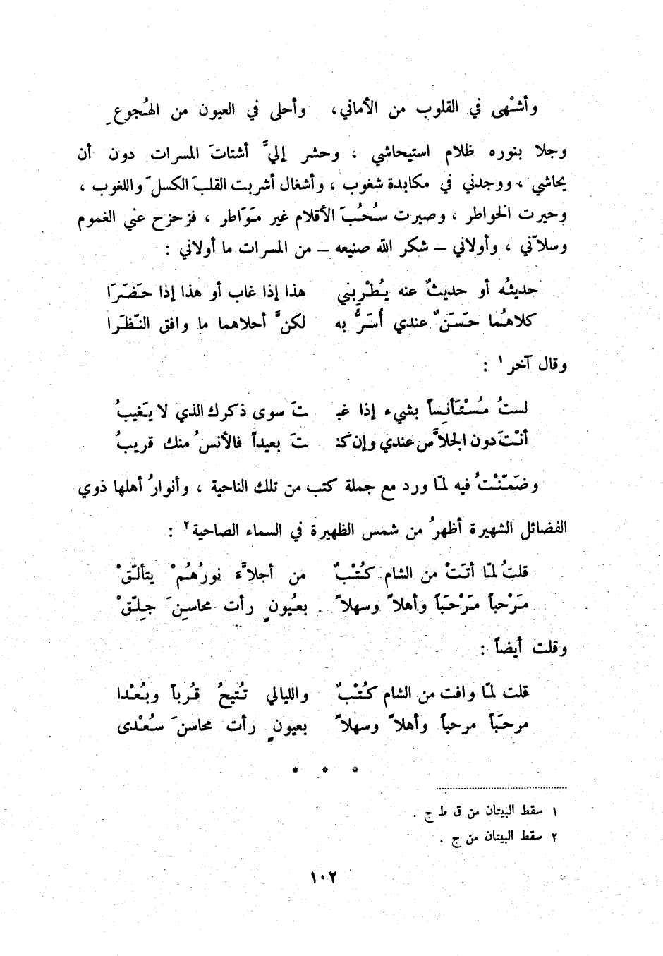 وجلا بنوره ظلام استيحاشي، وحشر إلي أشتات المسرات دون أن يحاشي، ووجدني في مكابدة شغوب، وأشغال أشربت القلب الكسل واللغوب، وحيرت الخواطر، وصيرت سحب الأقلام غير مواطر، فزحزح عني الغموم وسلاني، وأولاني - شكر الله صنيعه - من المسرات ما أولاني: