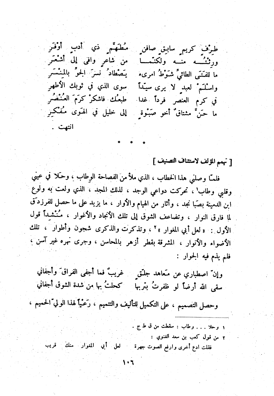 فلما وصلني هذا الخطاب، الذي ملأ من الفصاحة الوطاب، وحلا في عيني وقلبي وطاب، تحركت دواعي الوجد، لذلك المجد، الذي ولعت به لولع ابن الدمينة بصبا نجد، وأثار من الهيام والأوار، ما يزيد على ما حصل للفرزدق لما فارق النوار، وتضاعف الشوق إلى تلك الأنجاد والأغوار، منشداً قول الأول: ((لعل أبي المغوار)) ، وتذكرت والذكرى شجون وأطوار، تلك الأضواء وزالأنوار، المشرقة بقطر أزهر بالمحاسن، وجرى نهره غير آسن، فلم يذم فيه الجوار:
