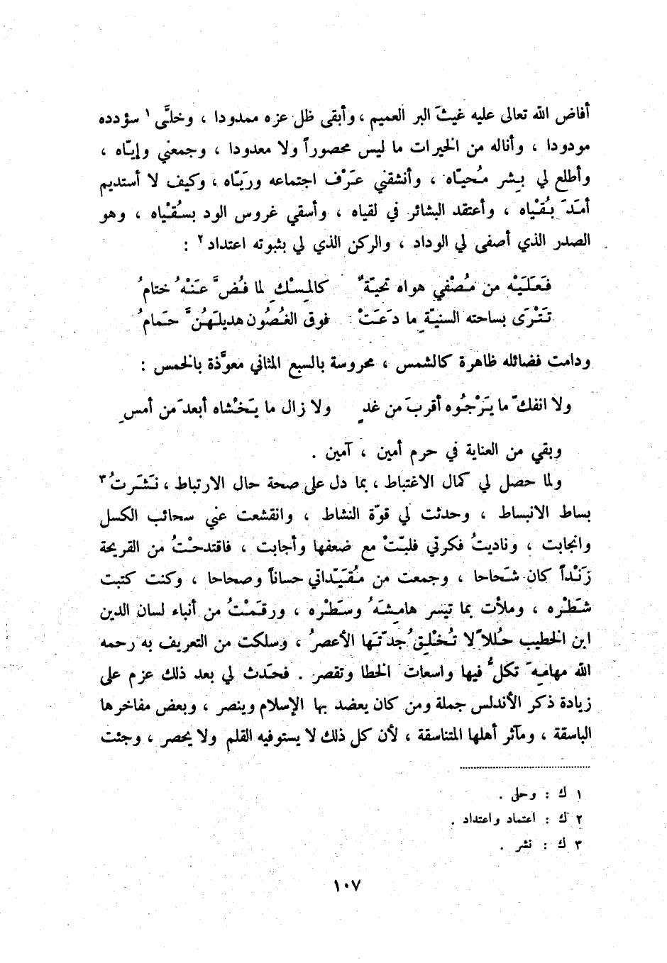 ولما حصل لي كمال الاغتباط، بما دل على صحة حال الارتباط، نشرت بساط الانبساط، وحدثت لي قوة النشاط، وانقشعت عني سحائب الكسل وانجابت، وناديت فكرتي فلبت مع ضعفها وأجابت، فاقتدحت من القريحة زنداً كان شحاحاً، وجمعت من مقيداتي حساناً وصحاحاً، وكنت كتبت شطره، وملأت بما تيسر هامشه وسطره، ورقمت من أنباء لسان الدين ابن الخطيب حللا لا تخلق جدتها الأعصر، وسلكت من التعريف به رحمه الله مهامه تكل فيها واسعات الخطا وتقصر. فحدث لي بعد ذلك عزم على زيادة الأندلس ذكر الأندلس جملة ومن كان يعضد بها الإسلام وينصر، وبعض مفاخرها الباسقة، ومآثر أهلها المتناسقة، لأن كل ذلك لا يستوفيه القلم ولا يحصر، وجئت