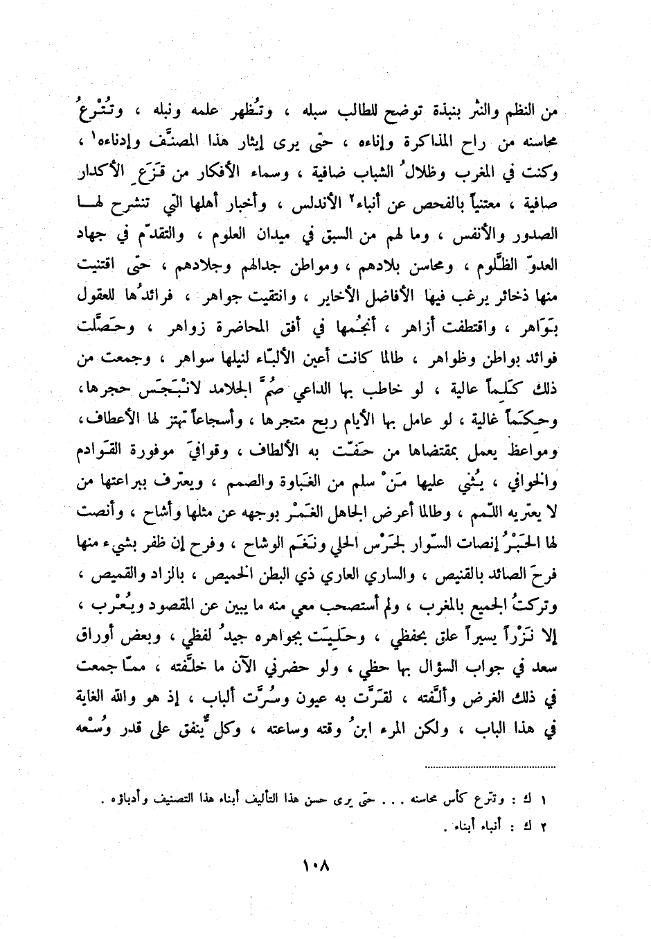 من النظم والنثر بنبذة توضح للطالب سبله، وتظهر علمه ونبله، وتترع محاسنه من راح المذاكرة وإناءه، حتى يرى إيثار هذا المصنف وإدناءه، وكنت في المغرب وظلال الشباب ضافية، وسماء الأفكار من قزع الأكدار صافية، معتنياً بالفحص عن أنباء الأندلس، وأخبار أهلها التي تنشرح لها الصدور والأنفس، وما لهم من السبق في ميدان العلوم، والتقدم في جهاد العدو الظلوم، ومحاسن بلادهم، ومواطن جدالهم وجلادهم، حتى اقتنيت منها ذخائر يرغب فيها الأفاضل الأخاير، وانتقيت جواهر، فرائدها للعقول بواهر، واقتطفت أزاهر، أنجمها في أفق المحاضرة زواهر، وحصلت فوائد بواطن وظواهر، طالما كانت أعين الألباء لنيلها سواهر، وجمعت من ذلك كلما عالية، لو خاطب بها الداعي صم الجلامد لا نبجس حجرها، وحكماً غالية، لو عامل بها الأيام ربح متجرها، واسجاعاً تهتز لها الأعطاف، ومواعظ يعمل بمقتضاها من حفت به الألطاف، وقوافي موفورة القوادم والخوافي، يثني عليها من سلم من الغباوة والصمم، ويعترف ببراعتها من لا يعتريه اللمم، وطالما أعرض الجاهل الغمر بوجهه عن مثلها واشاح، وأنصت لهما الحبر إنصات السوار لجرس الحلي ونغم الوشاح، وفرح إن ظفر بشيء منها فرح الصائد بالقنيص، والساري العاري ذي البطن الخميص، بالزاد والقميص وتركت الجميع بالمغرب، ولم أستصحب معي منه ما يبين عن المقصود ويعرب، إلا نزراً يسيراً علق بحفظي، وحليت بجواهره جيد لفظي، وبعض أوراق سعد في جواب السؤال بها حظي، ولو حضرني الآن ما خلفته، مما جمعت في ذلك الغرض وألفته، لقرت به عيون وسرت ألباب، إذ هو والله الغاية في هذا الباب، ولكن المرء ابن وقته وساعته، وكل ينفق على قدر وسعه