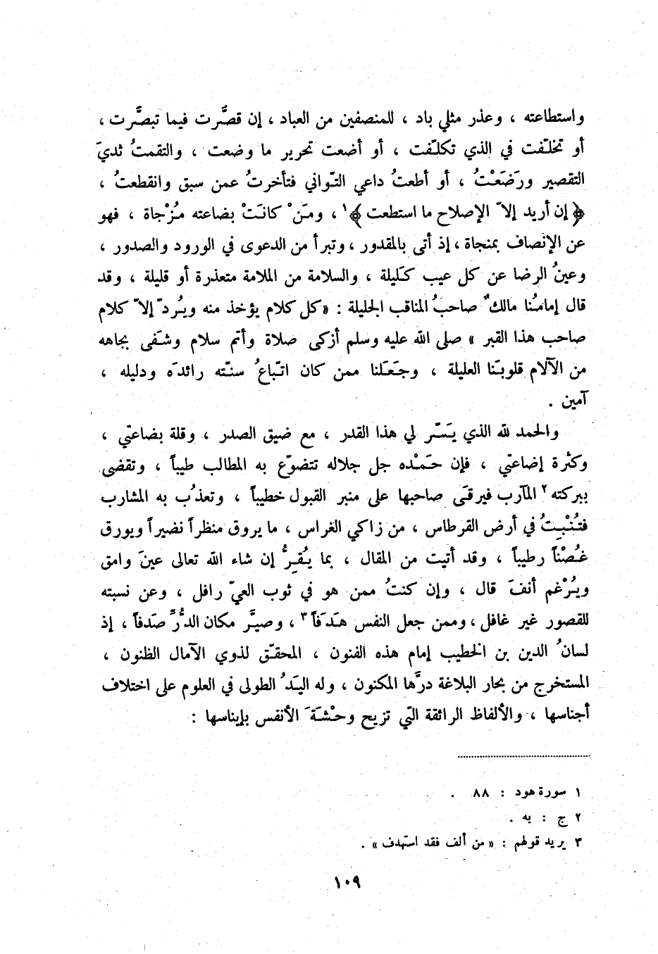 واستطاعته، وعذر مثل باد، للمصنفين من العباد، إن قصرت فيما تبصرت، أو تخلفت في الذي تكلفت، أو أضعت تحرير ما وضعت، والتقمت ثدي التقصير ورضعت، أو أطعت داعي التواني فتأخرت عمن سبق وانقطعت، (إن أريد إلا الإصلاح ما استطعت) ، ومن كانت بضاعته مزجاة، فهو عن الإنصاف بمنجاة، إذ أتى بالمقدور، وتبرأ من الدعوى في الورود والصدور، وعين الرضا عن كل عيب كليلة، والسلامة من الملامة متعذرة أو قليلة، وقد قال إمامنا مالك صاحب المناقب الجليلة: ((كل كلام يؤخذ منه ويرد إلا كلام صاحب هذا القبر)) صلى الله عليه وسلم أزكى صلاة وأتم سلام وشفى بجاهه من الآلام قلوبنا العليلة، وجلعنا ممن كان اتباع سنته رائدة ودليله، آمين.