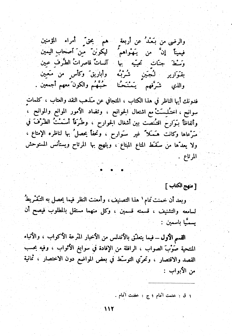 القسم الأول - فيما يتعلق بالأندلس من الأخبار المترعة الأكواب، والأنباء المنتحية صوب الصواب، الرافلة من الإفادة في سوابغ الأثواب، وفيه بحسب القصد والاقتصار، وتحري التوسط في بعض المواضع دون الاختصار، ثمانية من الأبواب: