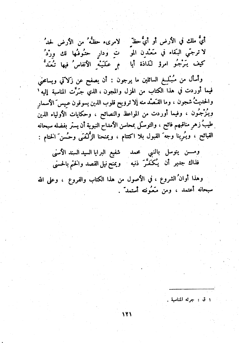 كيف يرجو امرؤ لذاذة أيا ... م عليه الأنفاس فيها تعد وأسأل من مبلغ السائلين ما يرجون: أن يصفح عن زلاتي ويسامحني فيما أوردت في هذا الكتاب من الهزل والمجون، الذي جرت المناسبة إليه (1) والحديث شجون، وما القصد منه إلا ترويح قلوب الذين يسوقون عيس الأسمار ويزجون، وفيما أوردت من المواعظ والنصائح، وحكايات الأولياء الذين طيب زهر مناقبهم فائح، والتوسل بمحاسن الأمداح النبوية أن يستر بفضله سبحانه القبائح، ويرينا وجه القبول بلا اكتتام، ويمنحنا الزلفى وحسن الختام: