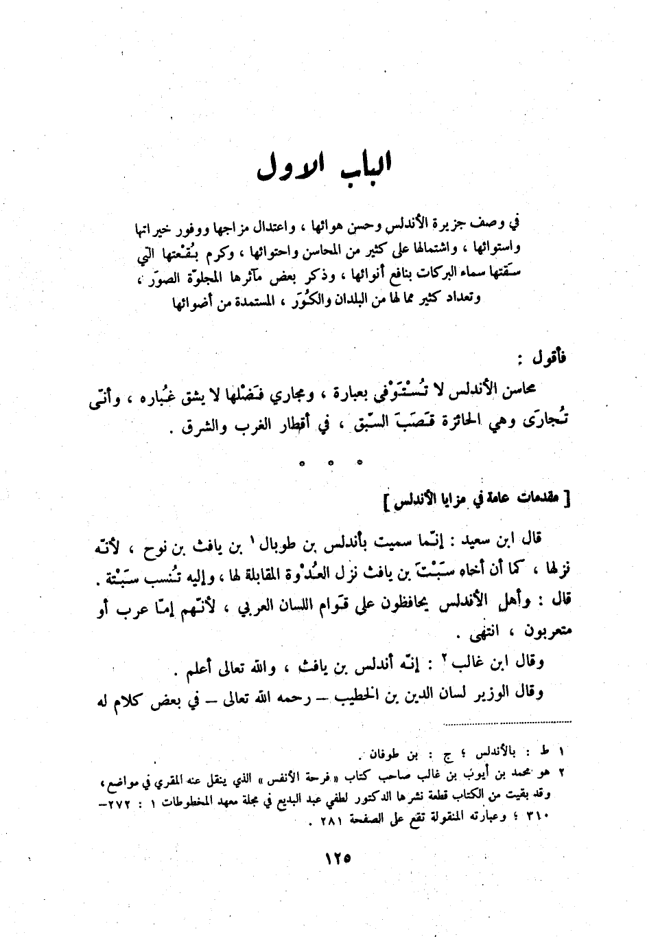 (2) هو محمد بن أيوب بن غالب صاحب كتاب " فرحة الأنفس " الذي ينقل عنه المقري في مواضع وقد بقيت من الكتاب قطعة نشرها الدكتور لطفي عبد البديع في مجلة معهد المخطوطات 1: 272 - 310؛ وعبارته المنقولة تقع على الصفحة 281.
