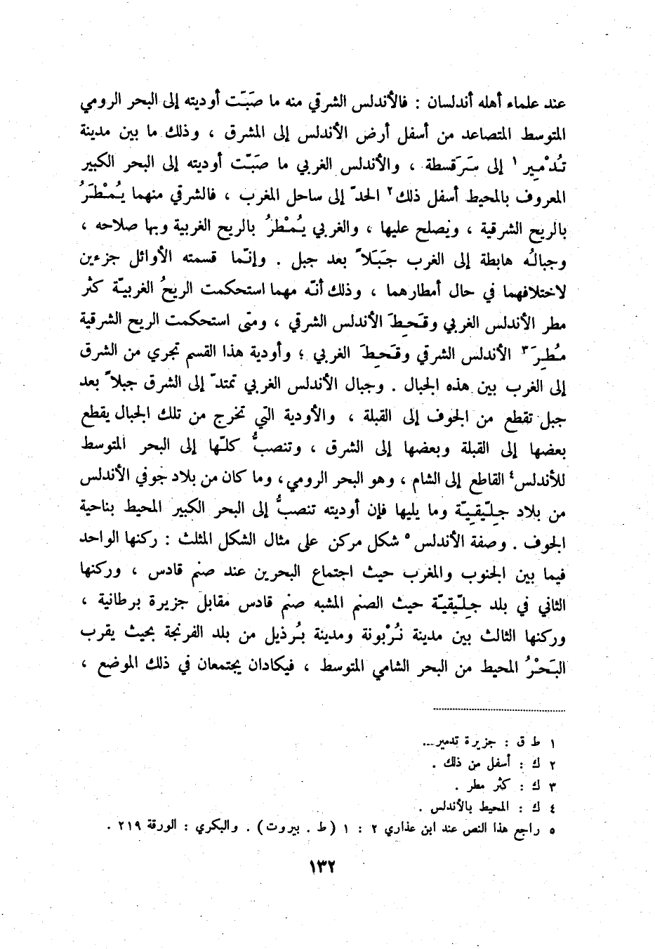 عند علماء أهله أندلسان: فالأندلس الشرقي منه ما صبّت أوديته إلى البحر الرومي المتوسط المتصاعد من أسفل أرض الأندلس إلى المشرق، وذلك ما بين مدينة تدمير (1) إلى سرقسطة، والأندلس الغربي ما صبّت أوديته إلى البحر الكبير المعروف بالمحيط أسفل ذلك (2) الحدّ إلى ساحل المغرب، فالشرقي منهما يمطر بالريح الشرقية، ويصلح عليها، والغربي يمطر بالريح الغربية وبها صلاحه، وجباله هابطةٌ إلى الغرب جبلاً بعد جبلٍ. وإنّما قسمته الأوائل جزأين لاختلافهما في حال أمطارهما، وذلك أنّه مهما استحكمت الريح الغربيّة كثر مطر (3) الأندلس الغربي وقحط الأندلس الشرقي، ومتى استحكمت الريح الشرقية مطر الأندلس الشرقي وقحط الغربي؛ وأودية هذا القسم تجري من الشرق إلى الغرب بين هذه الجبال. وجبال الأندلس الغربي تمتدّ إلى الشرق جبلاً بعد جبلٍ تقطع من الجوف إلى القبلة، والأودية التي تخرج من تلك الجبال يقطع بعضها إلى القبلة وبعضها إلى الشرق، وتنصبّ كلّها إلى البحر المتوسط للأندلس (4) القاطع إلى الشام، وهو البحر الرومي، وما كان من بلاد جوفي الأندلس من بلادٍ جلّيقيّةٍ وما يليها فإن أوديته تنصبّ إلى البحر الكبير المحيط بناحية الجوف. وصفة الأندلس (5) شكلٌ مركنٌ على مثال الشكل المثلث: ركنها الواحد فيما بين الجنوب والمغرب حيث اجتماع البحرين عند صنم قادس، وركنها الثاني في بلدٍ جليّقيّةٍ حيث الصنم المشبه صنم قادس مقابل جزيرةٍ برطانيةٍ، وركنها الثالث بين مدينة نربونة ومدينة برذيل من بلد الفرنجة بحيث يقرب البحر المحيط من البحر الشامي المتوسط، فيكادان يجتمعان في ذلك الموضع،