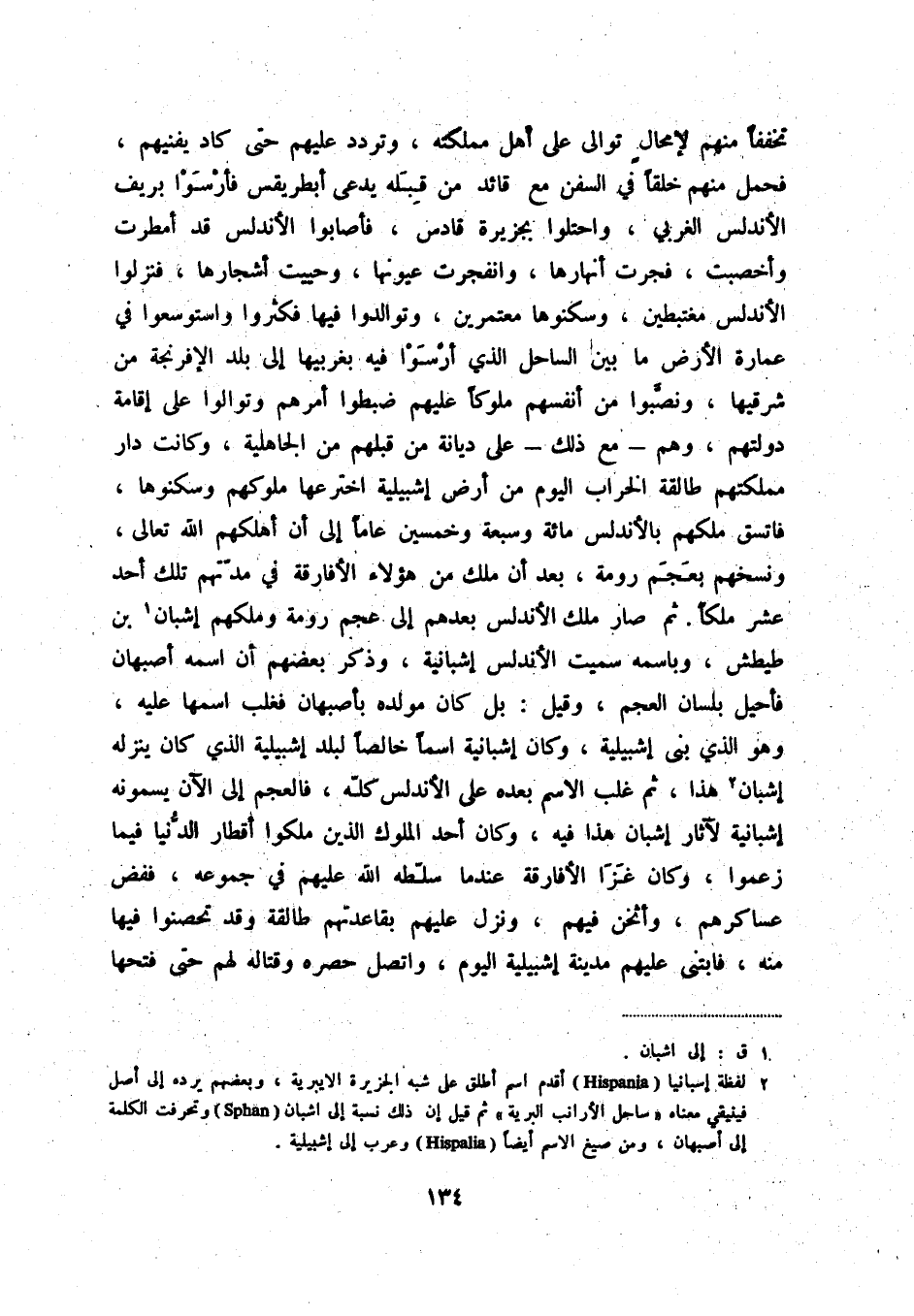 تخففاً منهم لإمحالٍ توالى على أهل مملكته، وتردد عليهم حتى كاد يفنيهم، فحمل منهم خلقاً في السفن مع قائدٍ من قبله يدعى أبطريقس فأرسوا بريف الأندلس الغربي، واحتلوا بجزيرة قادس، فأصابوا الأندلس قد أمطرت وأخصبت، فجرت أنهارها، وانفجرت عيونها، وحييت أشجارها، فنزلوا الأندلس مغتبطين، وسكنوها معتمرين، وتوالدوا فيها فكثروا واستوسعوا في عمارة الأرض ما بين الساحل الذي أرسوا فيه بغربيها إلى بلد الإفرنجة من شرقيها، ونصّبوا من أنفسهم ملوكاً عليهم ضبطوا أمرهم وتوالوا على إقامة دولتهم، وهم - مع ذلك - على ديانة من قبلهم من الجاهلية، وكانت دار مملكتهم طالقة الخراب اليوم من أرض إشبيلية اخترعها ملوكهم وسكنوها، فاتسق ملكهم بالأندلس مائة وسبعة وخمسين عاماً إلى أن أهلكهم الله تعالى، ونسخهم بعجم رومة، بعد أن ملك من هؤلاء الأفارقة في مدّتهم تلك أحد عشر ملكاً. ثم صار ملك الأندلس بعدهم إلى عجم رومة وملكهم إشبان (1) بن طيطش، وباسمه سميت الأندلس إشبانية، وذكر بعضهم أن اسمه أصبهان فأحيل بلسان العجم، وقيل: بل كان مولده بأصبهان فغلب اسمها عليه، وهو الذي بنى إشبيلية، وكان إشبانية اسماً خالصاً لبلد إشبيلية الذي كان ينزله إشبان (2) هذا، ثم غلب الاسم بعده على الأندلس كلّه، فالعجم إلى الآن يسمونه إشبانية لآثار إشبان هذا فيه، وكان أحد الملوك الذين ملكوا أقطار الدّنيا فيما زعموا، وكان غزا الأفارقة عندما سلّطه الله عليهم في جموعه، ففض عساكرهم، وأثخن فيهم، ونزل عليهم بقاعدتهم طالقة وقد تحصنوا فيها منه، فابتنى عليهم مدينة إشبيلية اليوم، واتصل حصره وقتاله لهم حتى فتحها