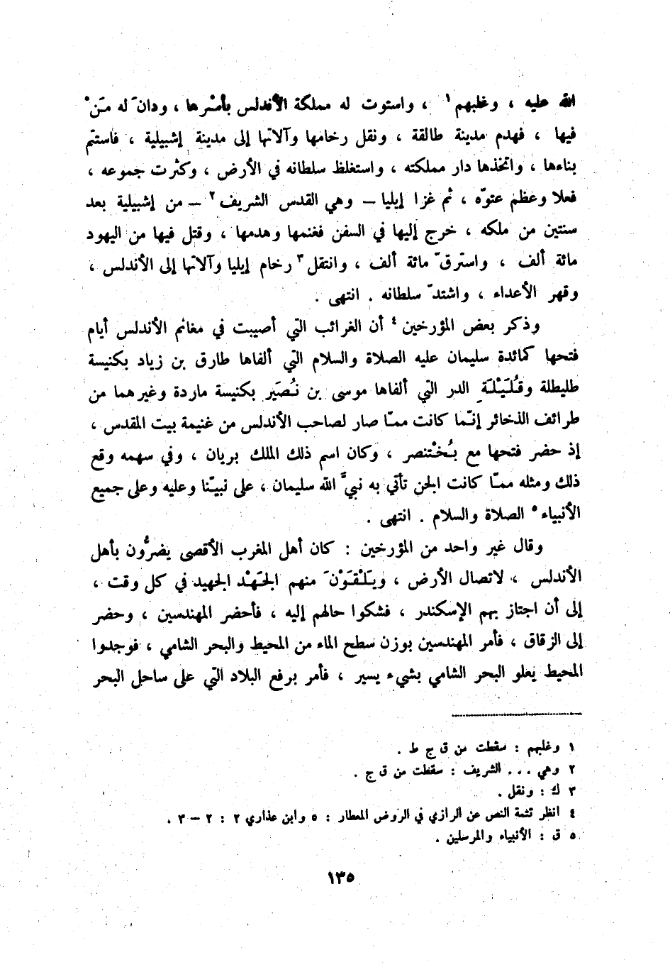 وذكر بعض المؤرخين (4) أن الغرائب التي أصيبت في مغانم الأندلس أيام فتحها كمائدة سليمان عليه الصلاة والسلام التي ألفاها طارق بن زياد بكنيسة طليطلة وقليلة الدر التي ألفاها موسى بن نصير بكنيسة ماردة وغيرهما من طرائف الذخائر إنّما كانت ممّا صار لصاحب الأندلس من غنيمة بيت المقدس، إذ حضر فتحها مع بختنصر، وكان اسم ذلك الملك بريان، وفي سهمه وقع ذلك ومثله ممّا كانت الجن تأتي به نبيّ الله سليمان، على نبيّنا وعليه وعلى جميع الأنبياء (5) الصلاة والسلام. وانتهى.