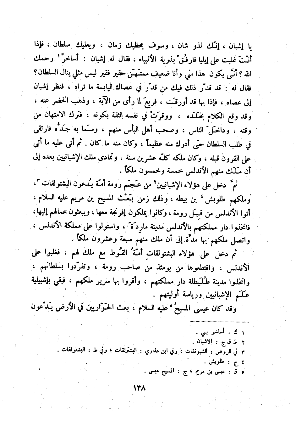 يا إشبان، إنّك لذو شانٍ، وسوف يحظيك زمانٌ، ويعليك سلطانٌ، فإذا أنت غلبت على إيليا فارفق بذرية الأنبياء، فقال له إشبان: أساخرٌ (1) رحمك الله؟ أنّى يكون هذا مني وأنا ضعيفٌ ممتهنٌ حقيرٌ فقيرٌ ليس مثلي ينال السلطان؟ فقال له: قد قدّر ذلك فيك من قدّر في عصاك اليابسة ما تراه، فنظر إشبان إلى عصاه، فإذا بها قد أورقت، فريع لما رأى من الآية، وذهب الخضر عنه، وقد وقع الكلام بخلده، ووقرت في نفسه الثقة بكونه، فترك الامتهان من وقته، وداخل الناس، وصحب أهل البأس منهم، وسما به جدّه فارتقى في طلب السلطان حتى أدرك منه عظيماً، وكان منه ما كان. ثم أتى عليه ما أتى على القرون قبله، وكان ملكه كلّه عشرين سنةً، وتمادى ملك الإشبانيين بعده إلى أن ملك منهم الأندلس خمسة وخمسون ملكاً.