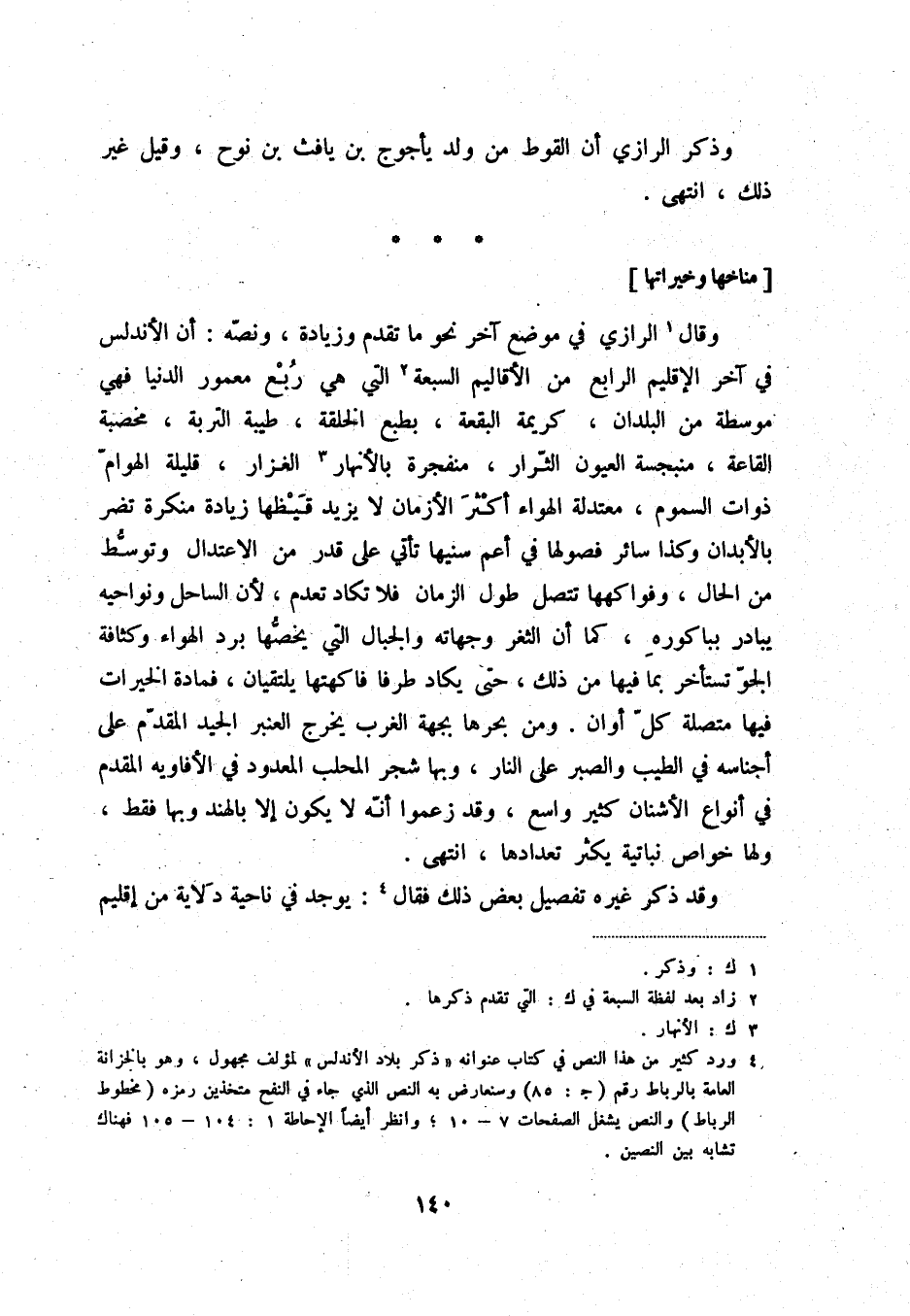 وقال (1) الرازي في موضعٍ آخر نحو ما تقدم وزيادة، ونصّه: أن الأندلس في آخر الإقليم الرابع من الأقاليم السبعة (2) التي هي ربع معمور الدنيا فهي موسطةٌ من البلدان، كريمة البقعة، بطبع الخلقة، طيبة التربة، مخصبة القاعة، منبجسة العيون الثّرار، منفجرة بالأنهار (3) الغزار، قليلة الهوام ذوات السموم، معتدلة الهواء أكثر الأزمان لا يزيد قيظها زيادة منكرة تضر بالأبدان وكذا سائر فصولها في أعم سنيها تأتي على قدر من الاعتدال وتوسّط من الحال، وفواكهها تتصل طول الزمان فلا تكاد تعدم، لأن الساحل ونواحيه يبادر بباكوره، كما أن الثغر وجهاته والجبال التي يخصّها برد الهواء وكثافة الجوّ تستأخر بما فيها من ذلك، حتى يكاد طرفا فاكهتها يلتقيان، فمادة الخيرات فيها متصلةٌ كلّ أوانٍ. ومن بحرها بجهة الغرب يخرج العنبر الجيد المقدّم على أجناسه في الطيب والصبر على النار، وبها شجر المحلب المعدود في الأفاويه المقدم في أنواع الأشنان كثيرٌ واسعٌ، وقد زعموا أنّه لا يكون إلا بالهند وبها فقط، ولها خواصٌ نباتيةٌ يكثر تعدادها، انتهى.