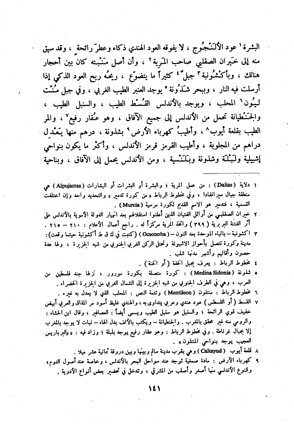 البشرة (1) عود الألنجوج، لا يفوقه العود الهندي ذكاءً وعطر رائحةٍ، وقد سيق منه إلى خيران الصقلبي صاحب المرية (2) ، وأن أصل منبته كان بين أحجارٍ هنالك، وبأكشونبة (3) جبلٌ (4) كثيراً ما يتضوّع، ريحه ريح العود الذكي إذا أرسلت فيه النار، وببحر شذونة (5) يوجد العنبر الطيب الغربي، وفي جبل منت ليون (6) المحلب، ويوجد بالأندلس القسط الطيب، والسنبل الطيب، والجنطيانة تحمل من الأندلس إلى جميع الآفاق، وهو عقارٌ رفيعٌ (7) ، والمر الطيب بقلعة أيوب (8) ، وأطيب كهرباء الأرض (9) بشذونة، درهمٌ منها يعدل دراهم من المجلوبة، وأطيب القرمز قرمز الأندلس، وأكثر ما يكون بنواحي إشبيلية ولبلة وشذونة وبلنسية، ومن الأندلس يحمل إلى الآفاق، وبناحية