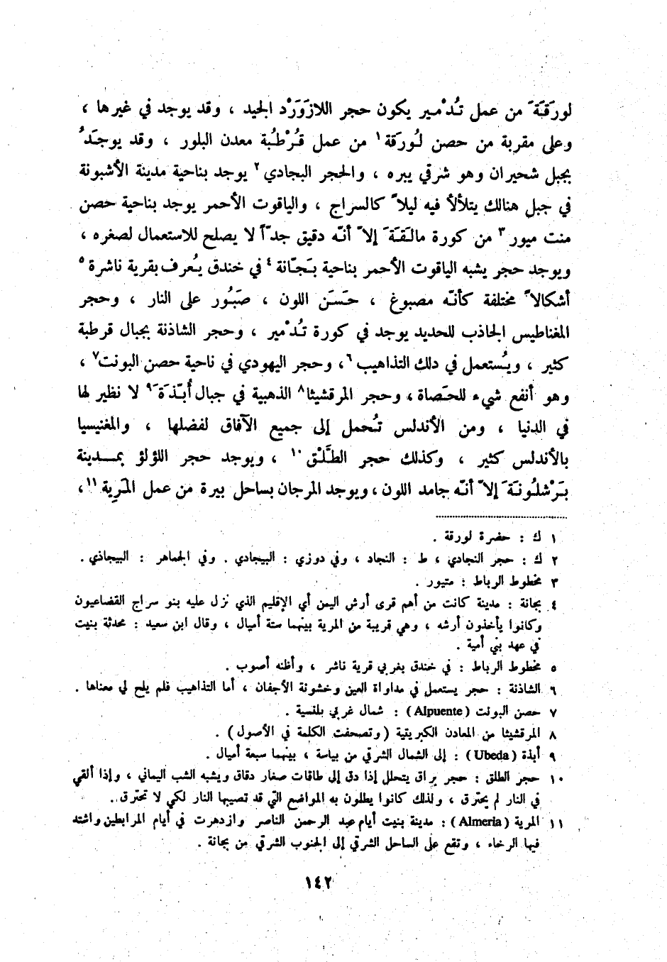 لورقة من عمل تدمير يكون حجر اللازورد الجيد، وقد يوجد في غيرها، وعلى مقربة من حصن لورقة (1) من عمل قرطبة معدن البلور، وقد يوجد بجبل شحيران وهو شرقي يبره، والحجر البجادي (2) يوجد بناحية مدينة الأشبونة في جبلٍ هنالك يتلألأ فيه ليلاً كالسراج، والياقوت الأحمر يوجد بناحية حصن منت ميور (3) من كورة مالقة إلاّ أنّه دقيق جدّاً لا يصلح للاستعمال لصغره، ويوجد حجرٌ يشبه الياقوت الأحمر بناحية بجّانة (4) في خندق يعرف بقرية ناشرة (5) أشكالاً مختلفةً كأنّه مصبوغٌ، حسن اللون، صبور على النار، وحجر المغناطيس الجاذب للحديد يوجد في كورة تدمير، وحجر الشاذنة بجبل قرطبة كثير، ويستعمل في دلك التذاهيب (6) ، وحجر اليهودي في ناحية حصن البونت (7) ، وهو أنفع شيءٍ للحصاة، وحجر المرقشيثا (8) الذهبية في جبال أبّذة (9) لا نظير لها في الدنيا، ومن الأندلس تحمل إلى جميع الآفاق لفضلها، والمغنيسيا بالأندلس كثير، وكذلك حجر الطّلق (10) ، ويوجد حجر اللؤلؤ بمدينة برشلونة إلاّ أنّه جامد اللون، ويوجد المرجان بساحل بيرة من عمل المرية (11) ،