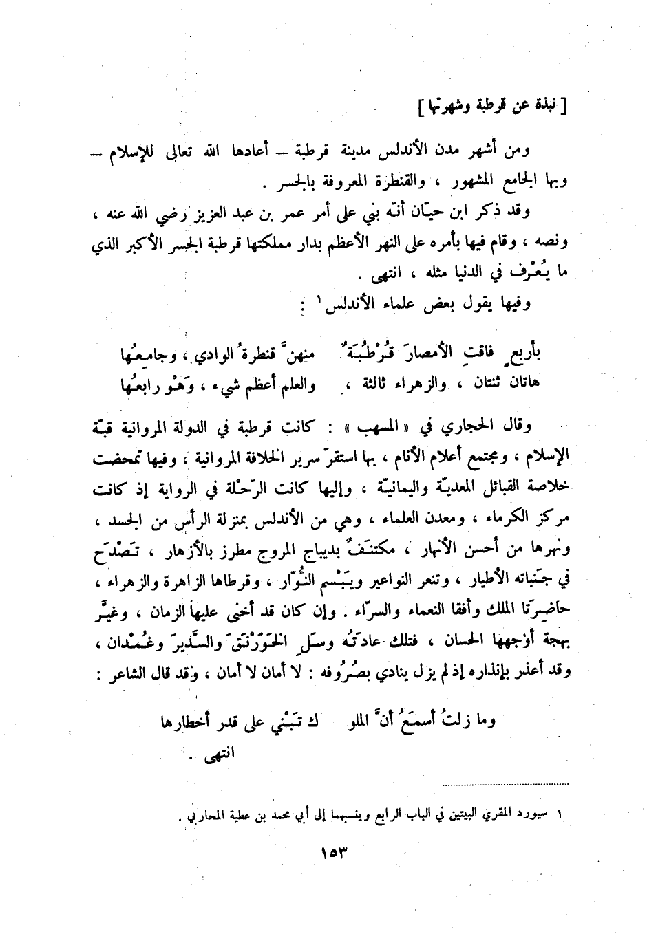 هاتان ثنتان، والزهراء ثالثةٌ، ... والعلم أعظم شيءٍ، وهو رابعها وقال الحجاري في " المسهب ": كانت قرطبة في الدولة المروانية قبّة الإسلام، ومجتمع أعلام الأنام، بها استقرّ سرير الخلافة المروانية، وفيها تمحضت خلاصة القبائل المعديّة واليمانيّة، وإليها كانت الرّحلة في الرواية إذ كانت مركز الكرماء، ومعدن العلماء، وهي من الأندلس بمنزلة الرأس من الجسد، ونهرها من أحسن الأنهار، مكتنفٌ بديباج المروج مطرزٌ بالأزهار، تصدح في جنباته الأطيار، وتنعر النواعير ويبسم النّوّار، وقرطاها الزاهرة والزهراء، حاضرتا الملك وأفقا النعماء والسرّاء. وإن كان قد أخنى عليها الزمان، وغيّر بهجة أوجهها الحسان، فتلك عادته وسل الخورنق والسّدير وغمدان، وقد أعذر بإنذاره إذ لم يزل ينادي بصروفه: لا أمان لا أمان، وقد قال الشاعر:
