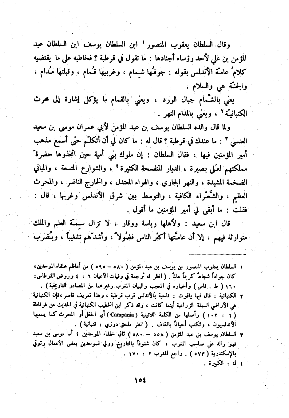 ولما قال والده السلطان يوسف بن عبد المؤمن لأبي عمران موسى بن سعيد العنسي (3) : ما عندك في قرطبة؟ قال له: ما كان لي أن أتكلّم حتى أسمع مذهب أمير المؤمنين فيها، فقال السلطان: إن ملوك بين أمية حين اتخذوها حضرة مملكتهم لعلى بصيرةٍ، الديار المنفسحة الكثيرة (4) ، والشوارع المتسعة، والمباني الضخمة المشيدة، والنهر الجاري، والهواء المعتدل، والخارج الناضر، والمحرث العظيم، والشّعراء الكافية، والتوسط بين شرق الأندلس وغربها، قال: فقلت: ما أبقى لي أمير المؤمنين ما أقول.