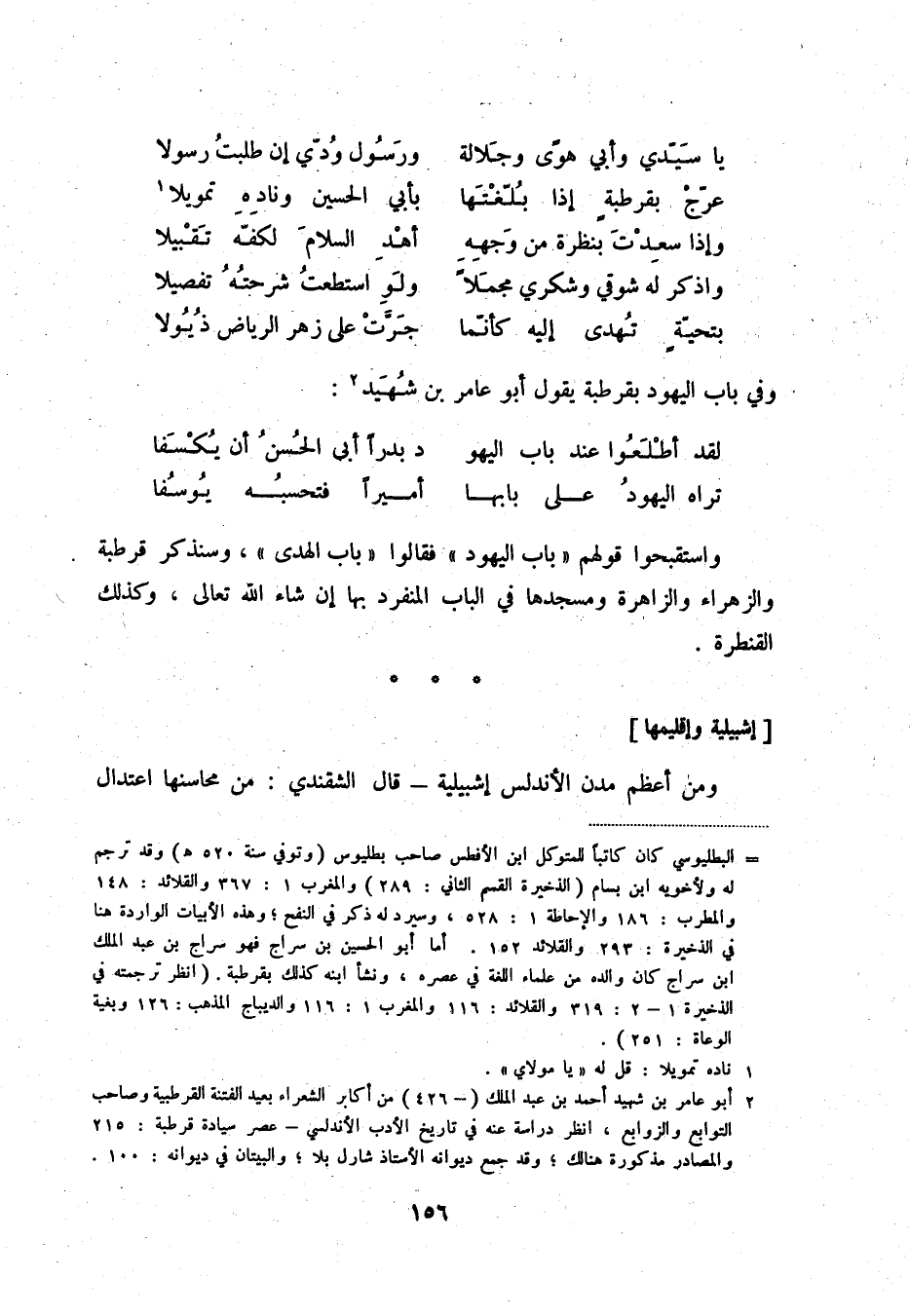 (2) أبو عامر بن شهيد أحمد بن عبد الملك (- 426) من أكابر الشعراء بعيد الفتنة القرطبية وصاحب التوابع والزوابع، انظر دراسة عنه في تاريخ الأدب الأندلسي - عصر سيادة قرطبة: 215 والمصادر مذكورة هنالك؛ وقد جمع ديوانه الأستاذ شارل بلا؛ والبيتان في ديوانه: 100.