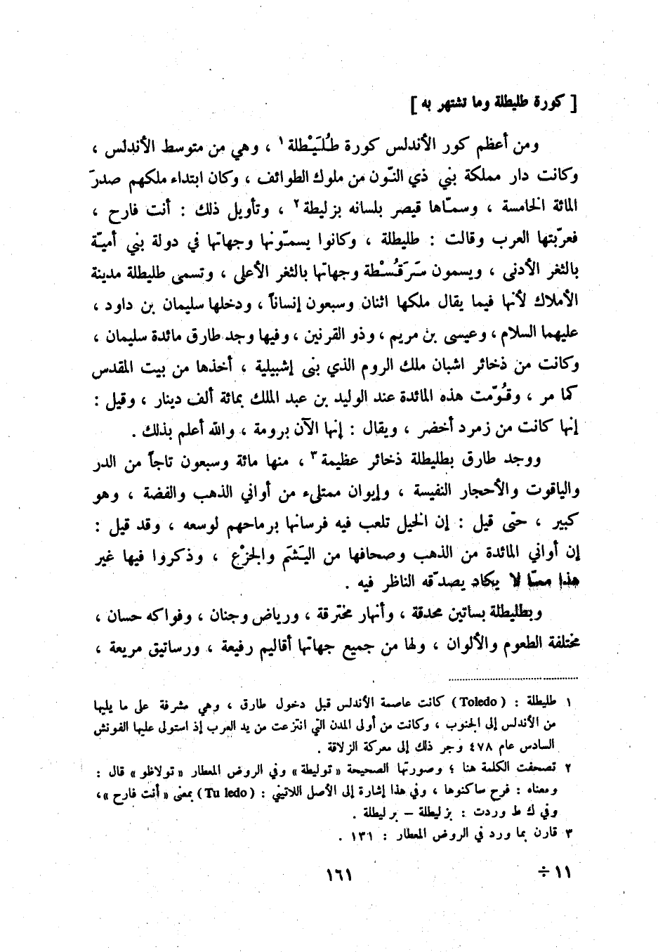 (2) تصحفت الكلمة هنا؛ وصورتها الصحيحة " توليطة " وفي الروض المعطار " تولاظو " قال: ومعناه: فرح ساكنوها، وفي هذا غشارة إلى الأصل اللاتيني: (Tu ledo) بمعنى " أنت فارح "، وفي ك ط وردت: بزليطلة - برليطلة.