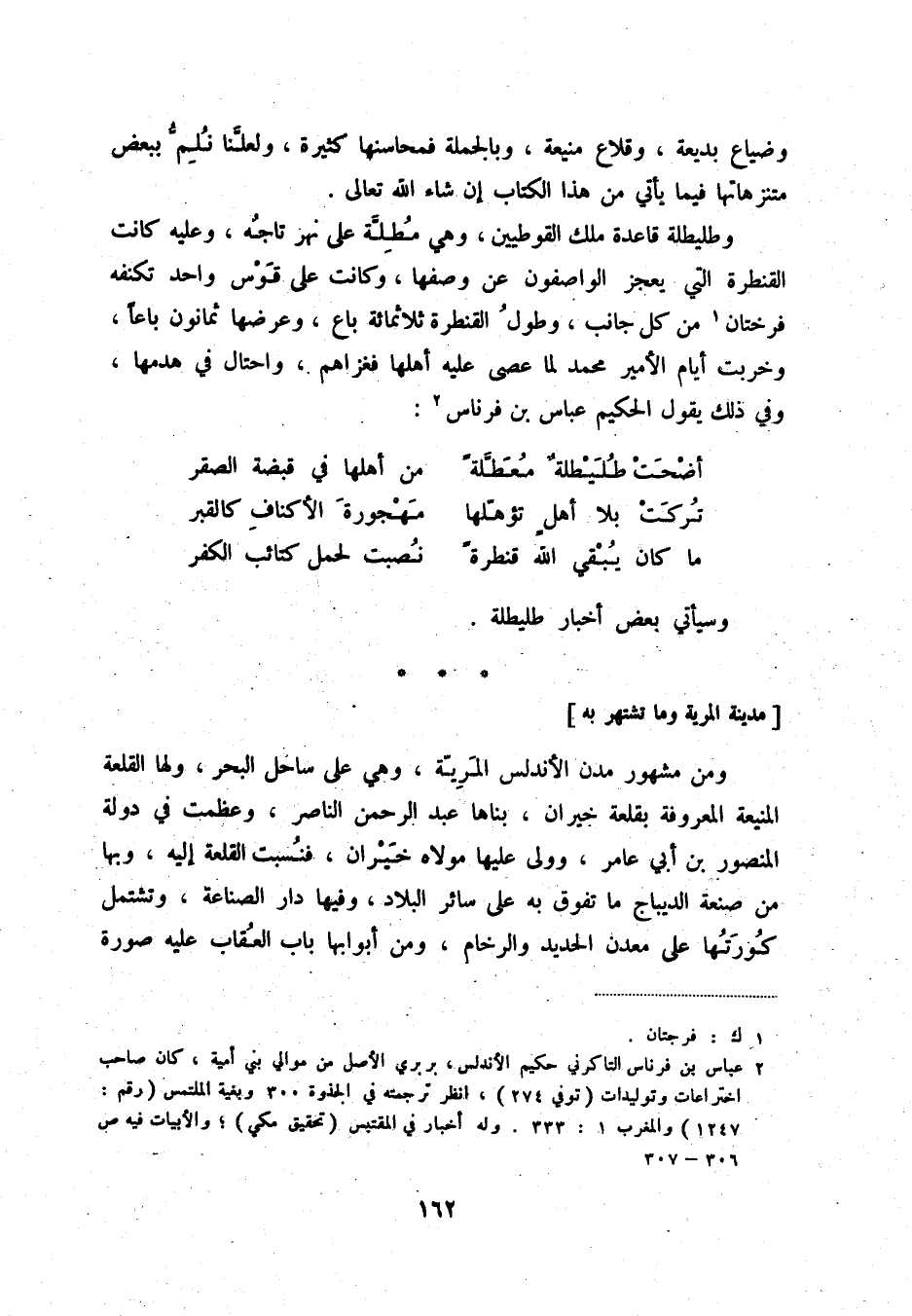 وطليطلة قاعدة ملك القوطيين، وهي مطلّة على نهر تاجه، وعليه كانت القنطرة التي يعجز الواصفون عن وصفها، وكانت على قوس واحد تكنفه فرختان (1) من كل جانب، وطول القنطرة ثلاثمائة باع، وعرضها ثمانون باعاً، وخربت أيام الأمير محمد لما عصى عليه أهلها فغزاهم، واحتال في هدمها، وفي ذلك يقول الحكيم عباس بن فرناس (2) :