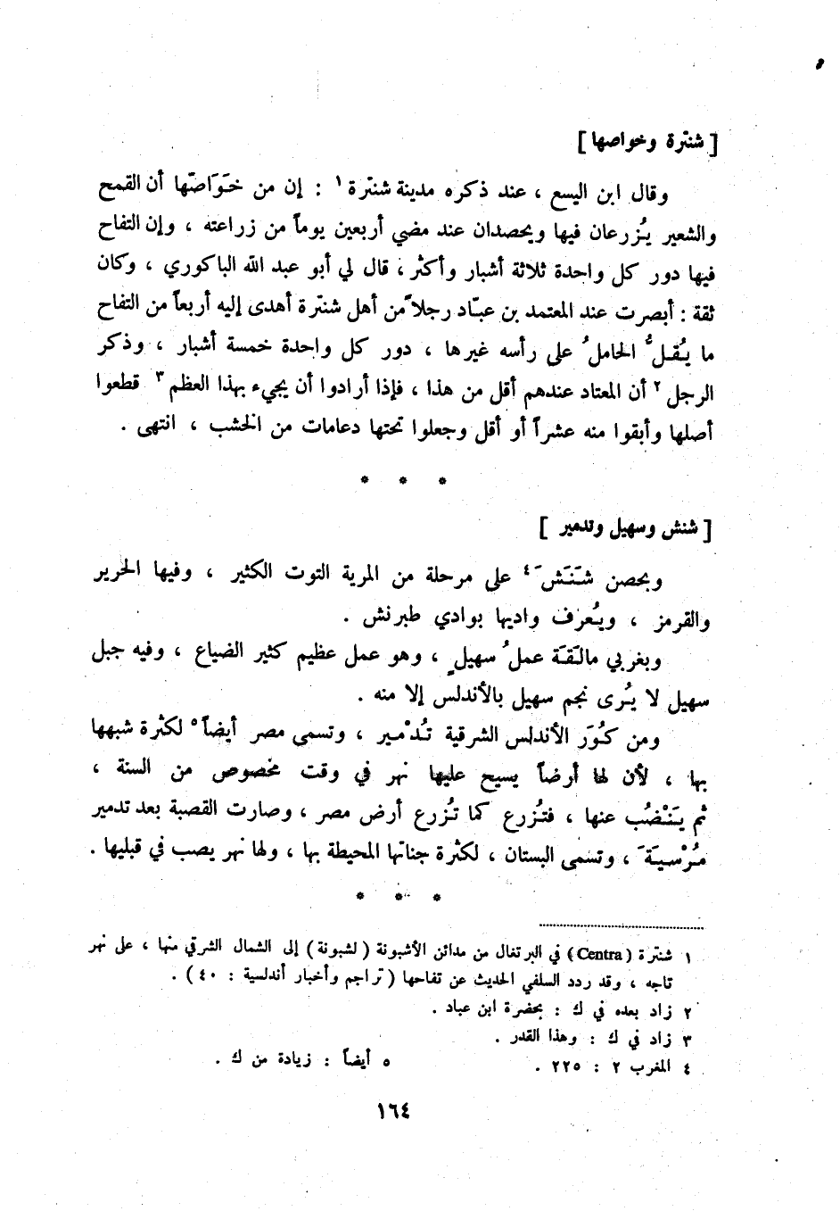وقال ابن اليسع، عند ذكره مدينة شنترة (1) : إن من خواصّها أن القمح والشعير يزرعان فيها ويحصدان عند مضي أربعين يوماً من زراعته، وإن التفاح فيها دور كل واحدة ثلاثة أشبار وأكثر، قال لي أبو عبد الله الباكوري، وكان ثقة: أبصرت عند المعتمد بن عبّاد رجلاً من أهل شنترة أهدى إليه أربعاً من التفاح ما يقلّ الحامل على رأسه غيرها، دور كل واحدة خمسة أشبار، وذكر الرجل (2) أن المعتاد عندهم أقل من هذا، فإذا أرادوا أن يجيء بهذا العظم (3) قطعوا أصلها وأبقوا منه عشراً أو أقل وجعلوا تحتها دعامات من الخشب، انتهى.