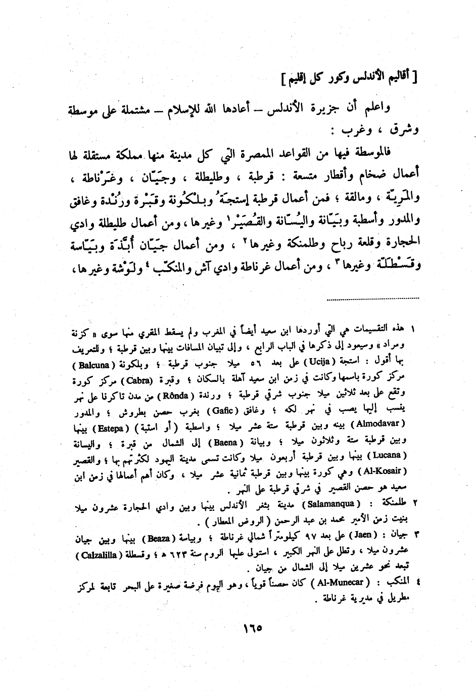 (1) هذه التقسيمات هي التي أوردها ابن سعيد أيضاً في المغرب ولم يسقط المقري منها سوى " كزنة ومراد " وسيعود إلى ذكرها في الباب الرابع، وإلى تبيان المسافات بينها وبين قرطبة؛ وللتعريف بها أقول: استجة (Ucija) على بعد 56 ميلا جنوب قرطبة؛ وبلكونة (Balcuna) مركز كورة باسمها وكانت في زمن ابن سعيد آهلة بالسكان؛ وقبرة (Cabra) مركز كورة وتقع على بعد ثلاثين ميلاً جنوب شرقي قرطبة؛ ورندة (Ronda) من مدن تاكرنا على نهر ينسب إليه يصب في نهر لكه؛ وغانق (Gafic) بغرب حصن بطروش؛ والمدور (Almodavar) بينه وبين قطربة ستة عشر ميلاص؛ واسطبة (أو استبة) (Estepa) بينها وبين قرطبة ستة وثلاثون ميلا؛ وبيانة (Baena) إلى الشمال من قبرة؛ واليسانة (Lucana) بينها وبين قرطبة أربعون ميلاً وكانت تسمى مدينة اليهود لكثرتهم بها؛ والقصير (Al - Kosair) وهي كورة بينها وبين قرطبة ثمانية عشر ميلاً، وكان أهم أعمالها في زمن ابن سعيد هو حصن القصير في شرقي قرطبة على النهر.