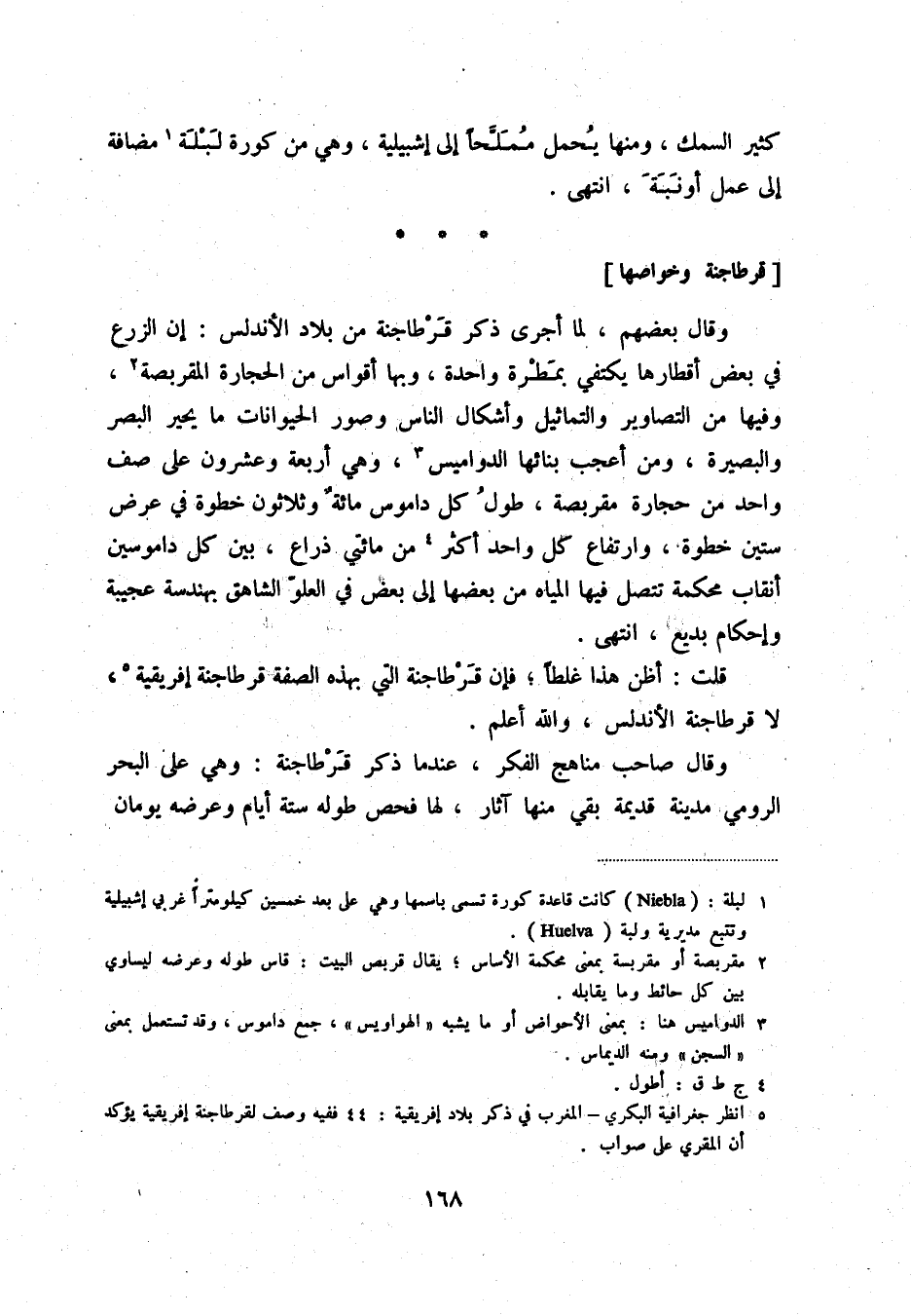 (5) انظر جغرافية البكري - المغرب في ذكر بلاد أفريقية: 44 ففيه وصف لقرطاجنة افريقية يؤكد أن المقري على صواب.